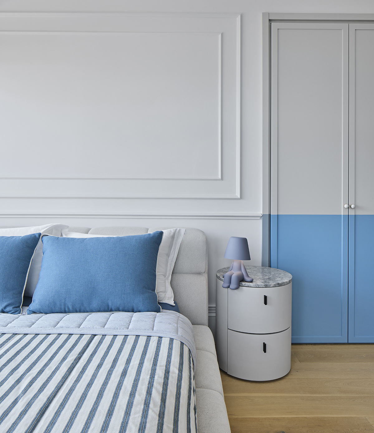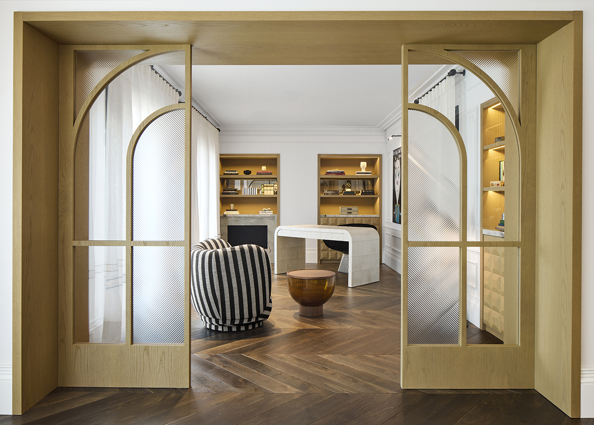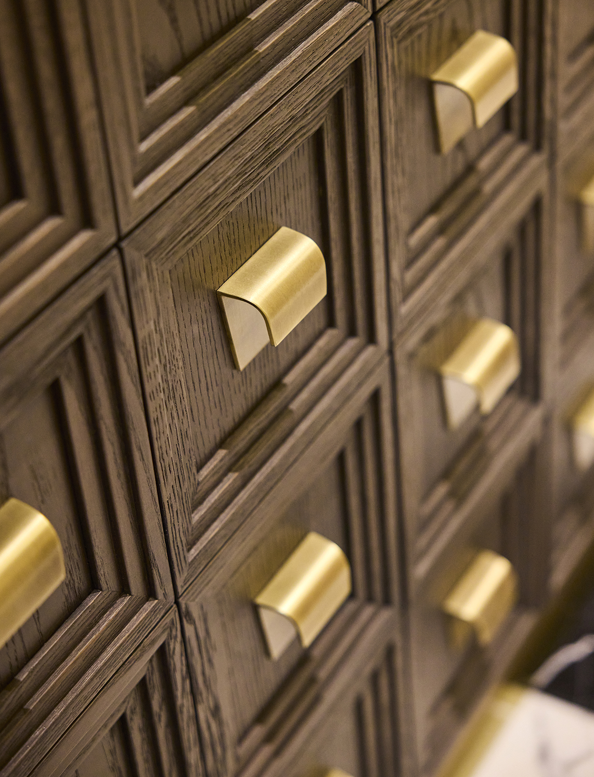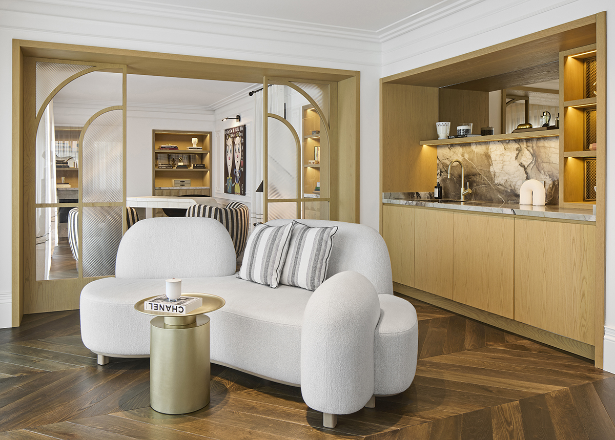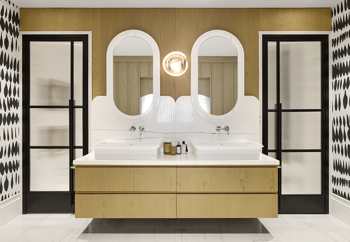 The interior language is defined by natural materials, light oak finishes, soft earth tones, and bronze mirror accents.
