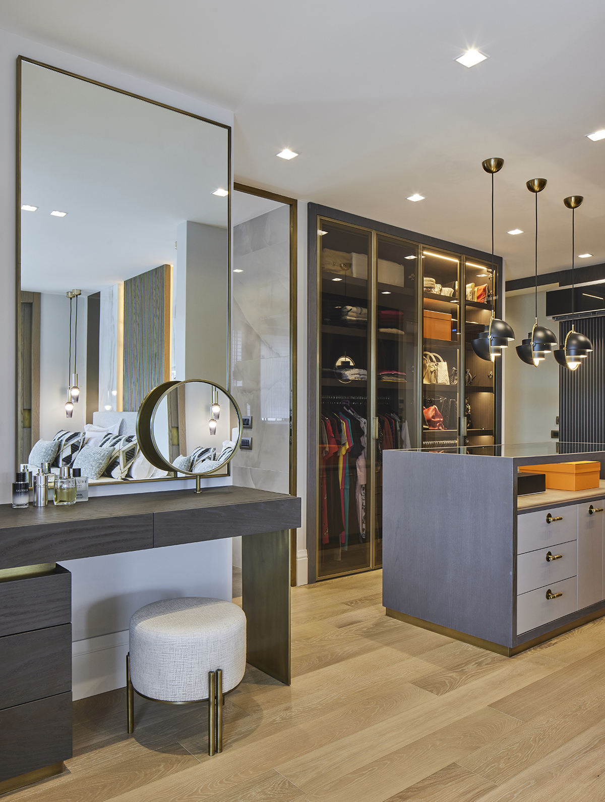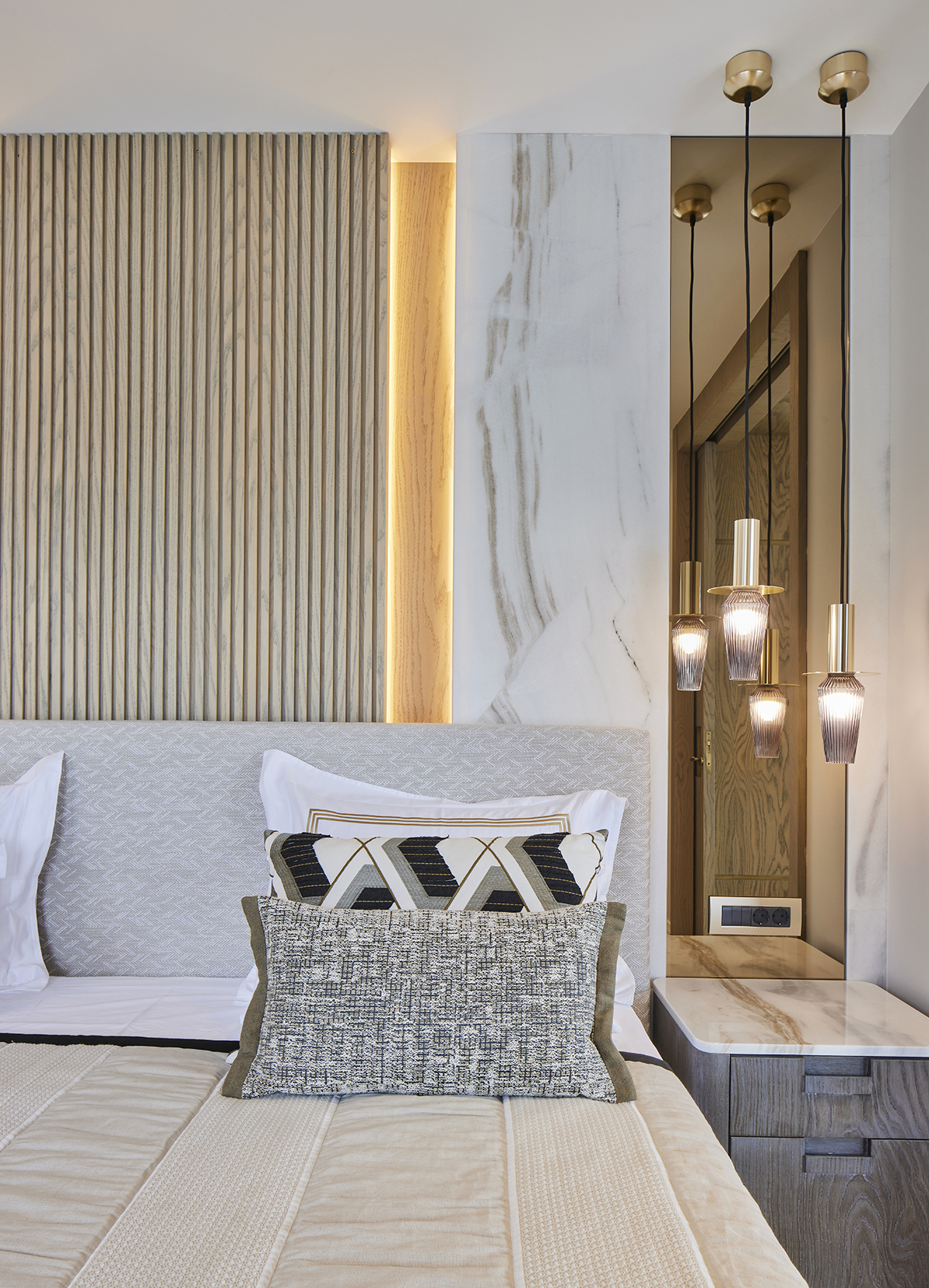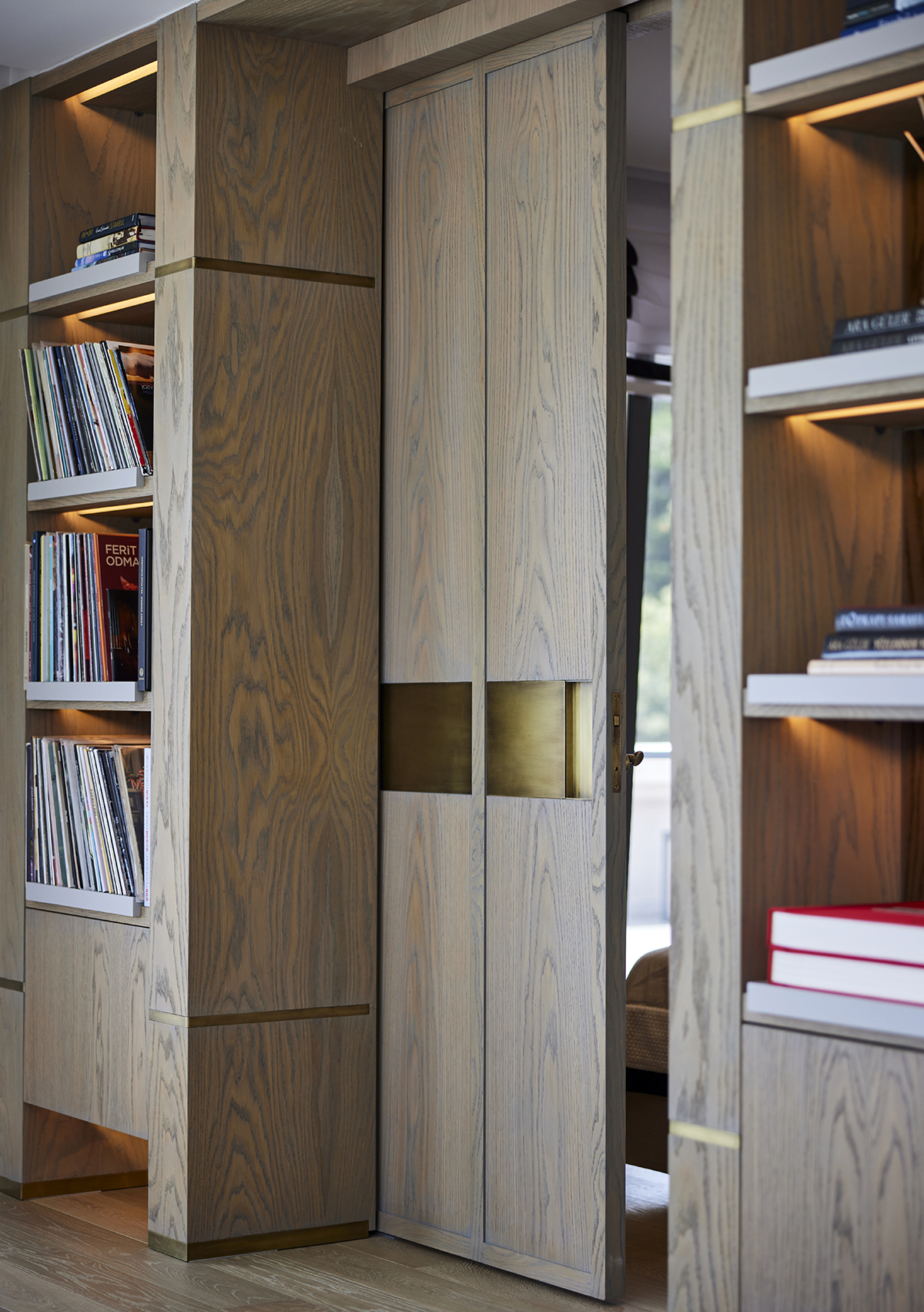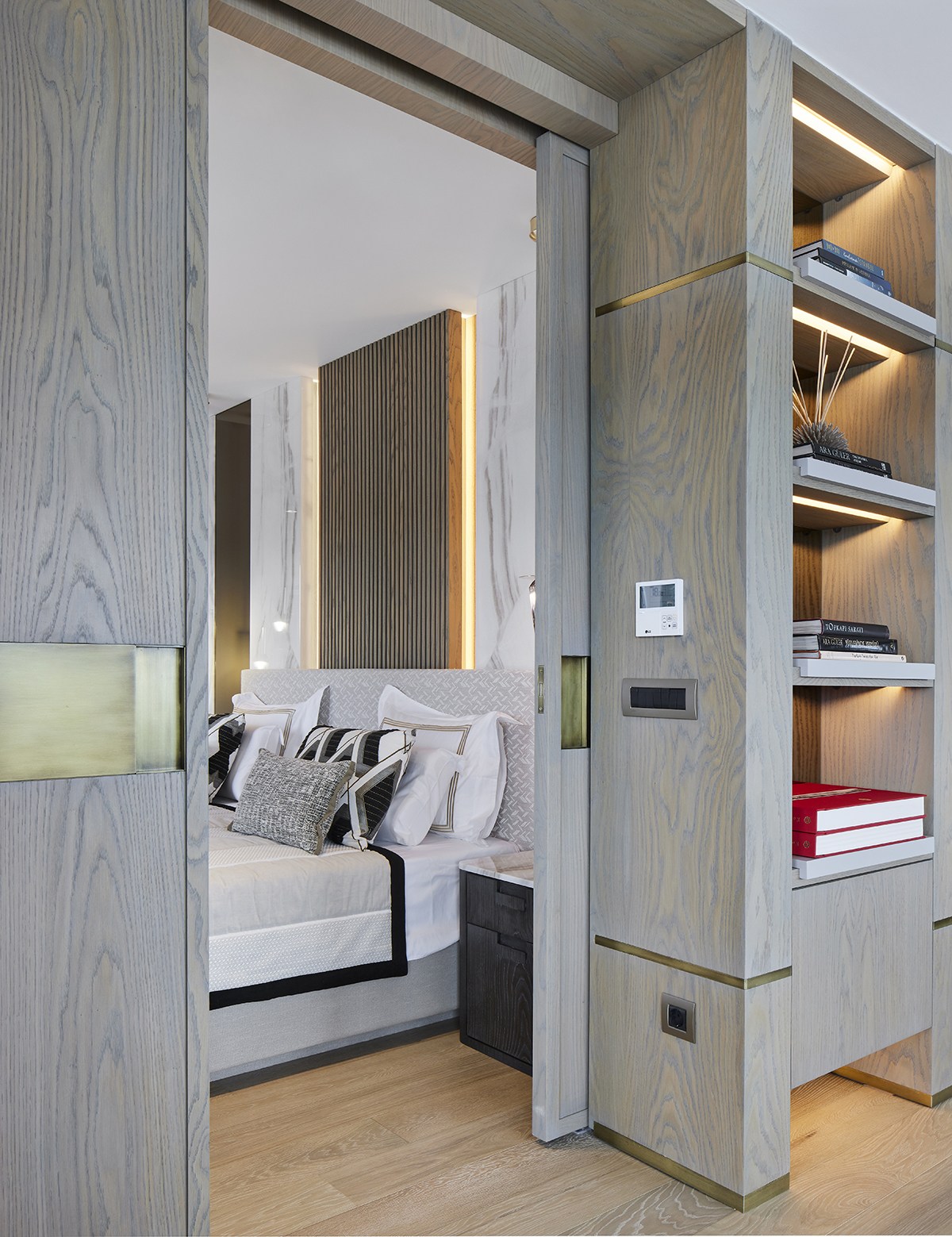 The interior language remains understated and elegant, supported by layered lighting that includes recessed square spots, wall lights accentuating wood paneling, concealed LEDs within bespoke furniture, and artwork lighting.