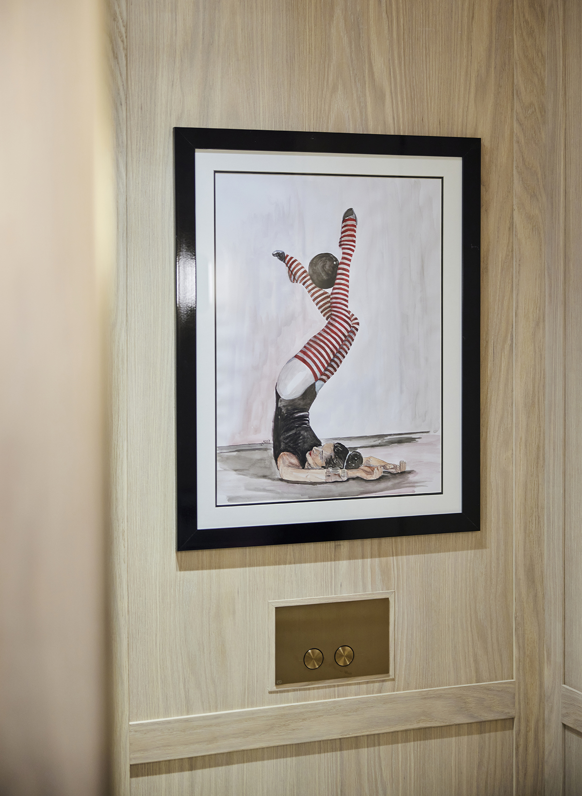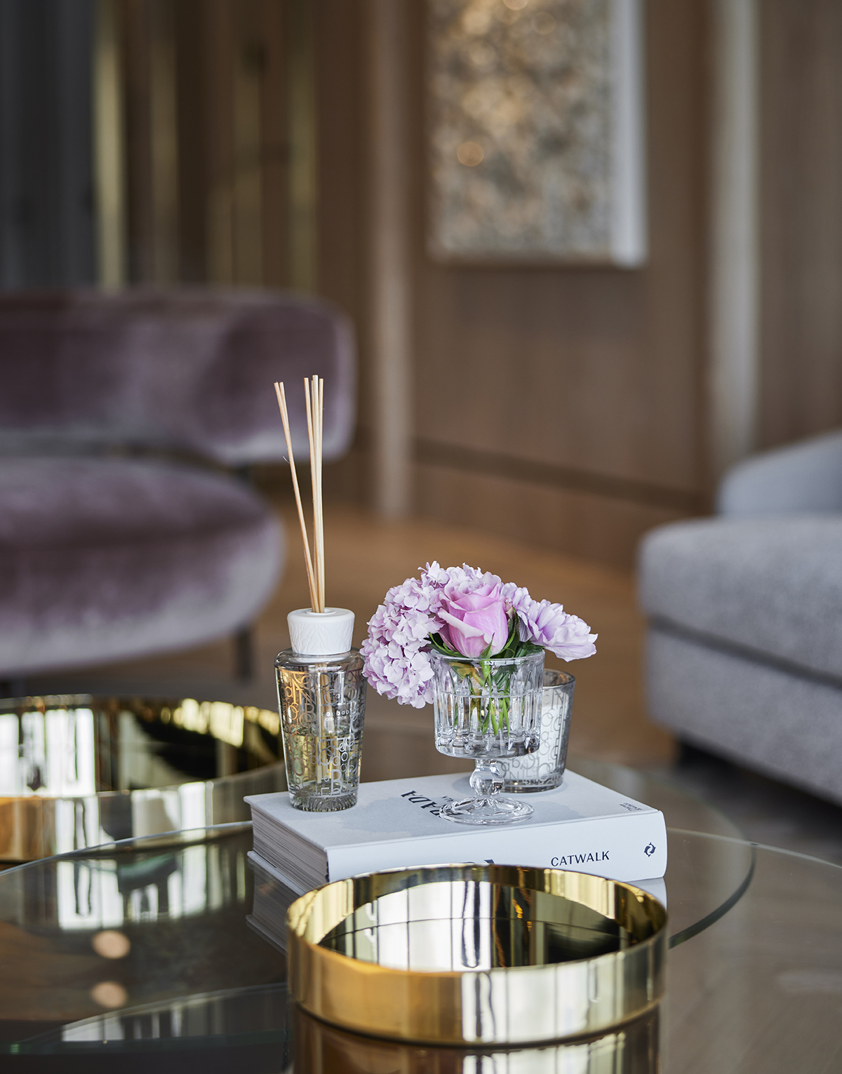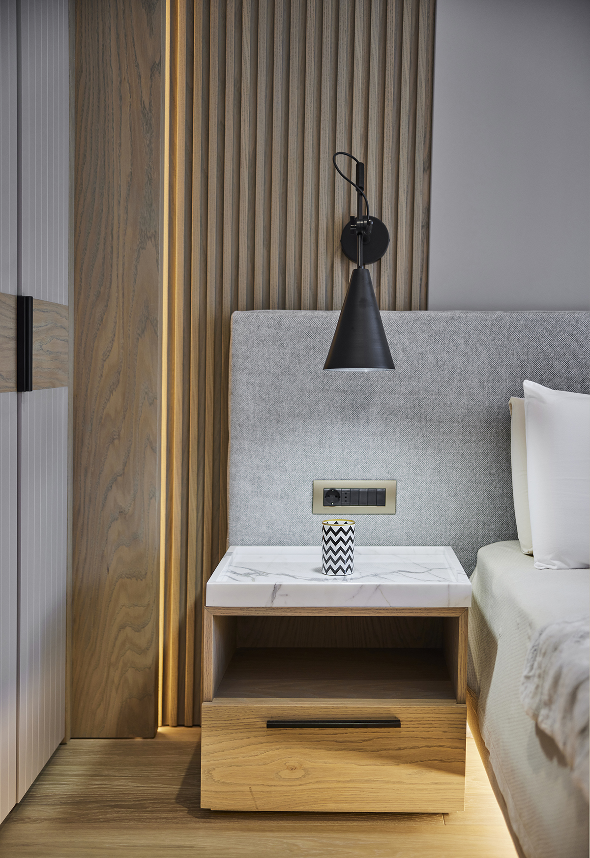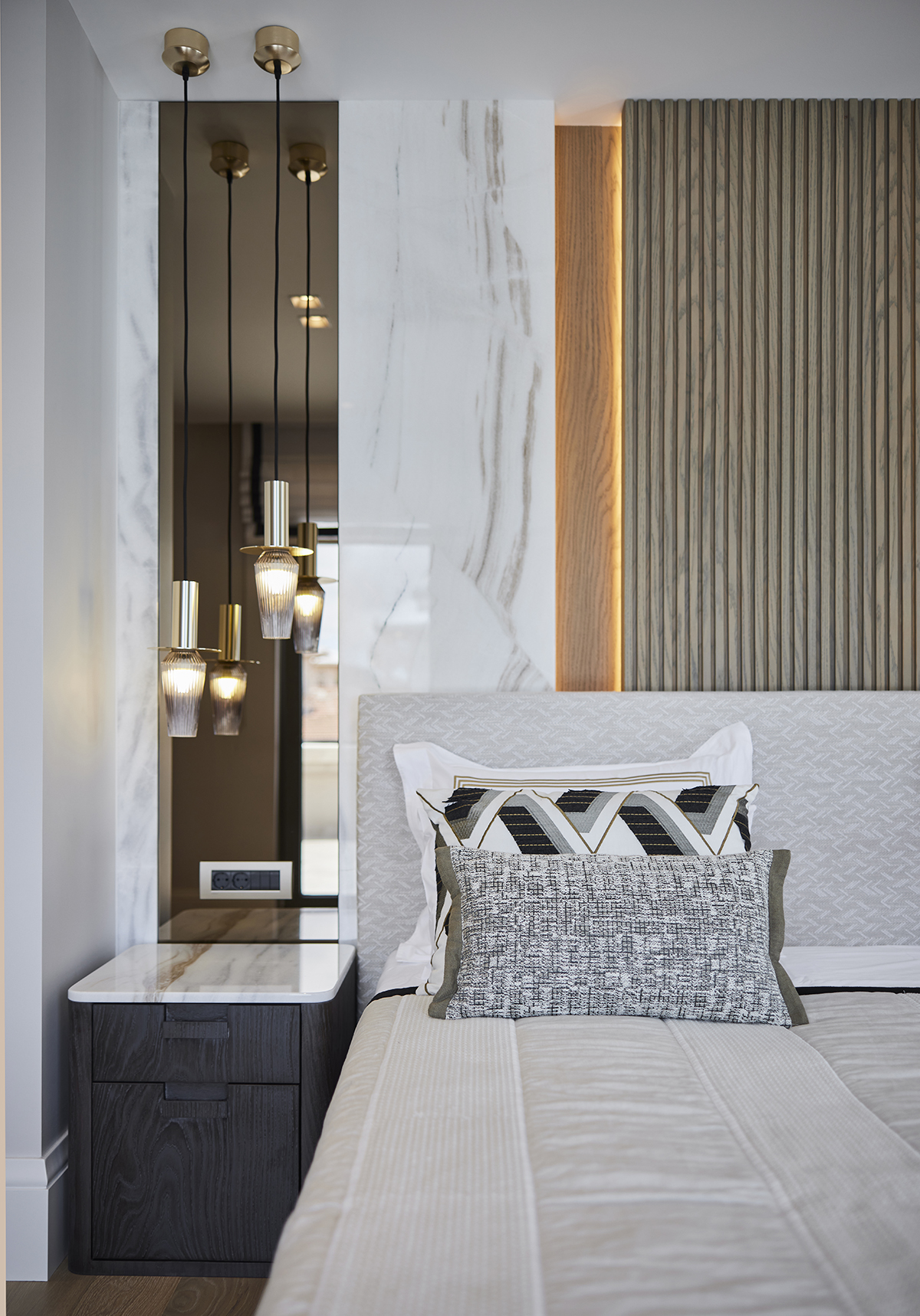 The interior language remains understated and elegant, supported by layered lighting that includes recessed square spots, wall lights accentuating wood paneling, concealed LEDs within bespoke furniture, and artwork lighting.