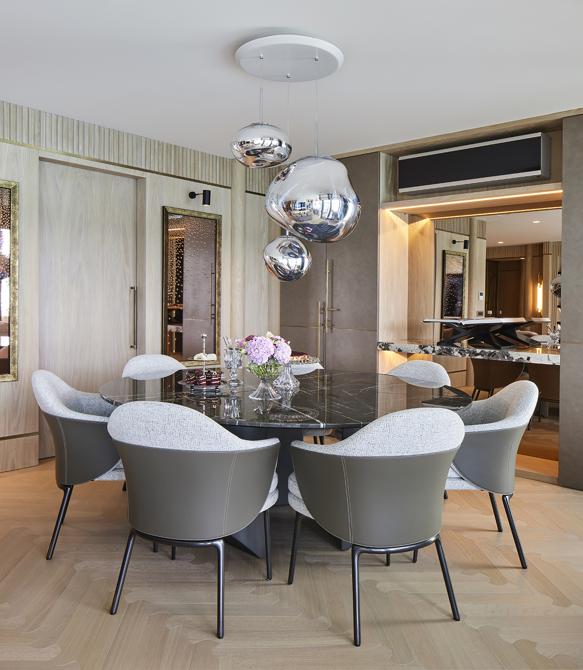 On the entrance level, the living and dining areas connect to the kitchen through a concealed sliding door, while two en suite children’s bedrooms, a guest WC, and a laundry room complete the floor.