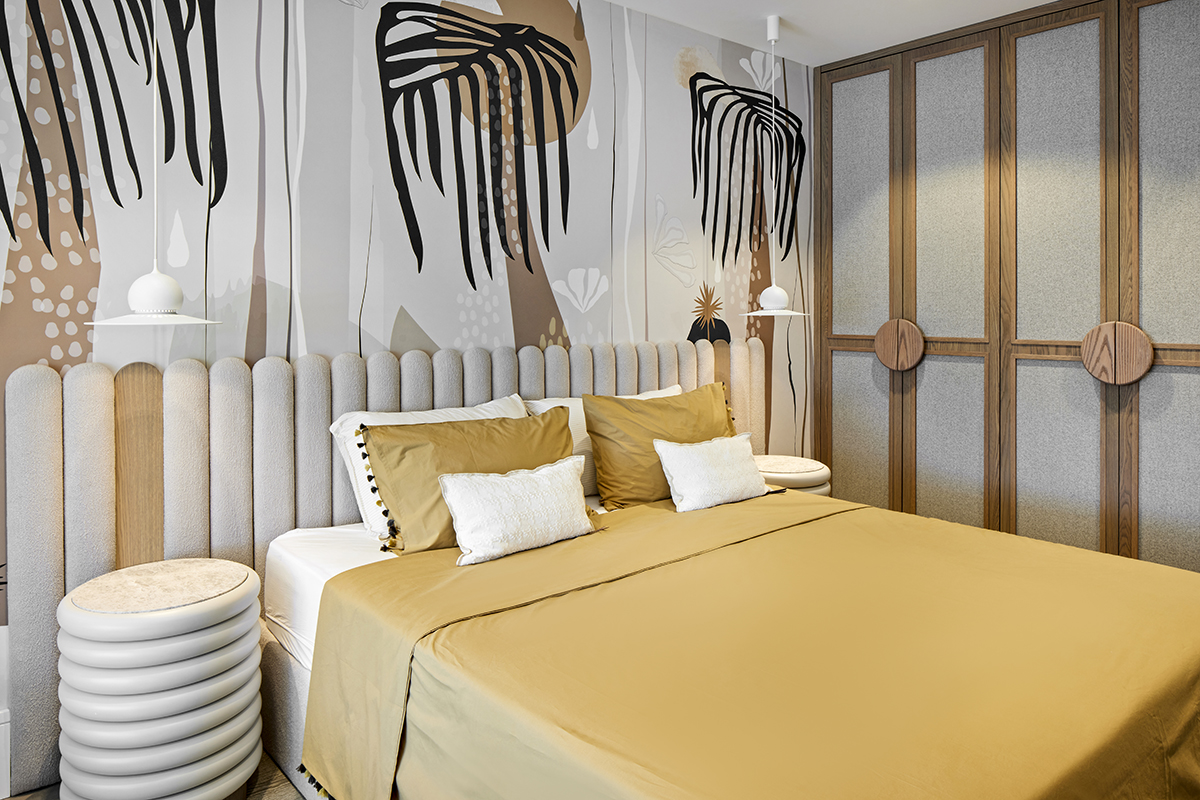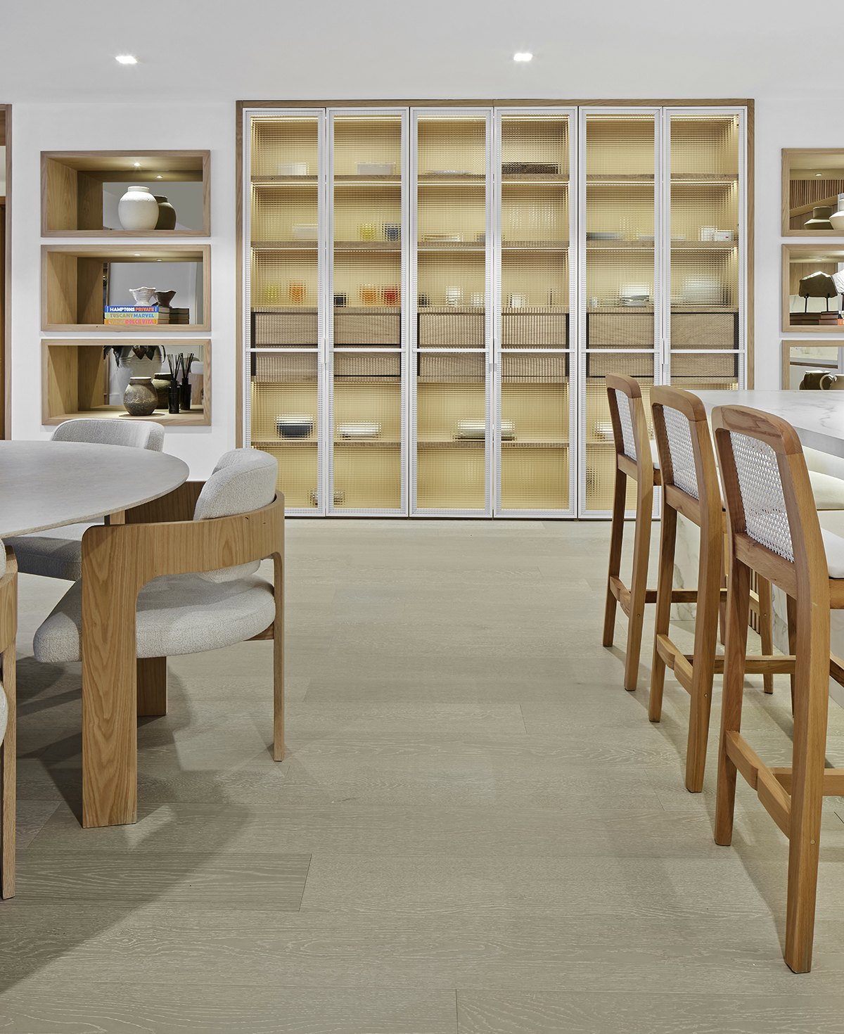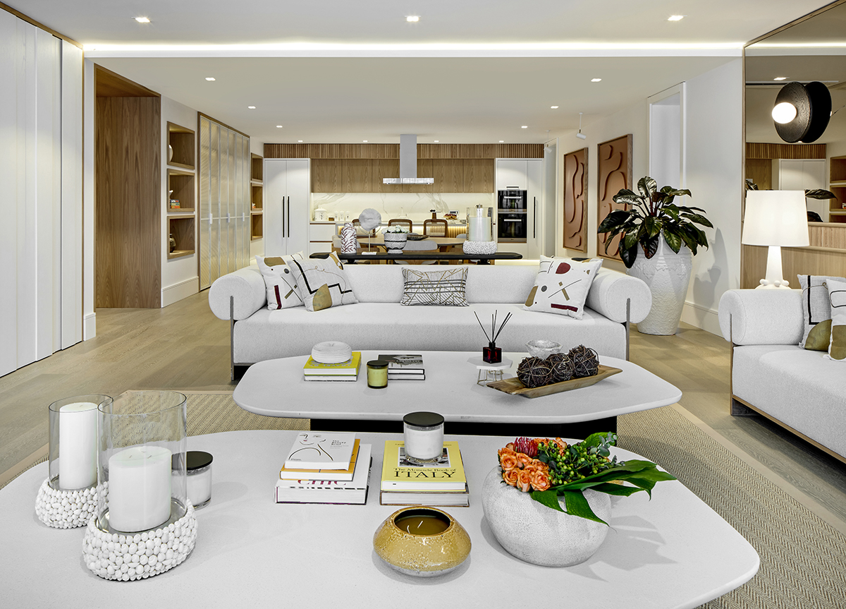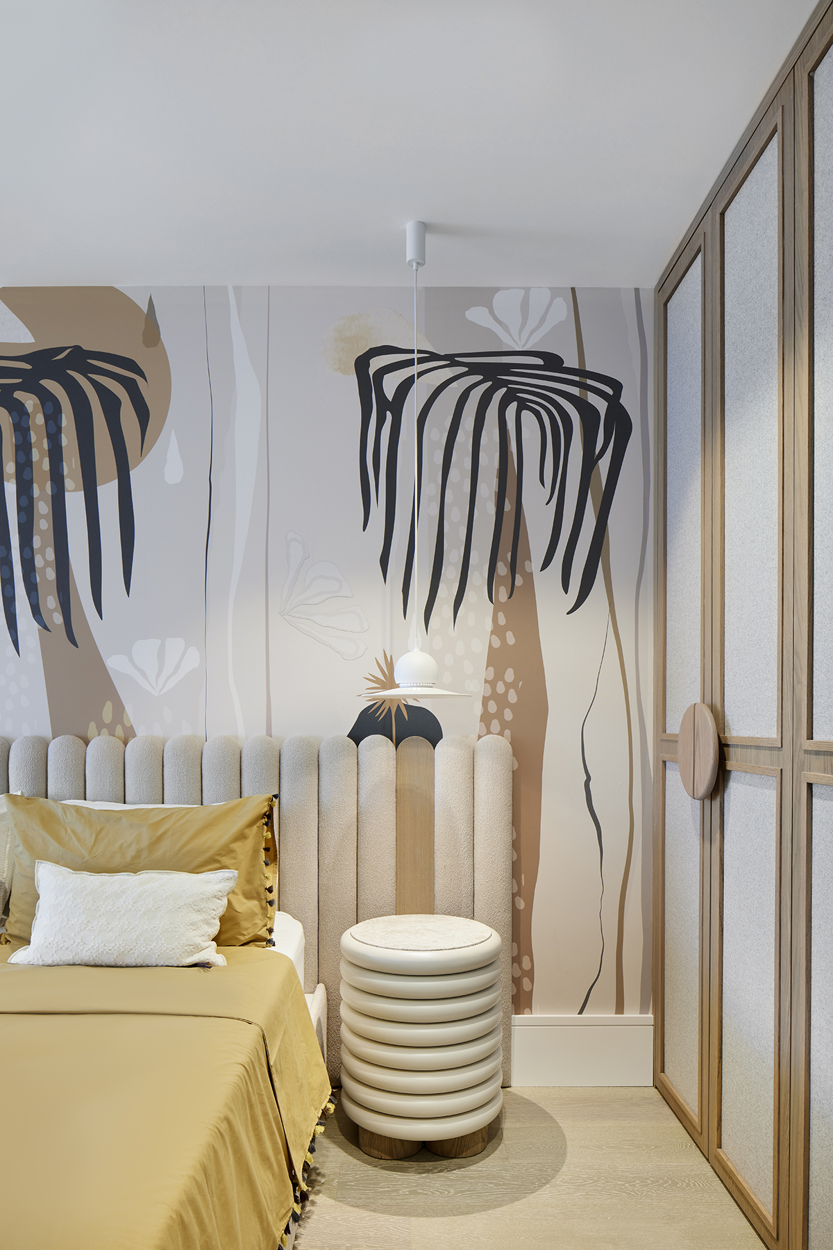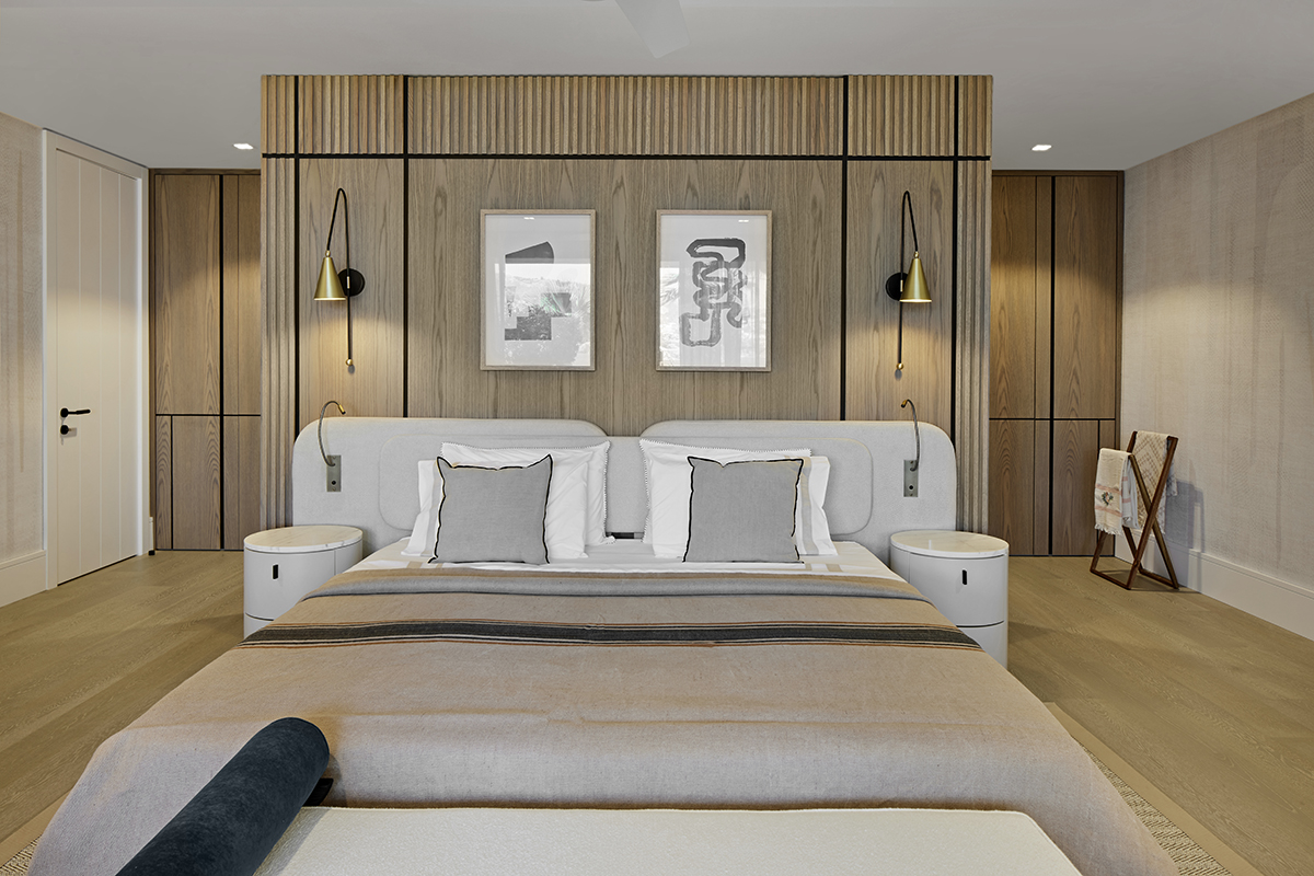 The layout includes a generous entrance hall, an open-plan living area with kitchen, a master suite with en-suite bathroom, three guest bedrooms, additional bathrooms, laundry and storage spaces, as well as a separate staff room with its own entrance.