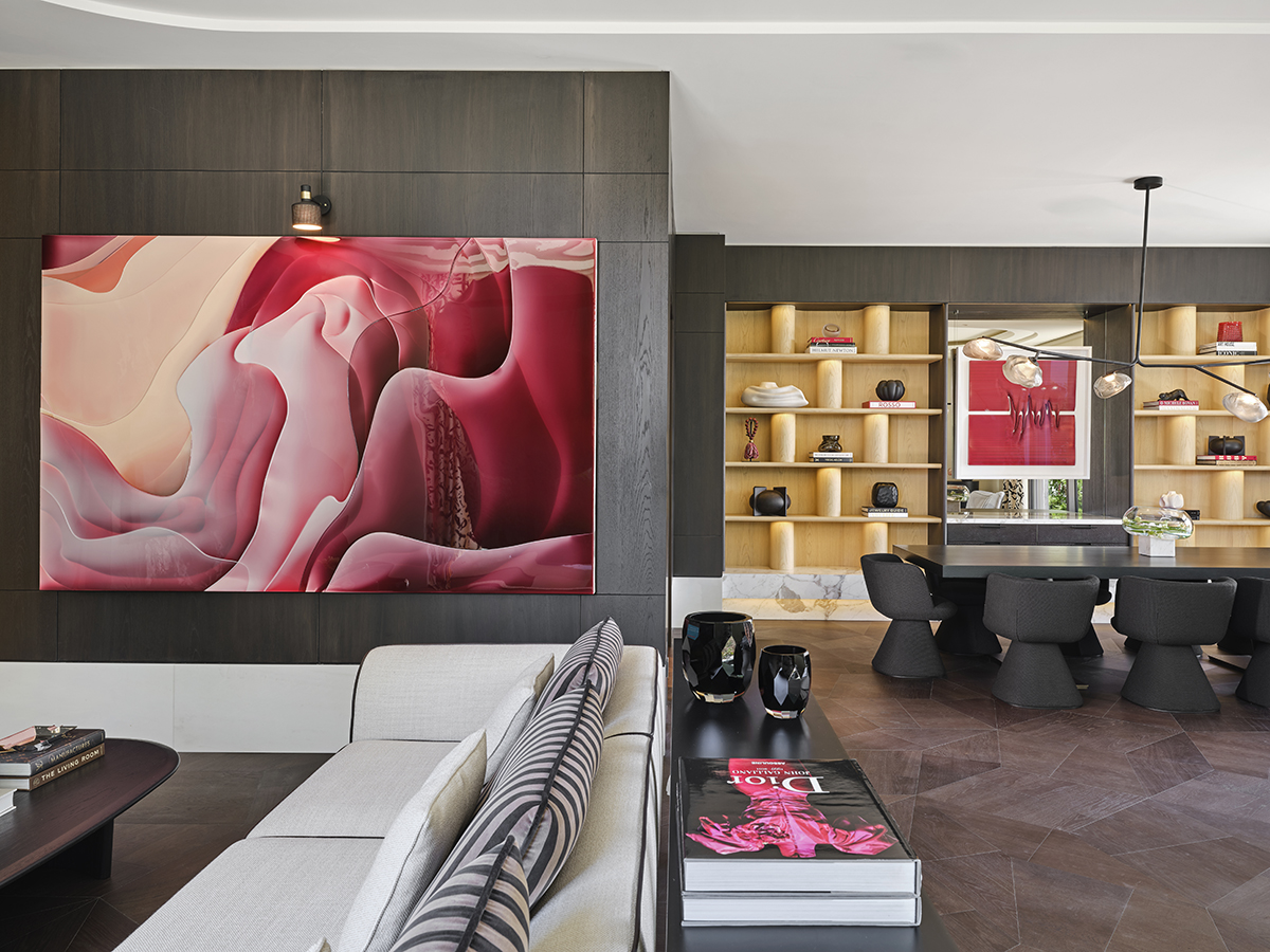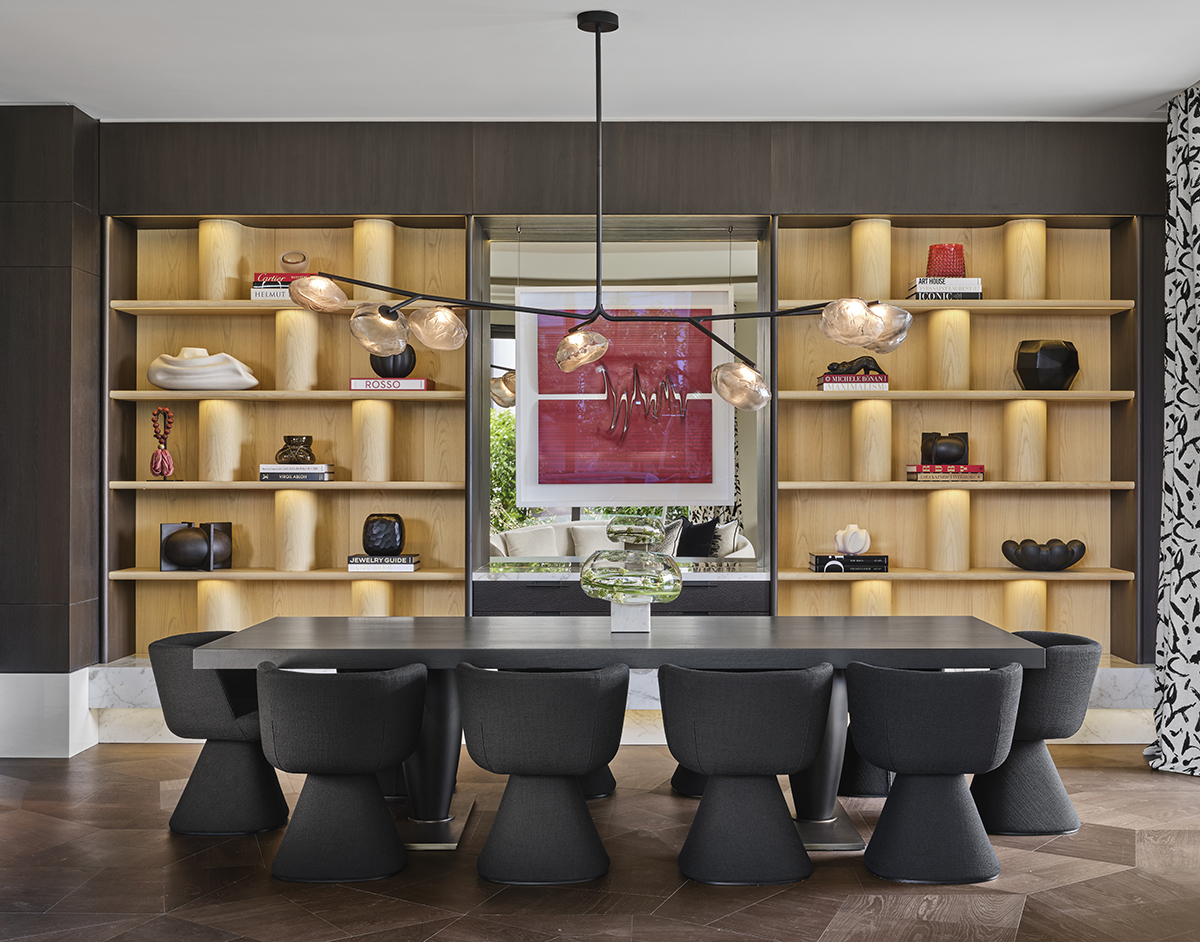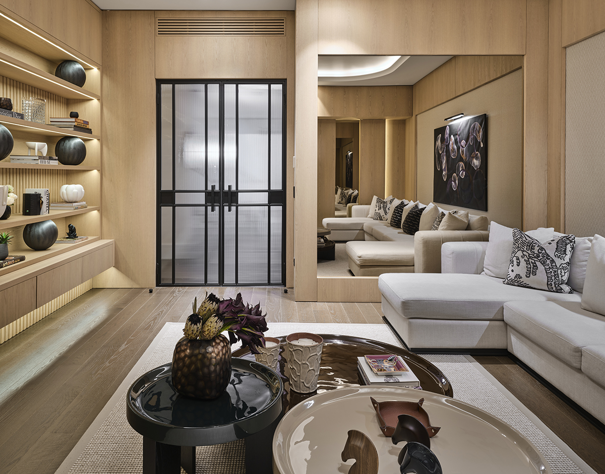Wood paneled walls add architectural depth, while layered lighting, carefully selected textiles, and balanced material choices ensure both functionality and timeless appeal.