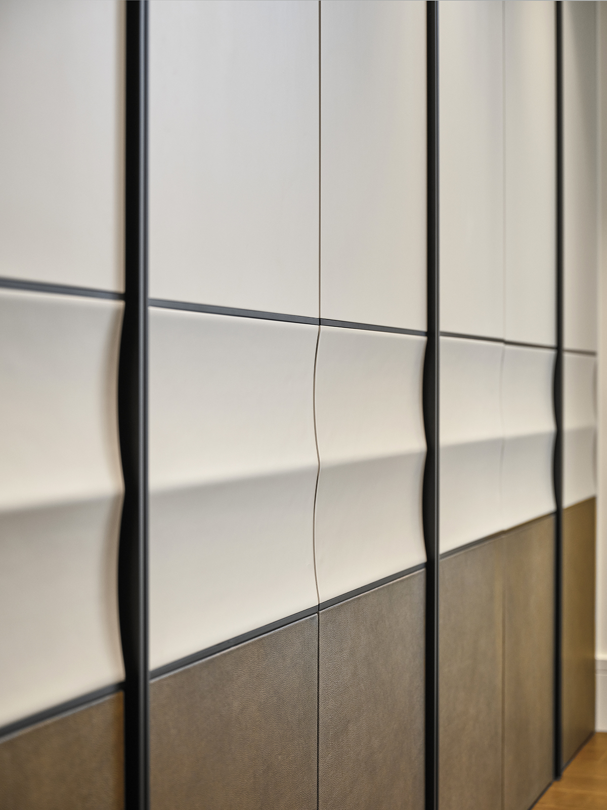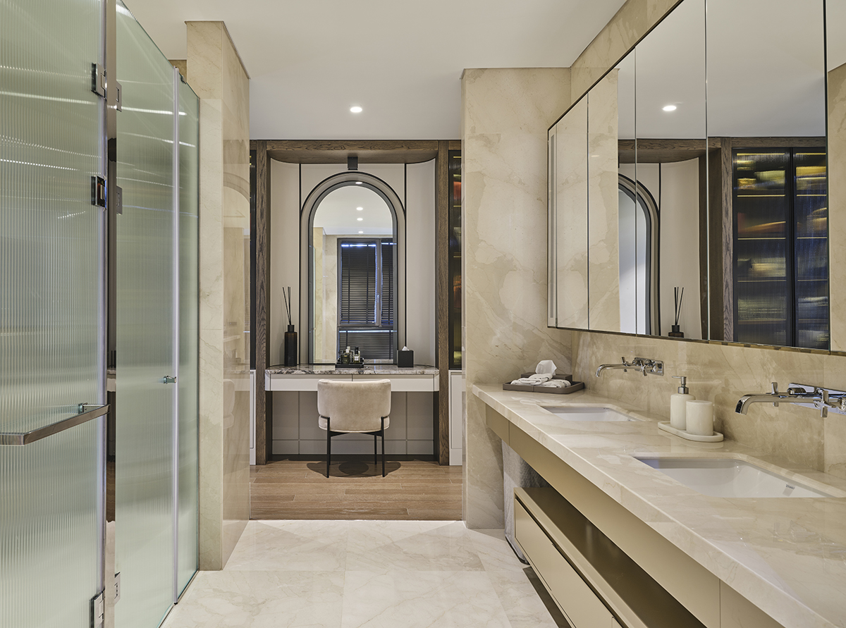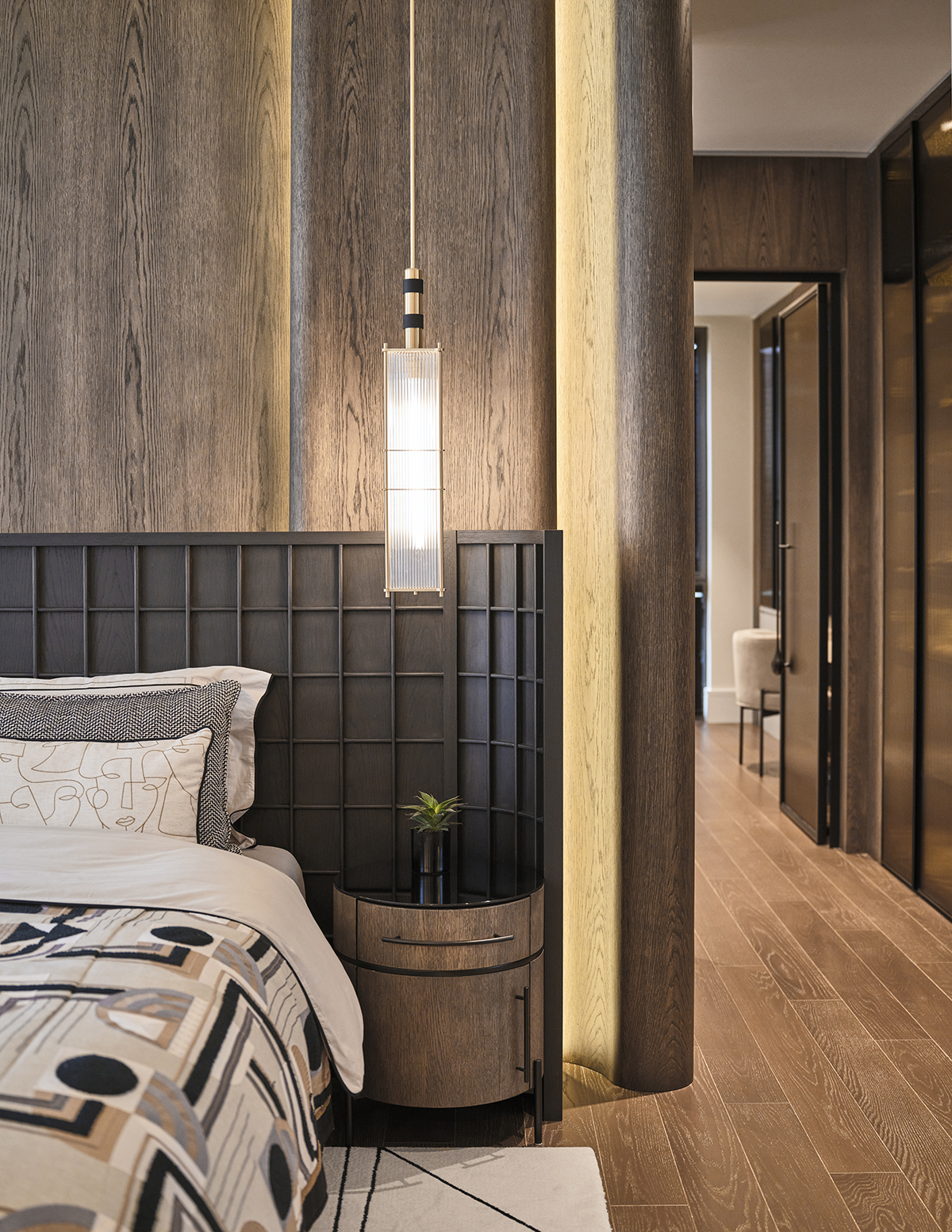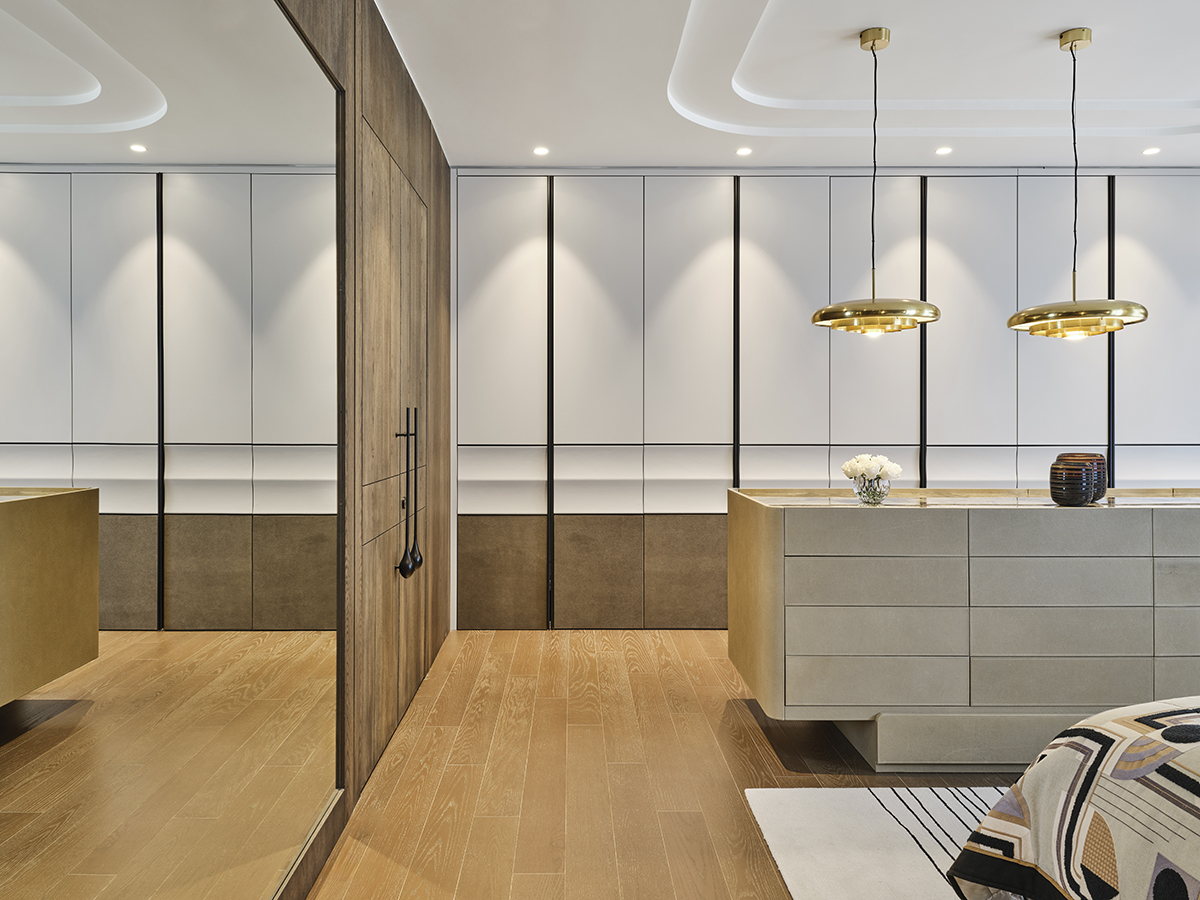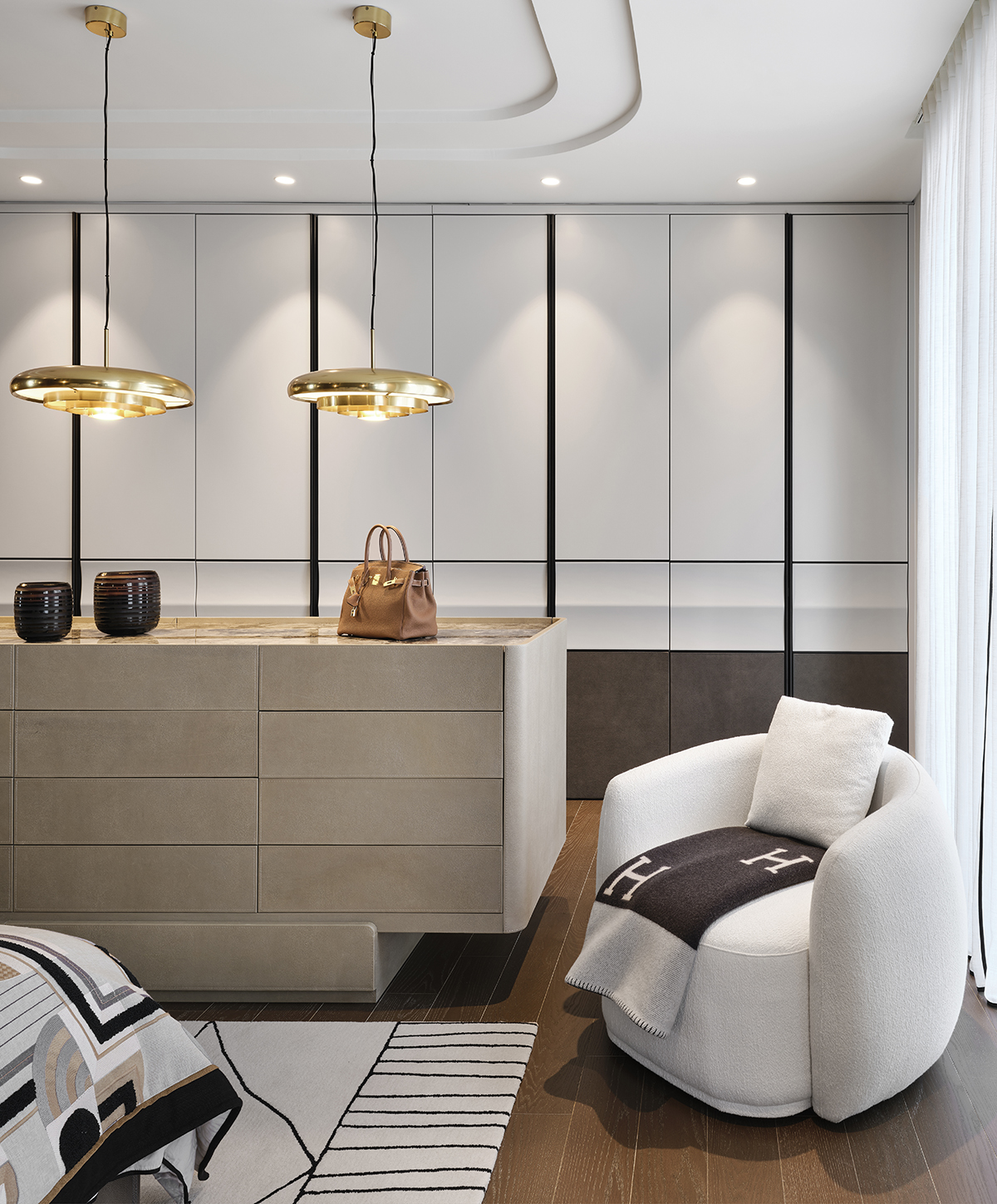 The master suite is designed as a layered space, where the sleeping area flows naturally into the dressing room and bathroom.
