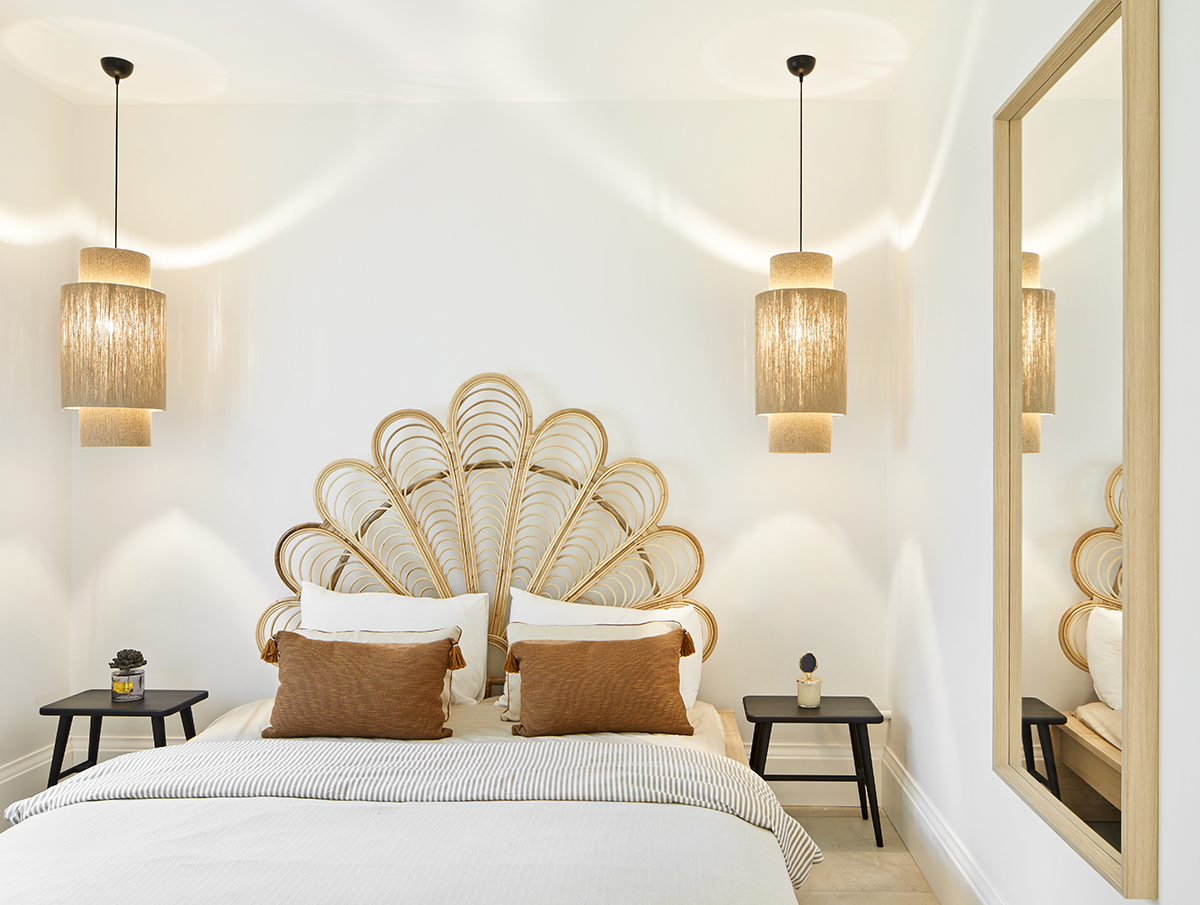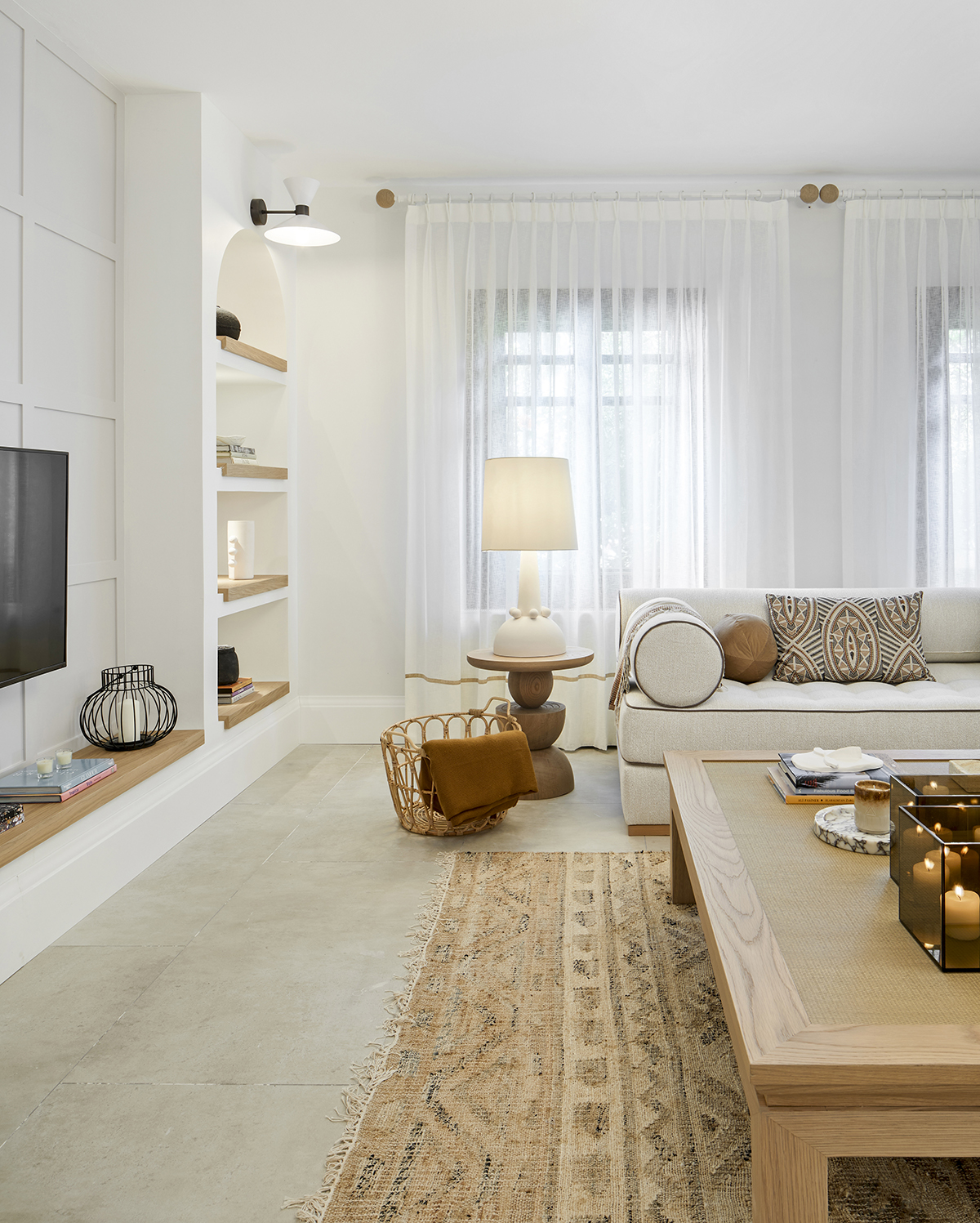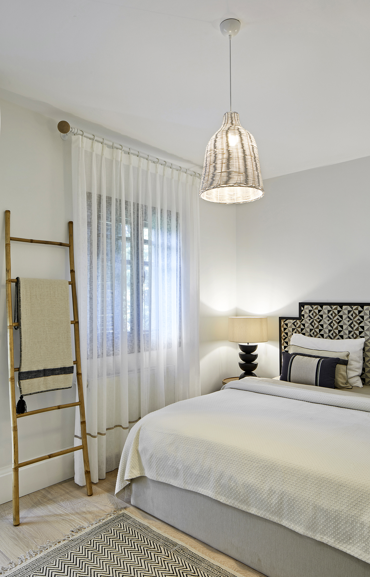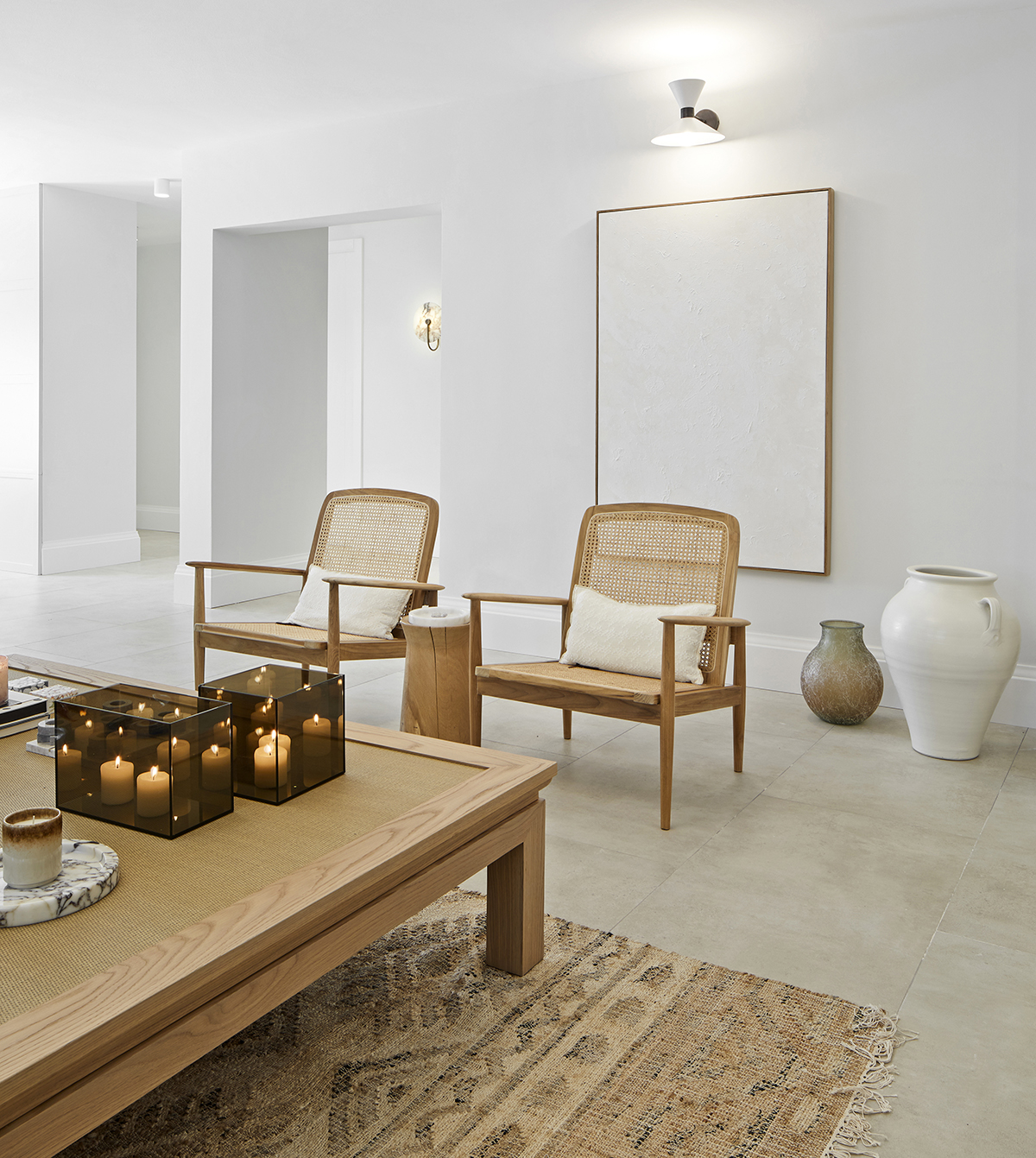 Natural materials, soft textiles, and subtle lighting choices support a relaxed atmosphere throughout the house.