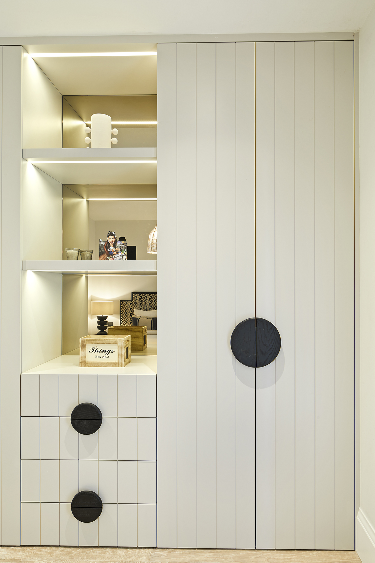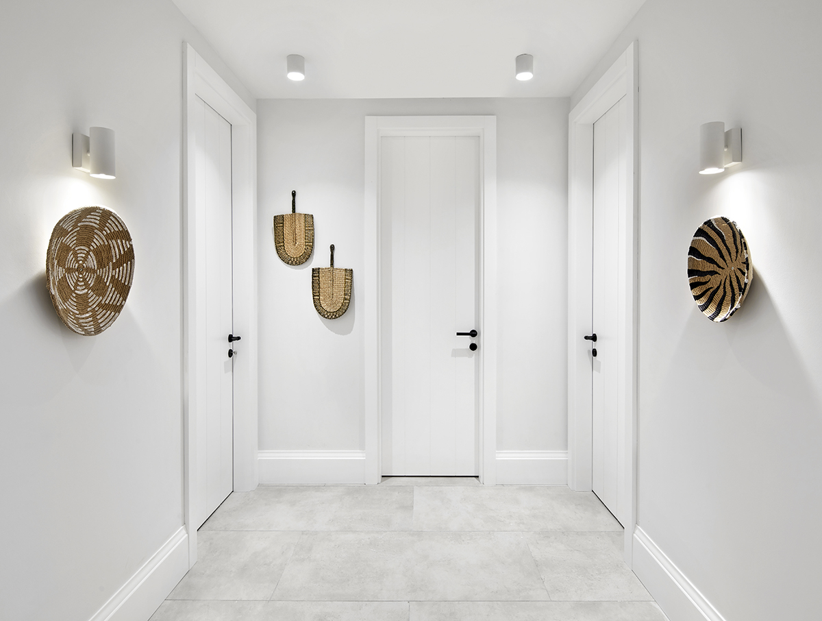 A palette of whites, light lacquers, and natural oak defines the interiors, reinforcing a sense of calm inspired by Mediterranean living.