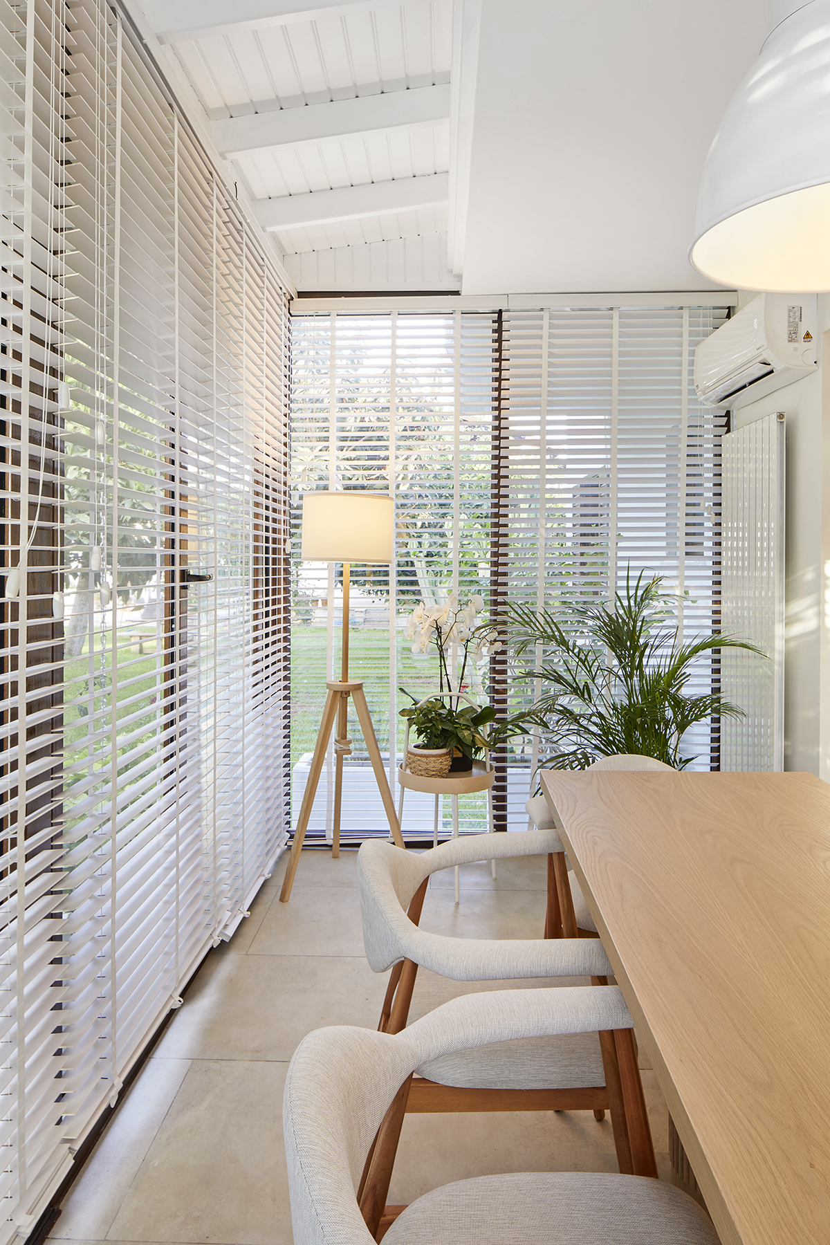 Mirrors were placed strategically to enhance openness, while shutters, linen curtains, and light-toned flooring complete the timeless interior language.