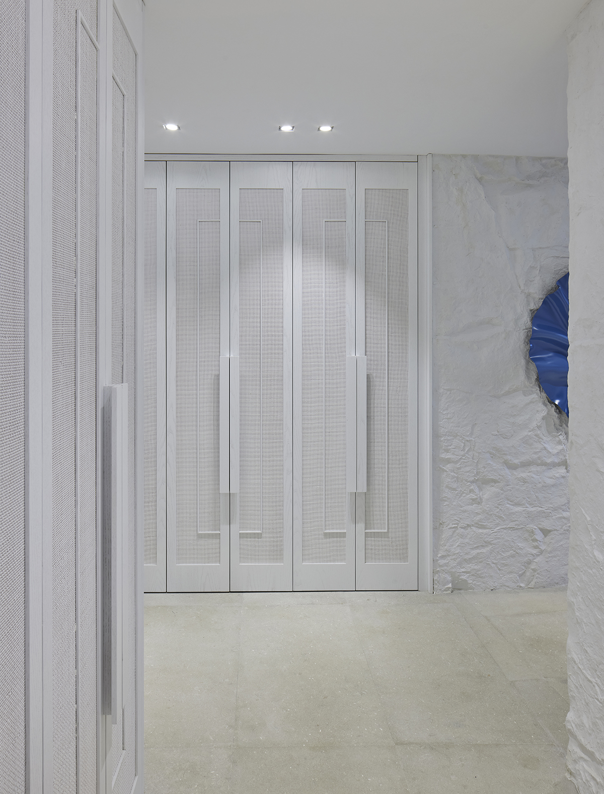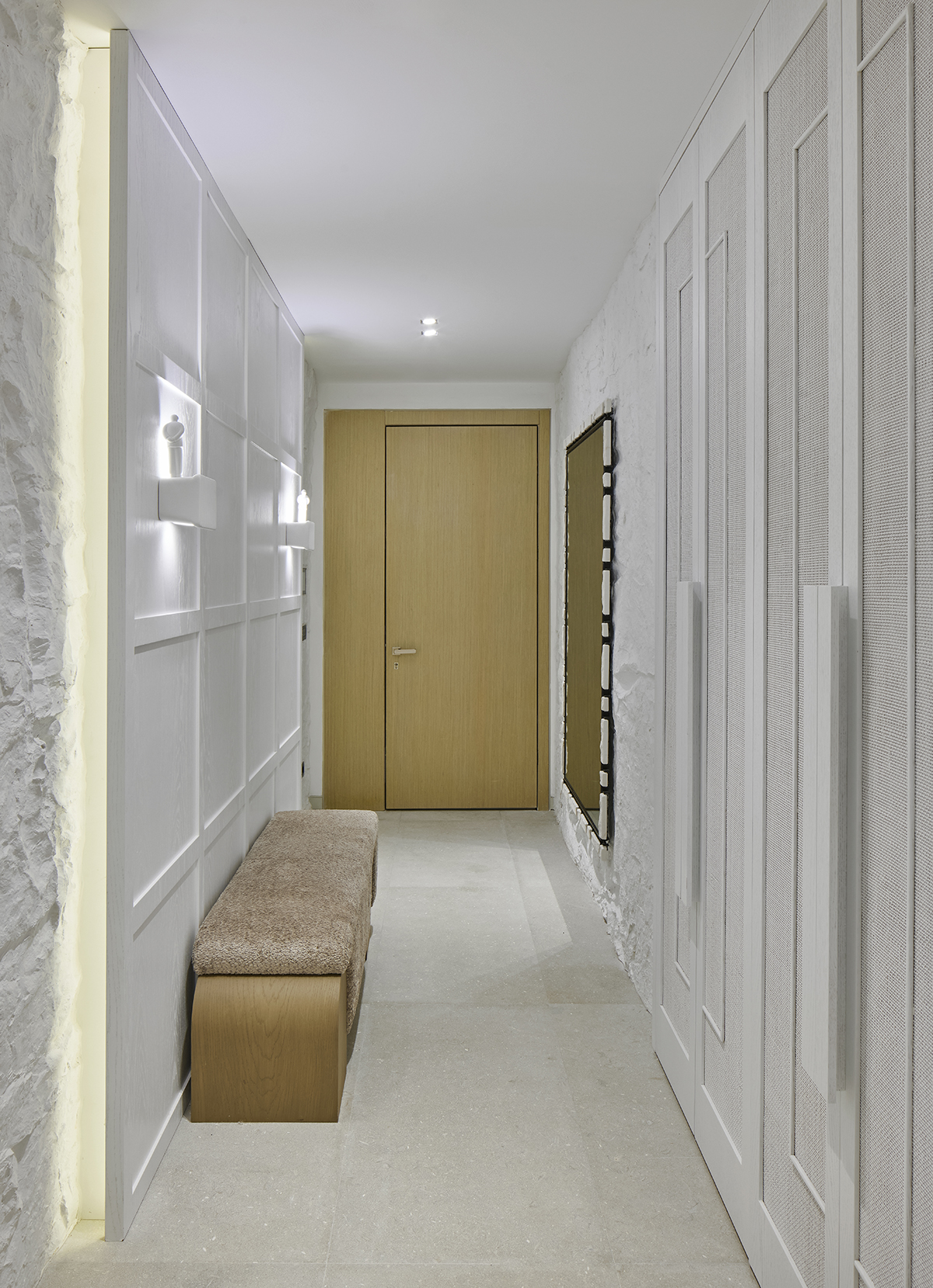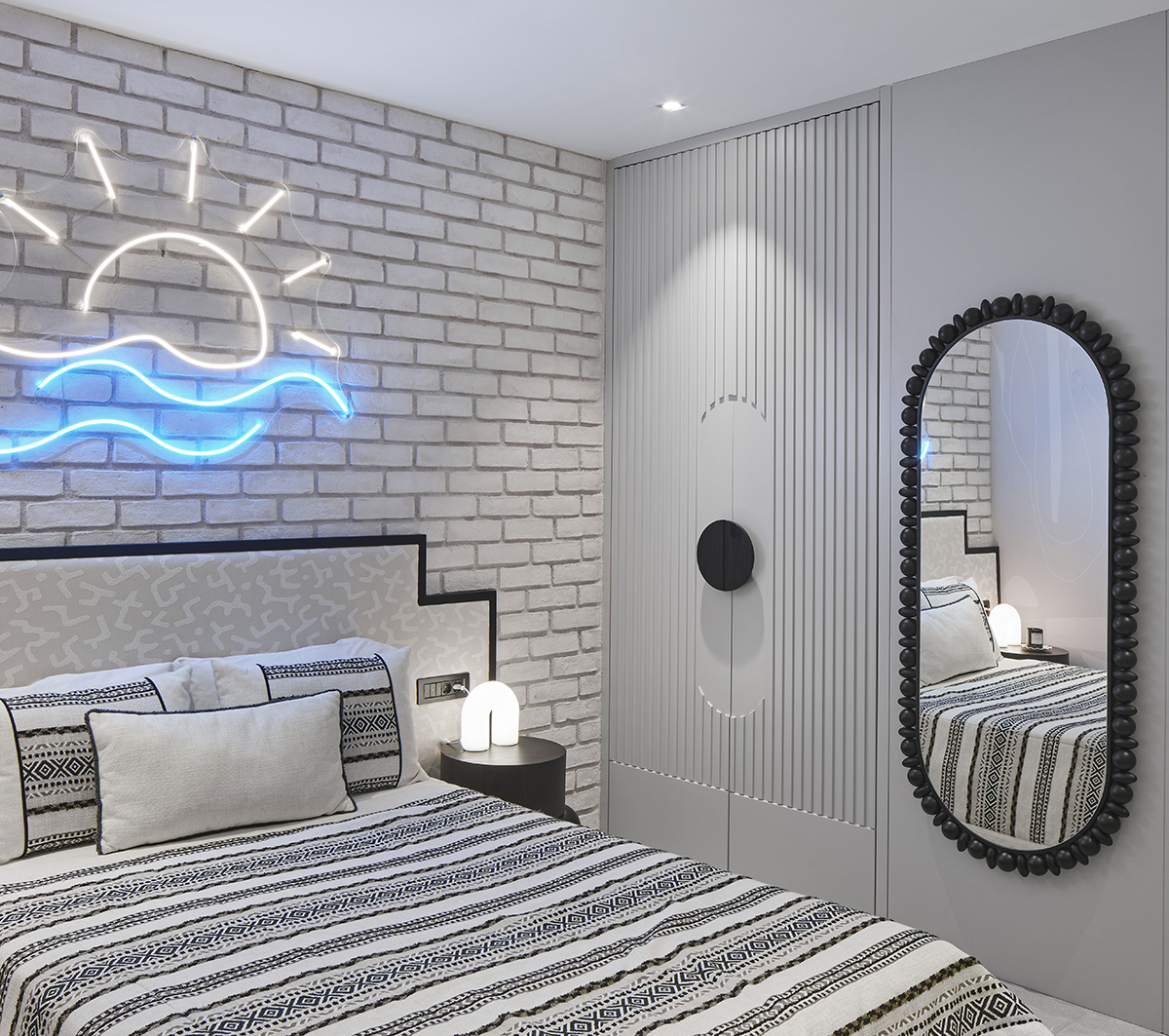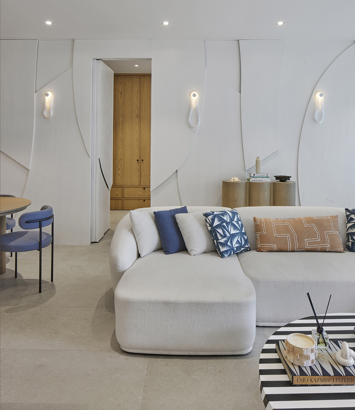 White stone look wall panels, mirrors, and light toned wood cladding enhance brightness and depth, while blue accents in the living area reflect the homeowners’ personal preferences.