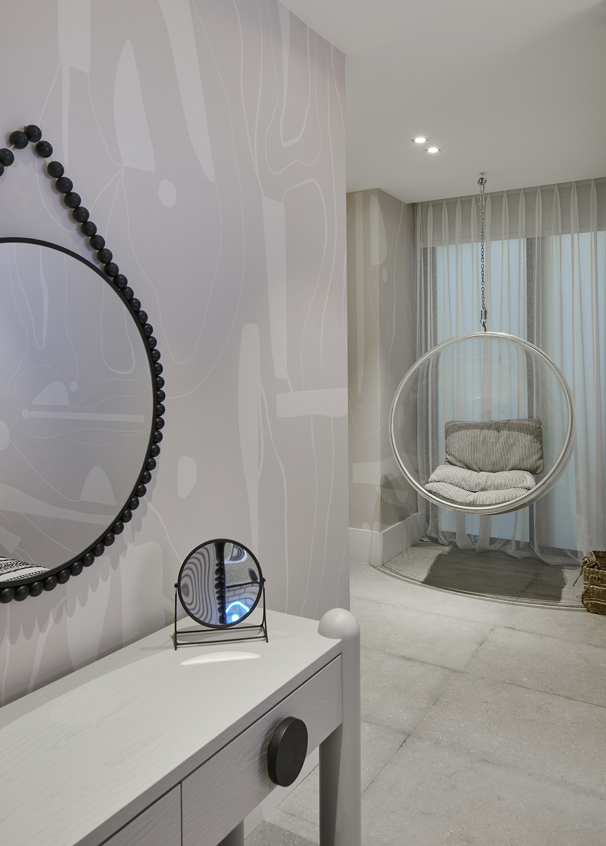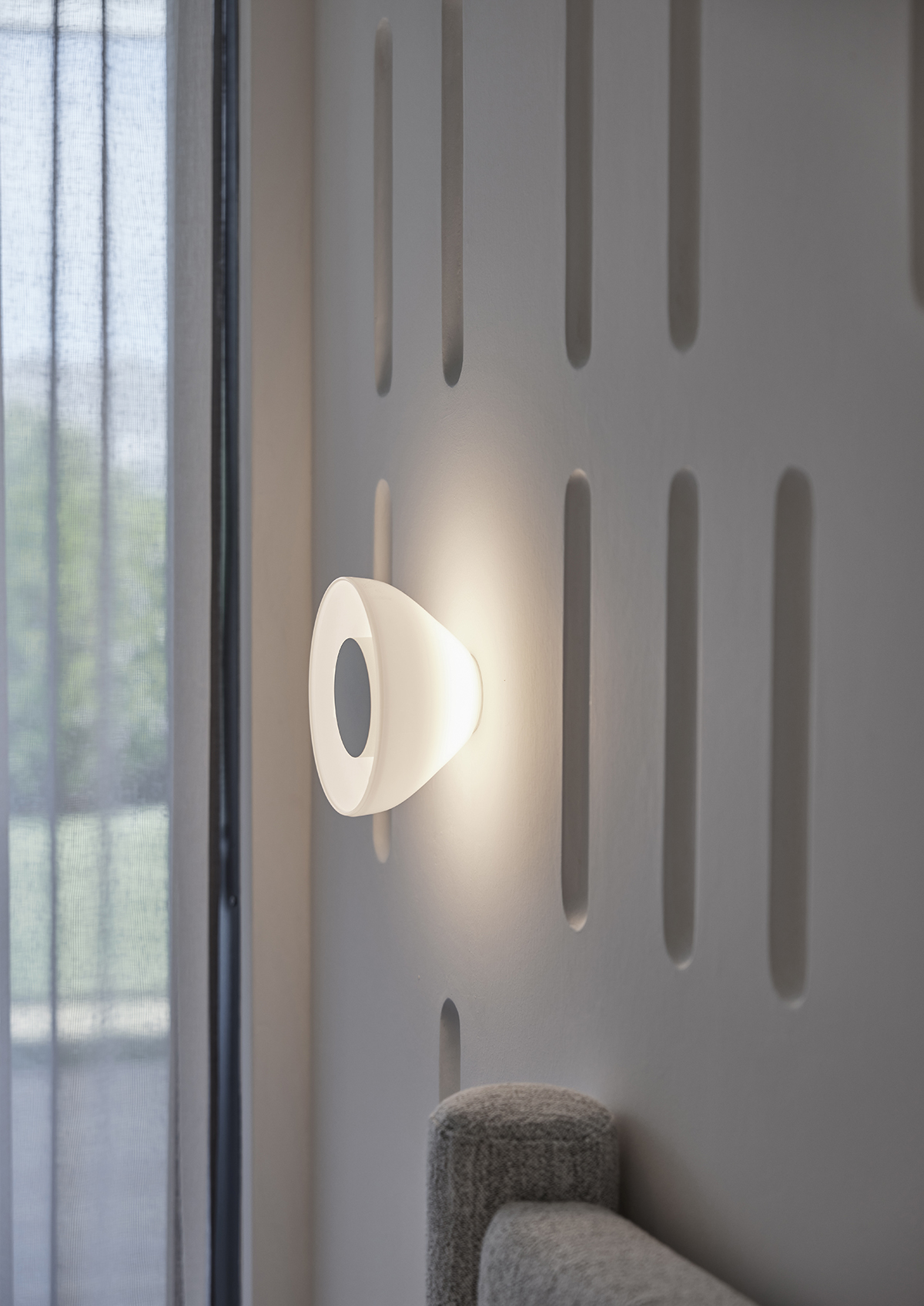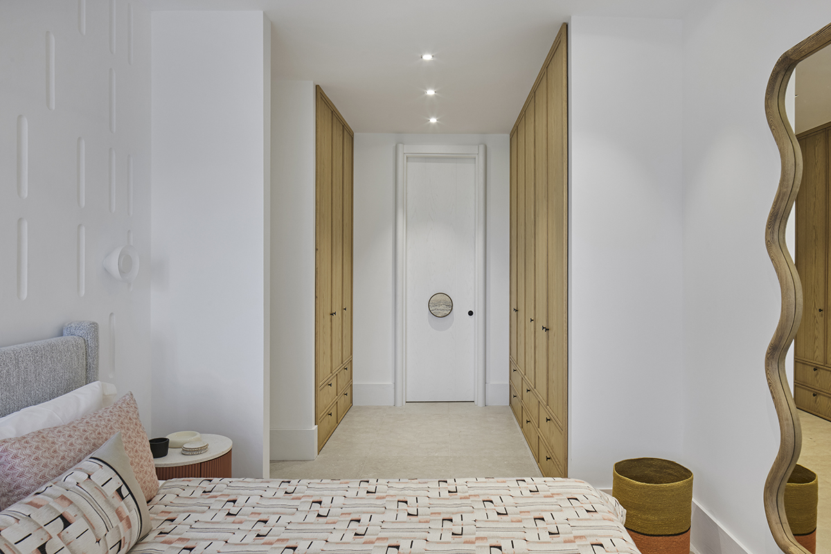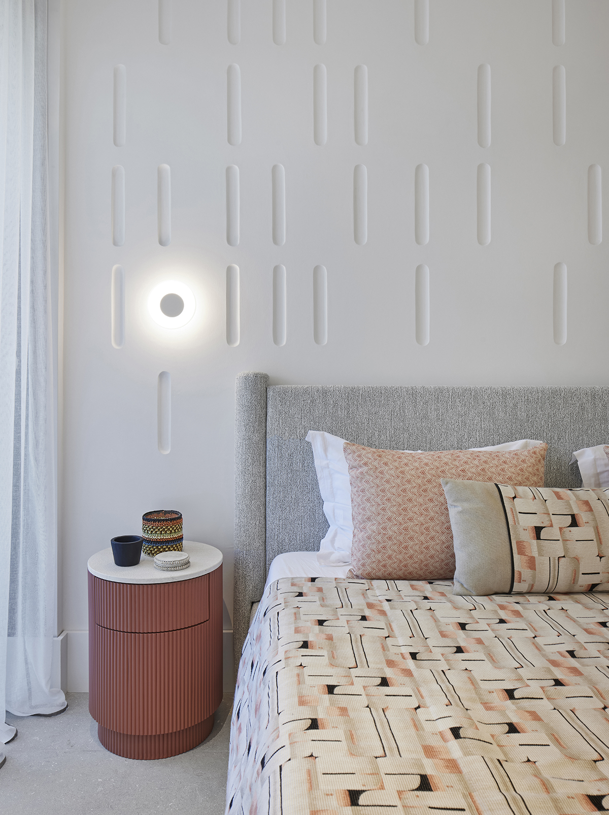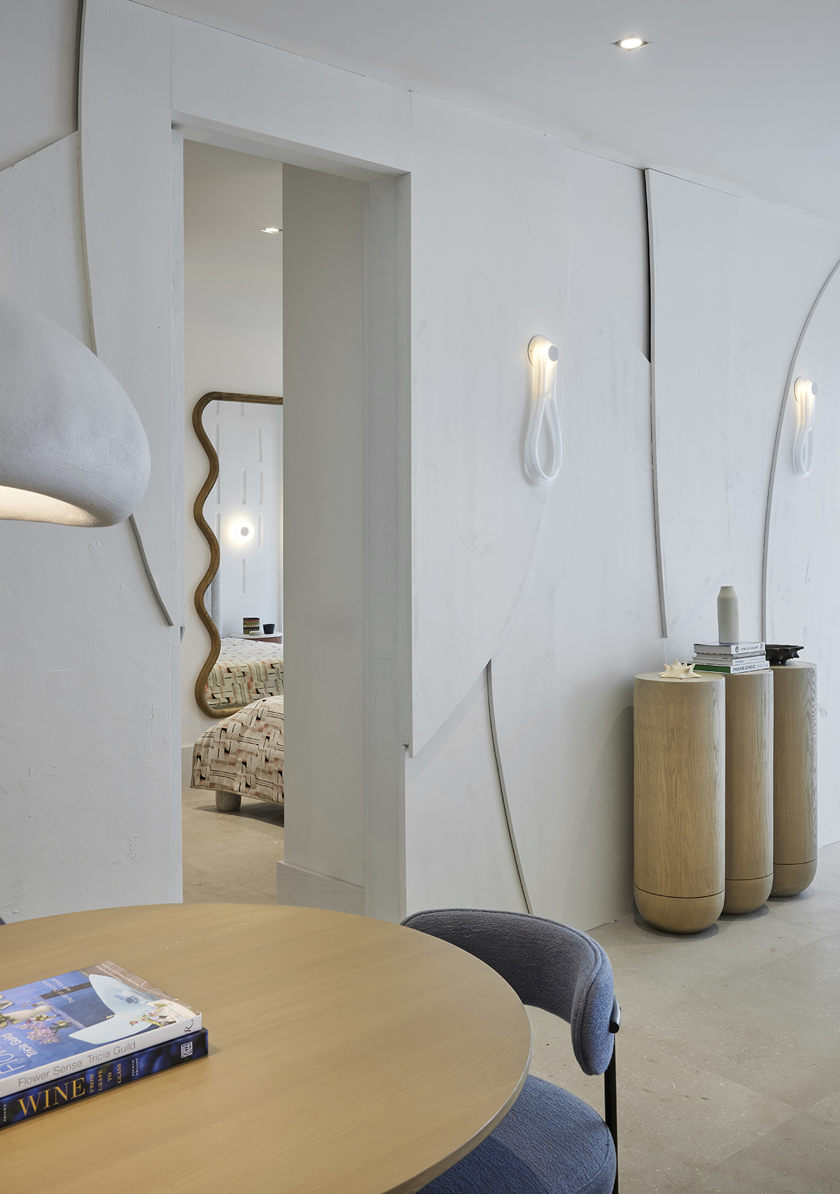 A calm summer palette defines the interiors, where white surfaces create a light backdrop enriched by natural textures and subtle color accents.