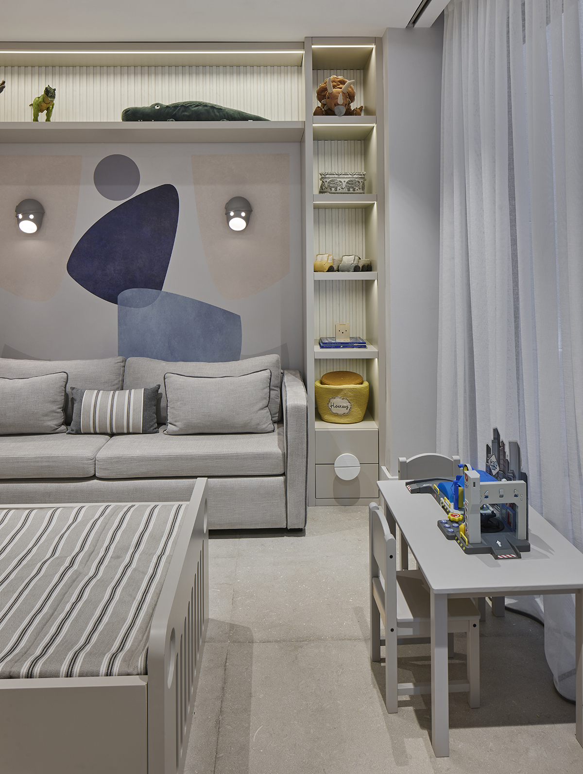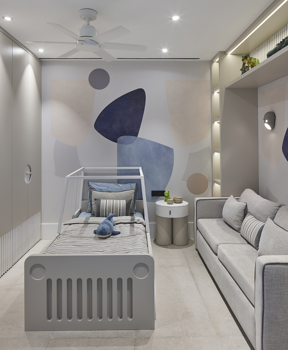 Lighting remains soft and layered, combining recessed spots, decorative wall lights, concealed LEDs, and ceiling fans in the bedrooms.