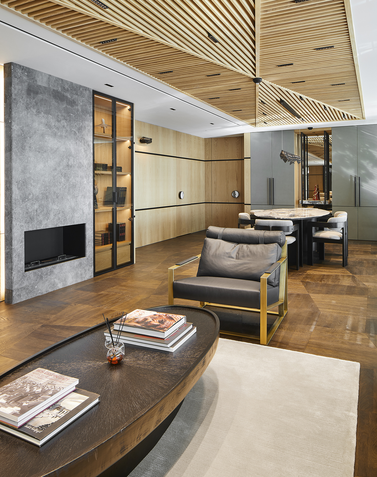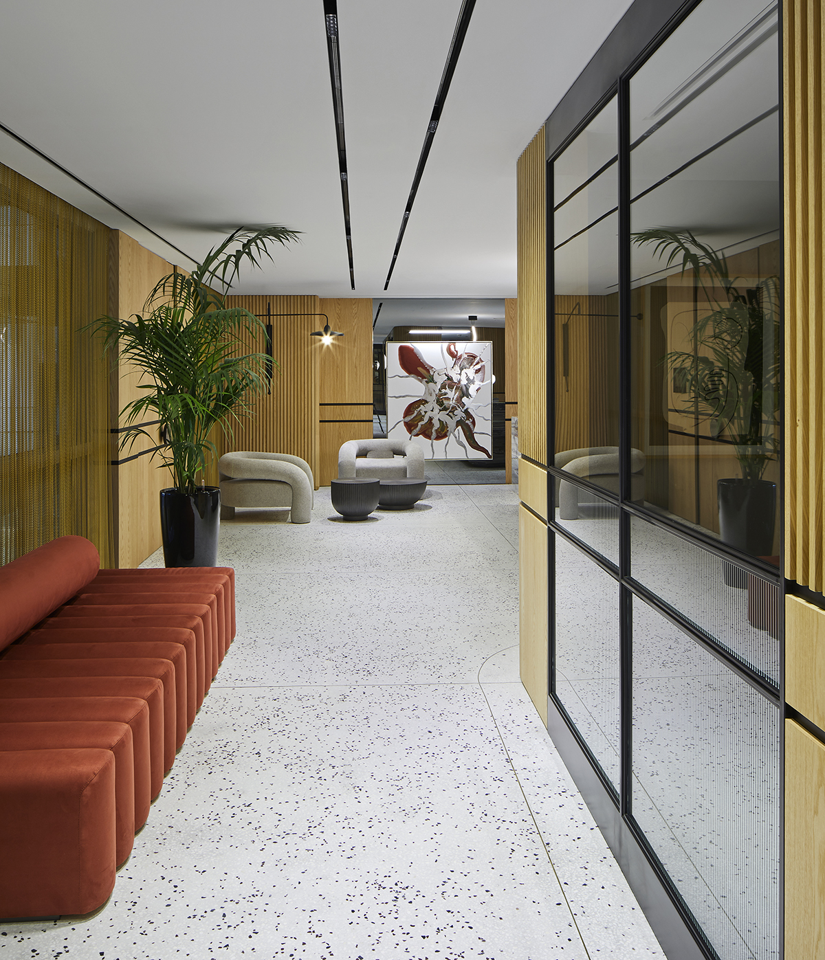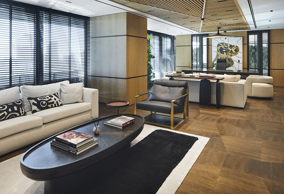 Natural oak finishes, terrazzo flooring with brass details, layered lighting, and custom designed furniture define the interior, while art pieces and sculptural elements enrich the spatial experience.