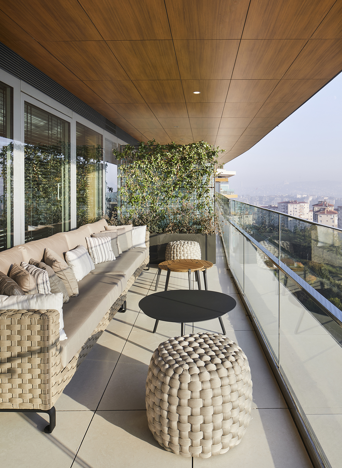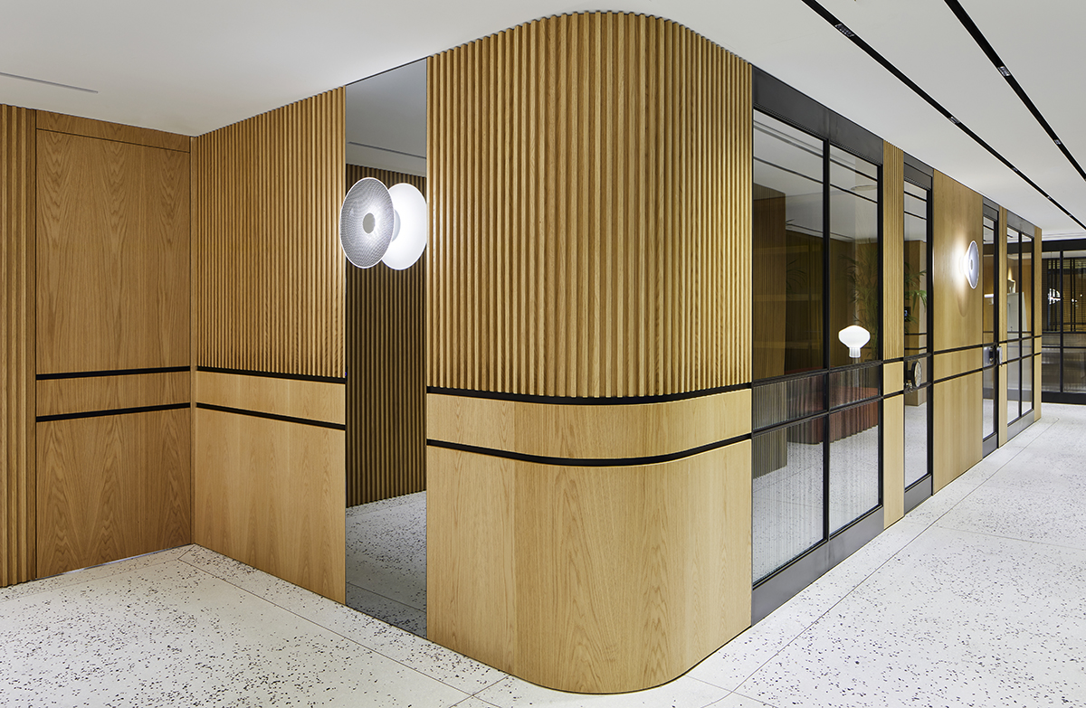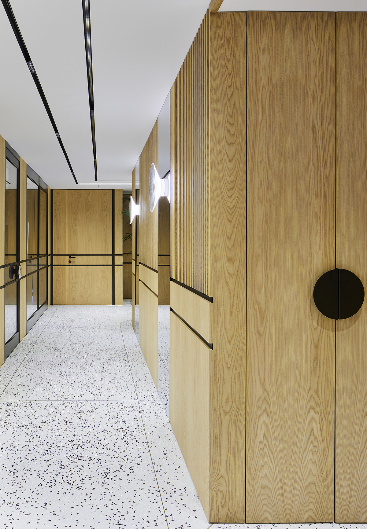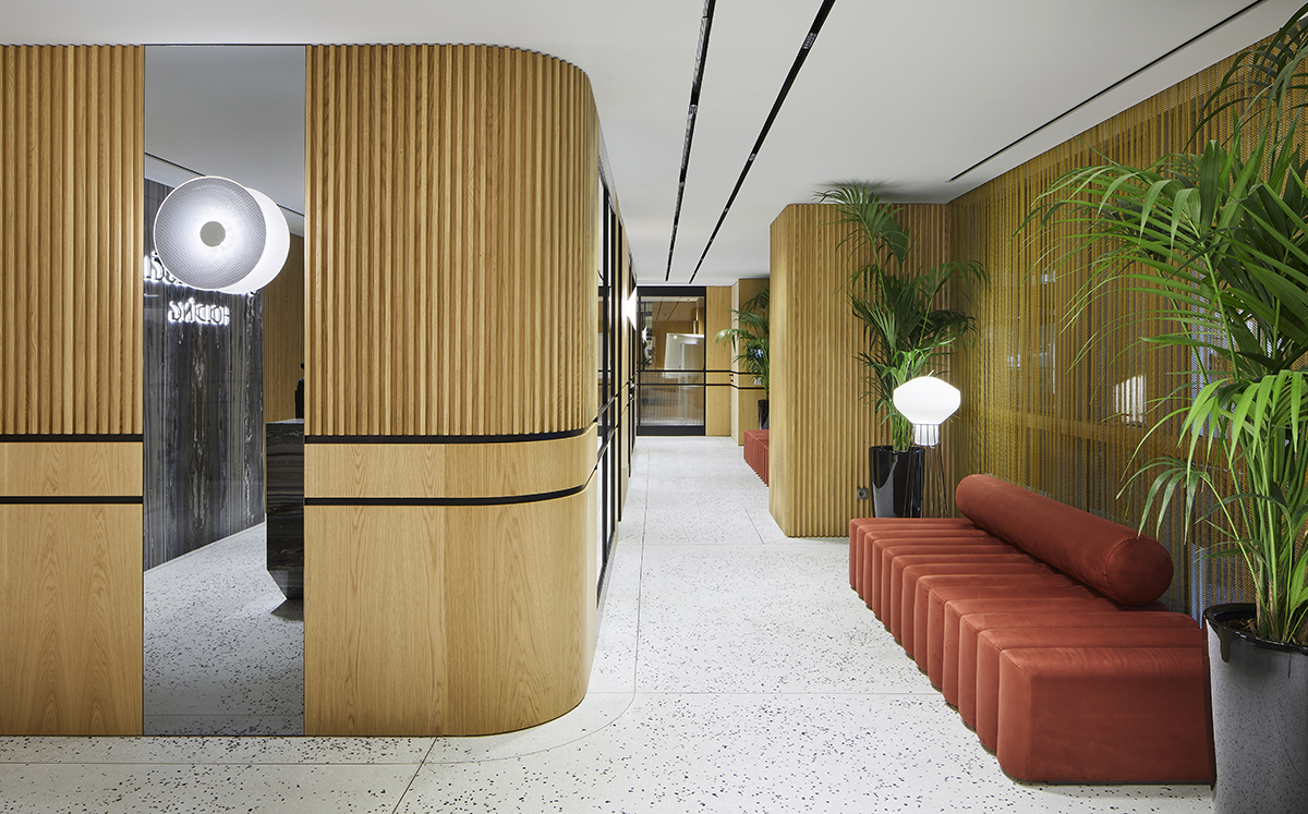 Natural oak finishes, terrazzo flooring with brass details, layered lighting, and custom designed furniture define the interior, while art pieces and sculptural elements enrich the spatial experience.