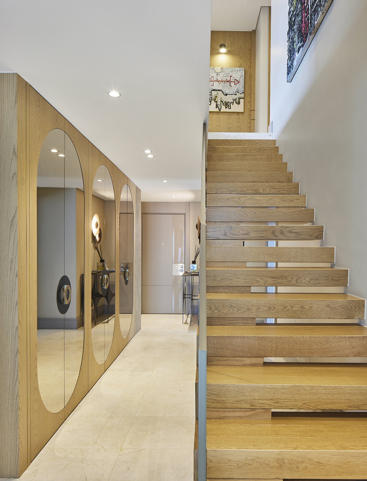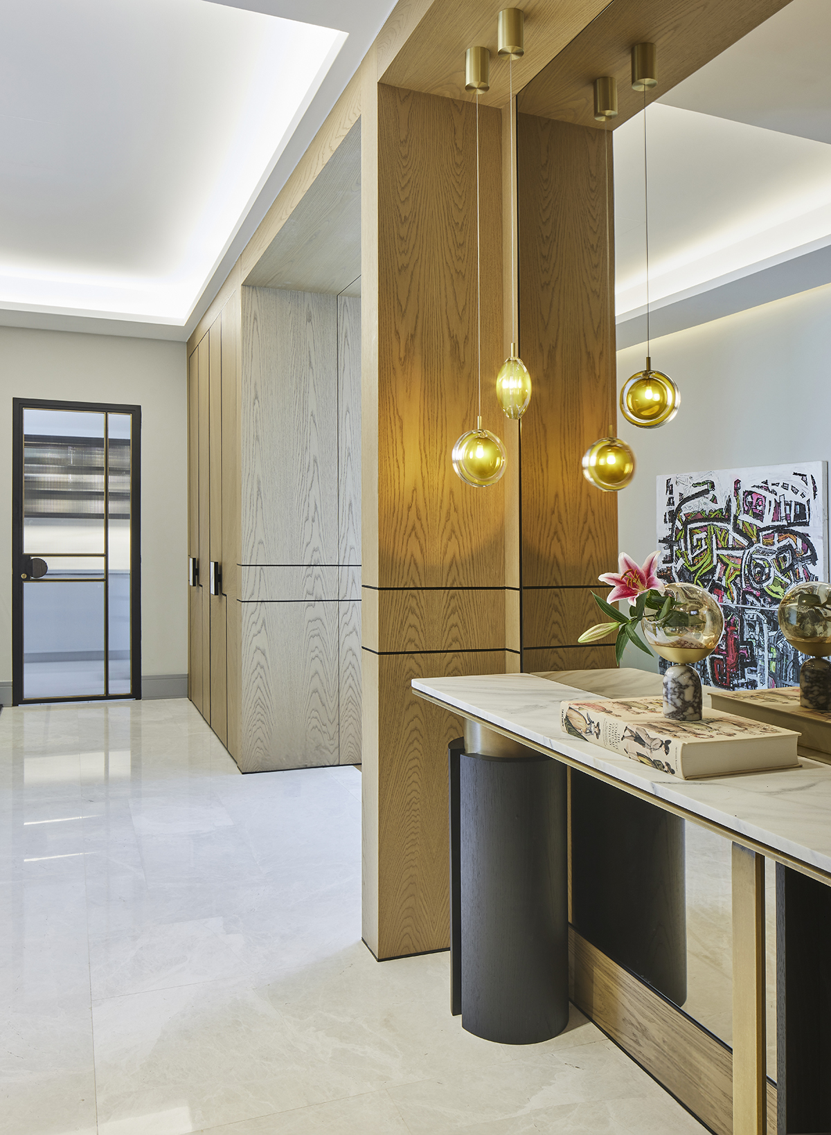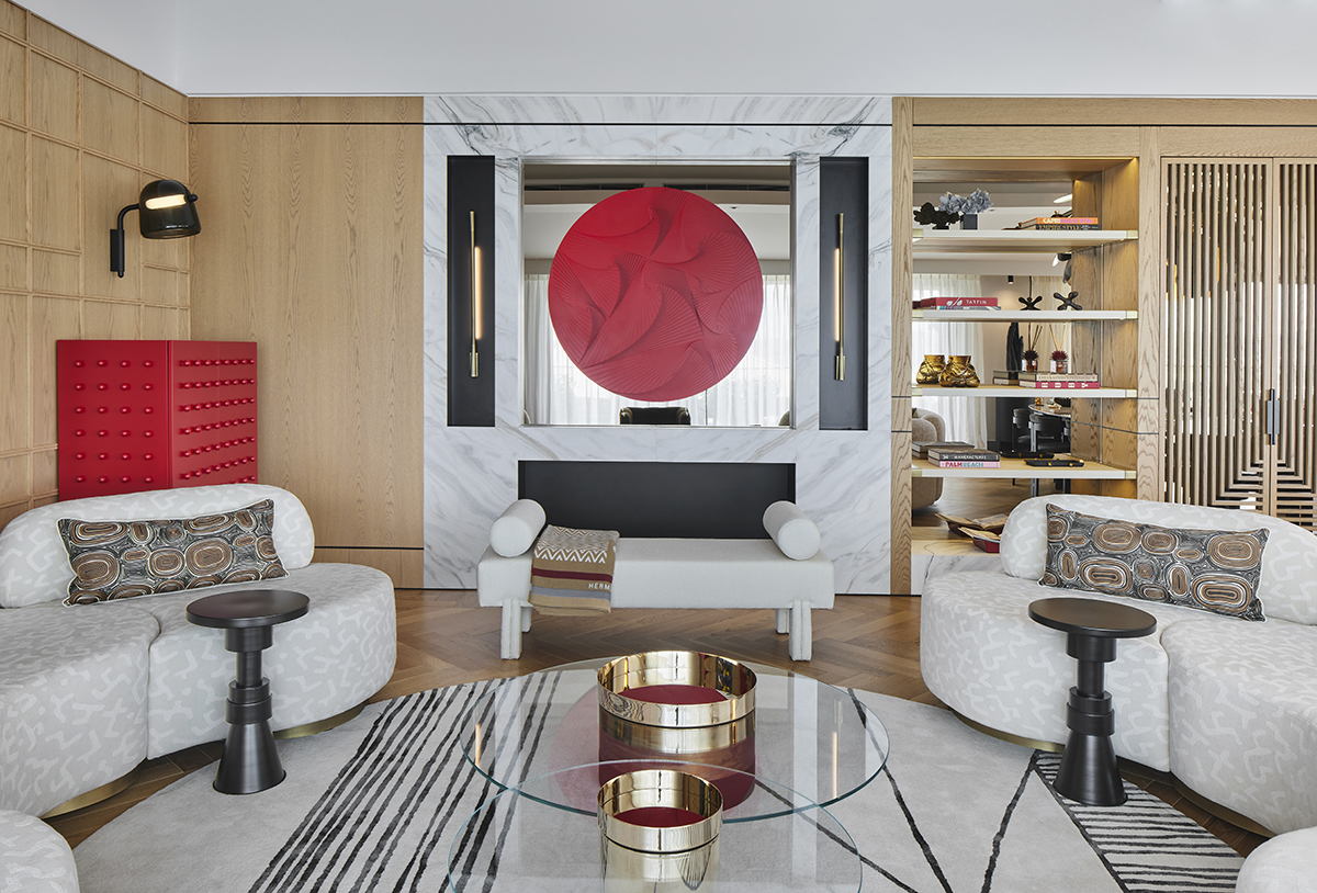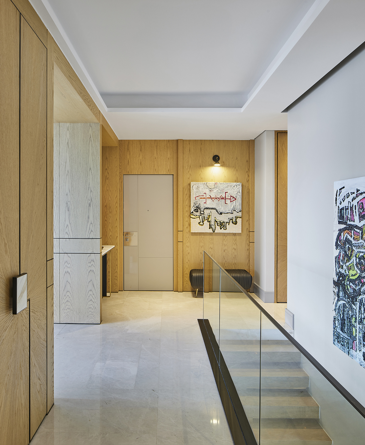 Artworks and selected design pieces introduce character and color, while layered lighting and a mix of marble and parquet flooring create a balanced, timeless atmosphere throughout.