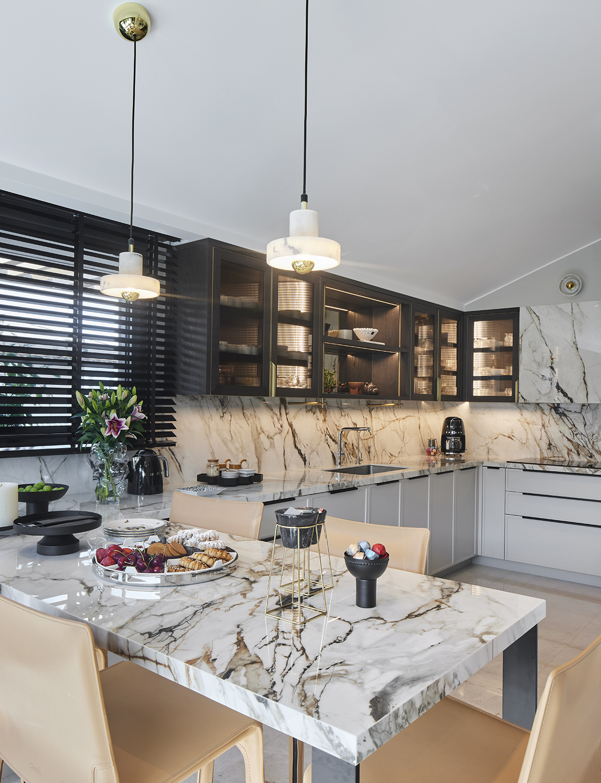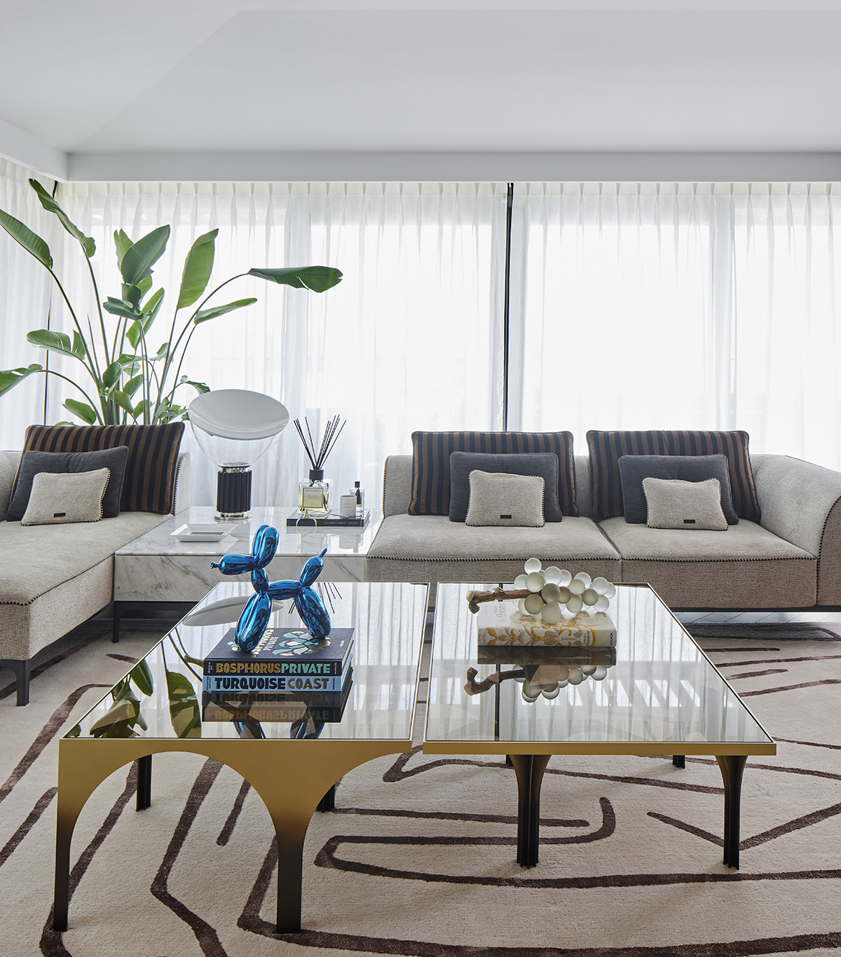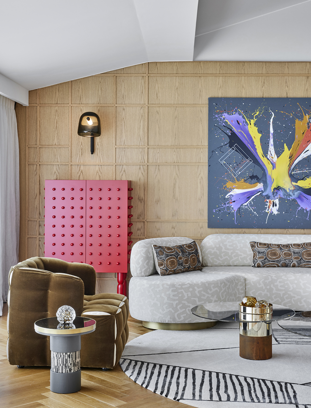 Artworks and selected design pieces introduce character and color, while layered lighting and a mix of marble and parquet flooring create a balanced, timeless atmosphere throughout.