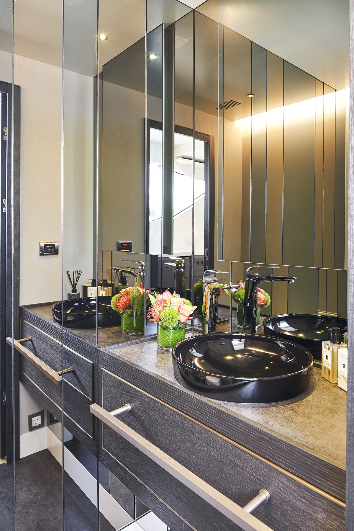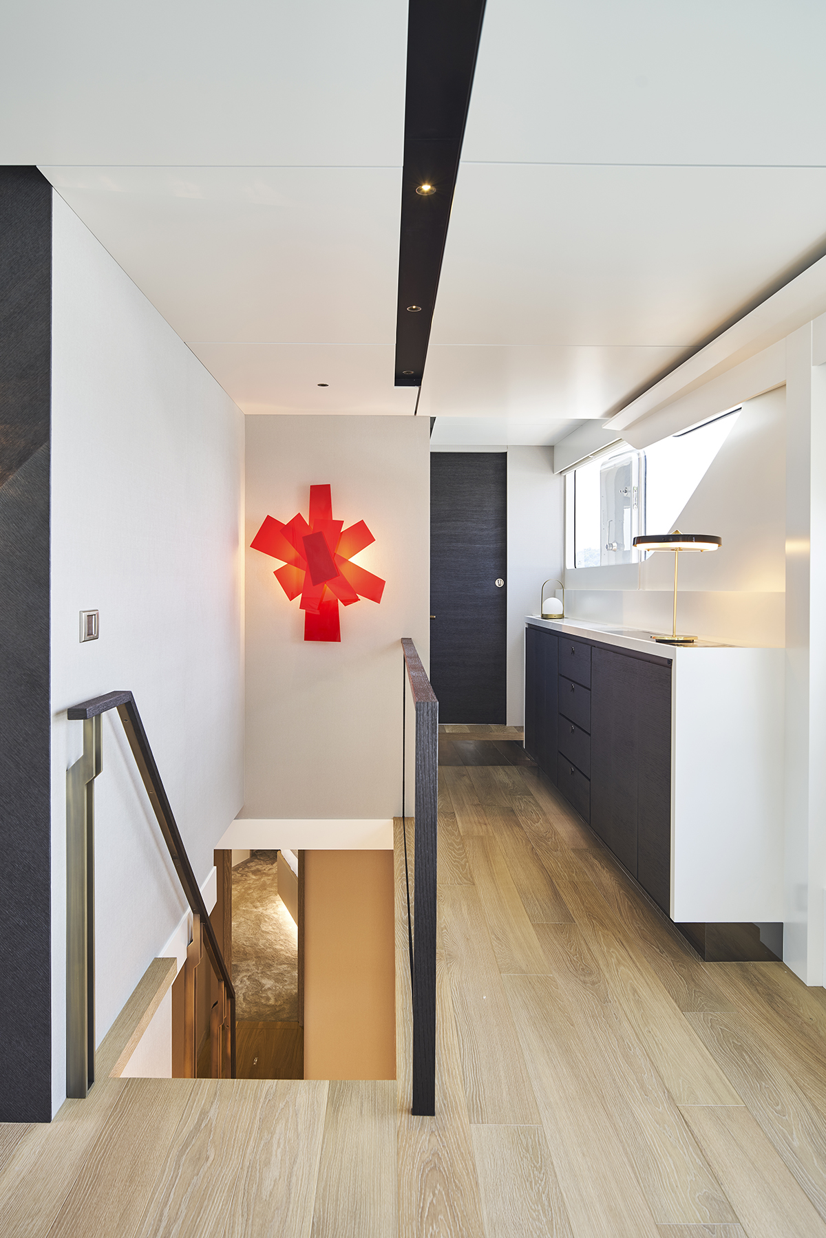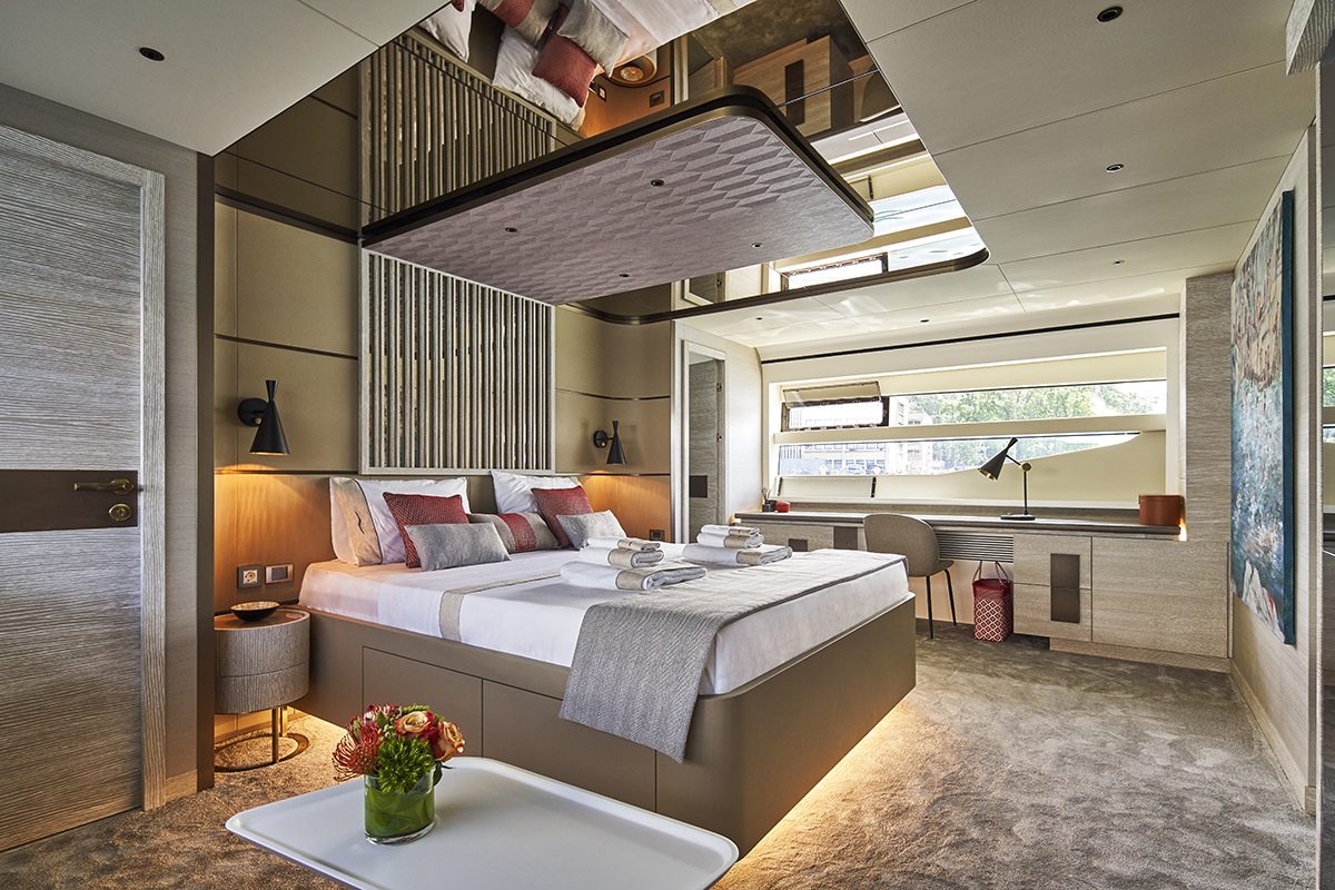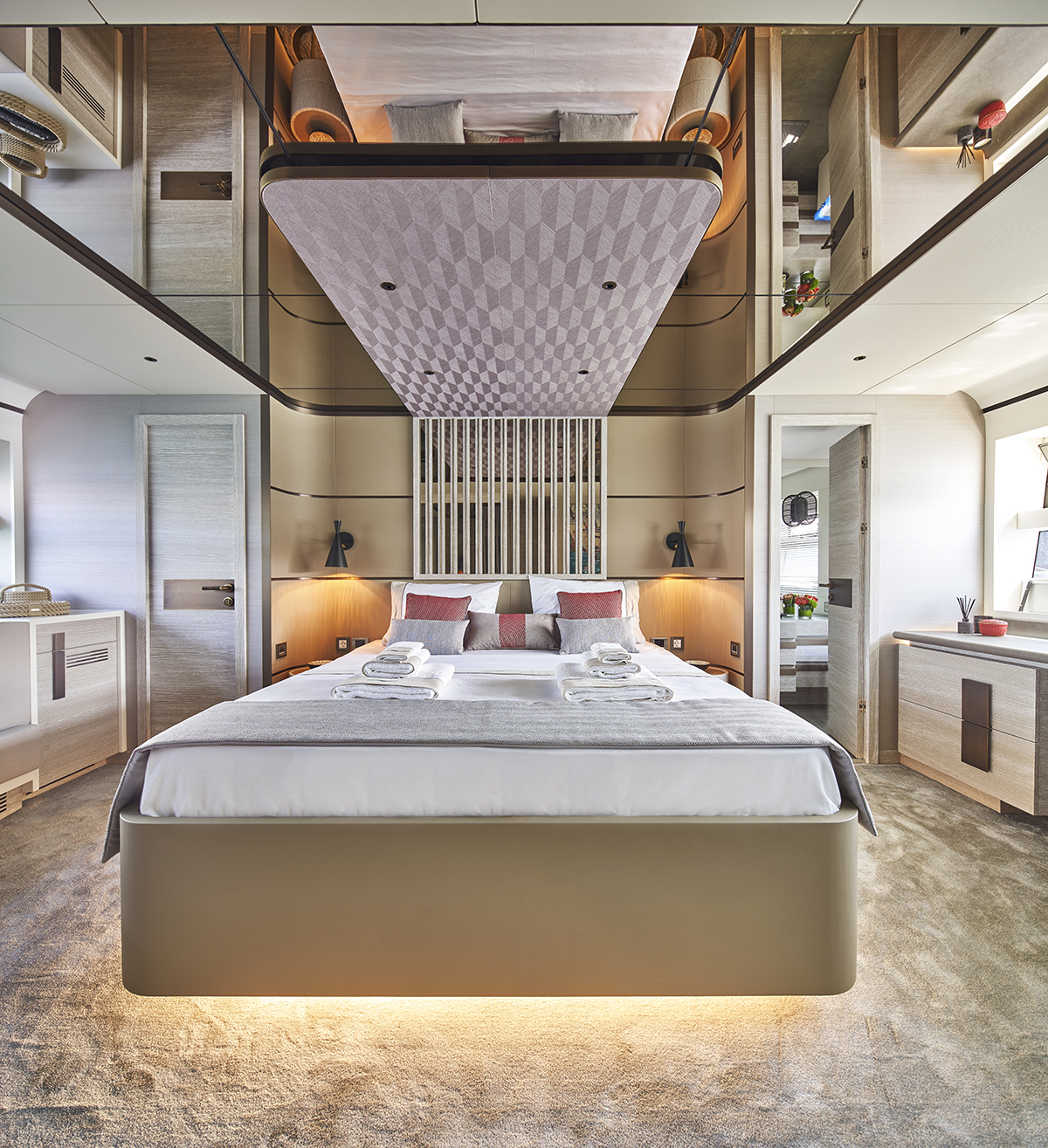 Layered lighting and a carefully curated material selection from oak flooring to wool carpets and Neolith surfaces ensure a cohesive and serene onboard atmosphere.