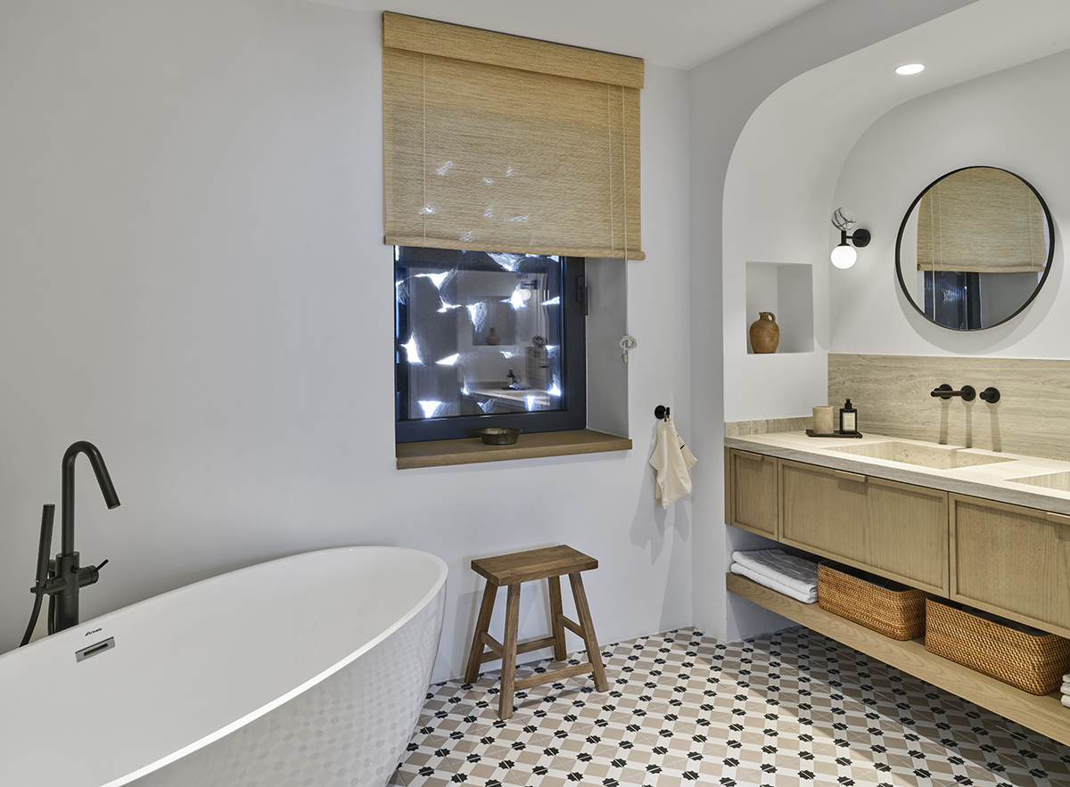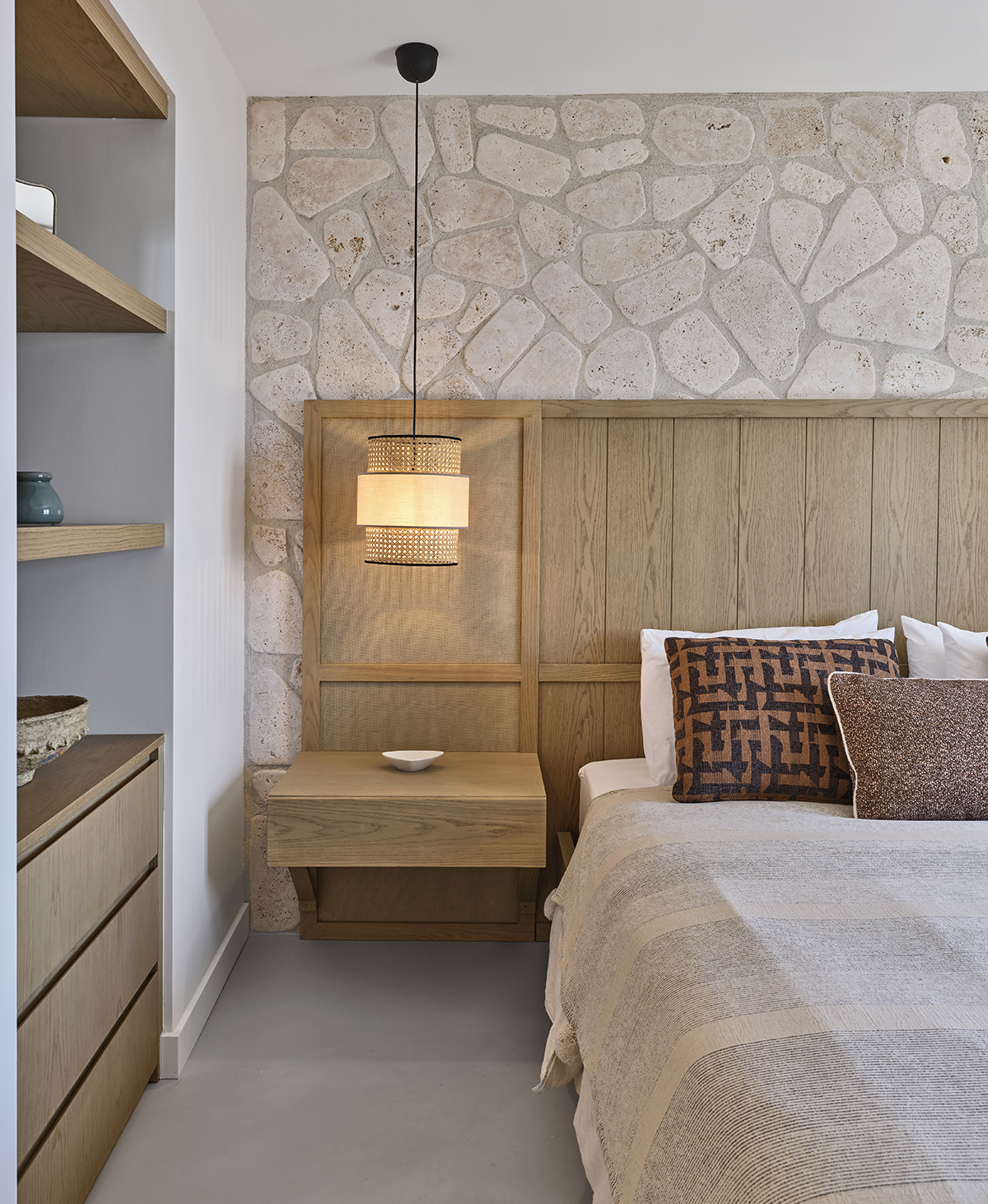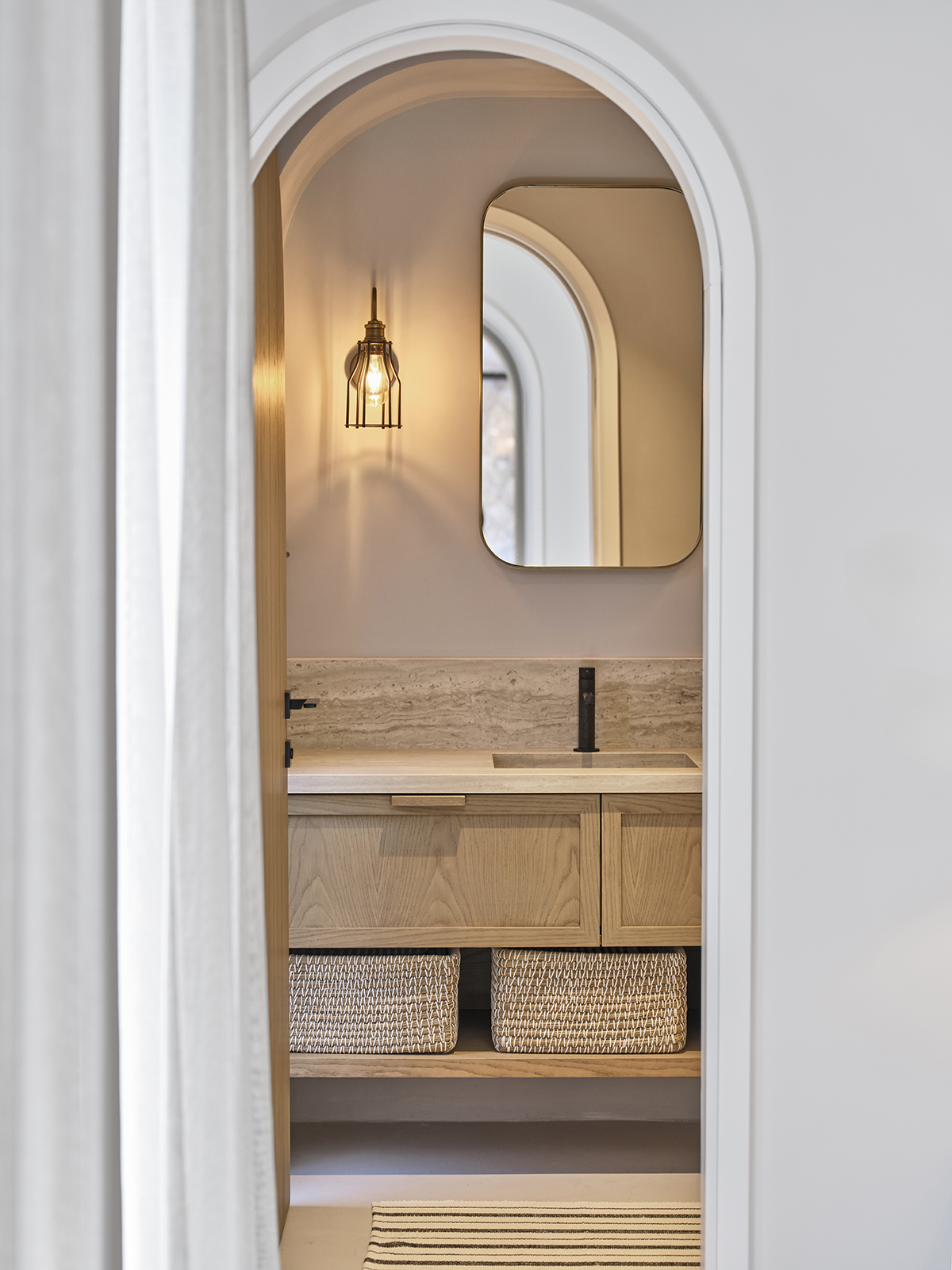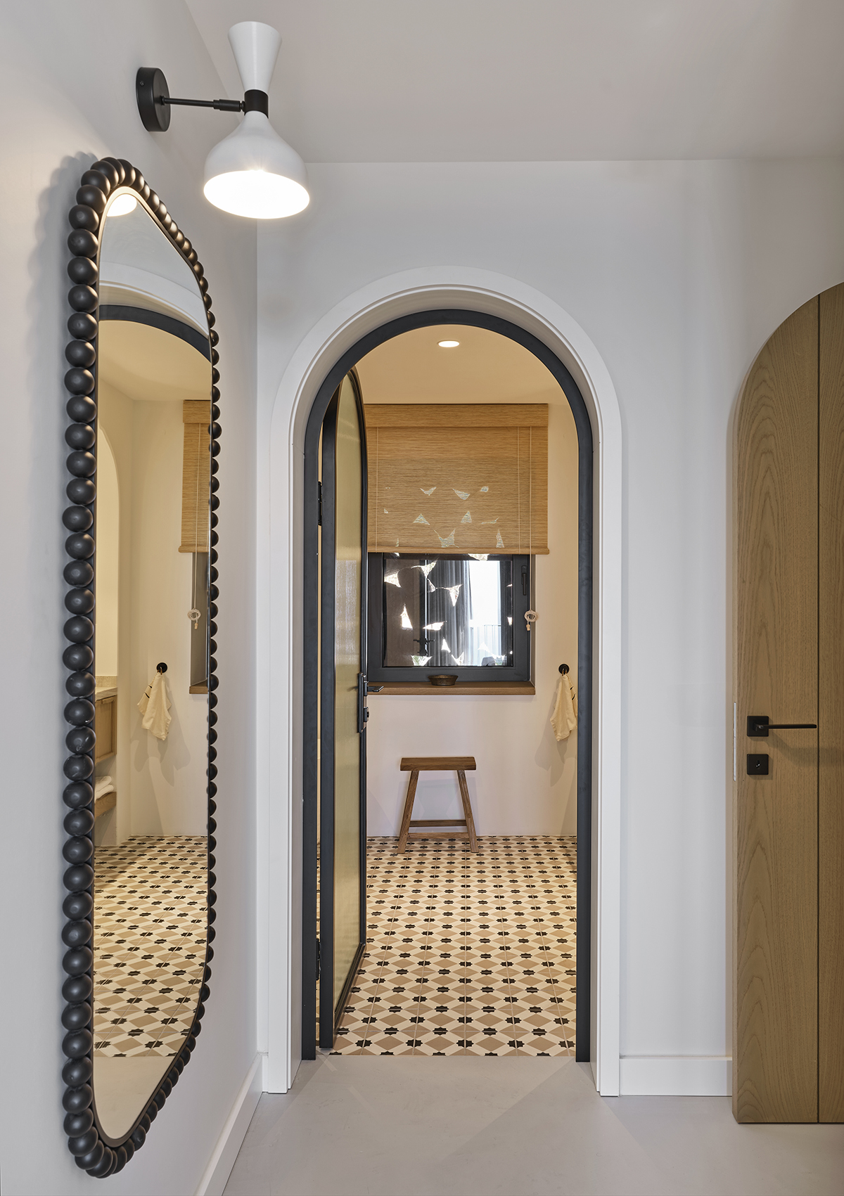 Light-toned surfaces, open oak furnishings, ethnic accents, and soft grey microtopping flooring create a warm yet restrained atmosphere, while mirrors and carefully positioned openings enhance light and spatial depth.