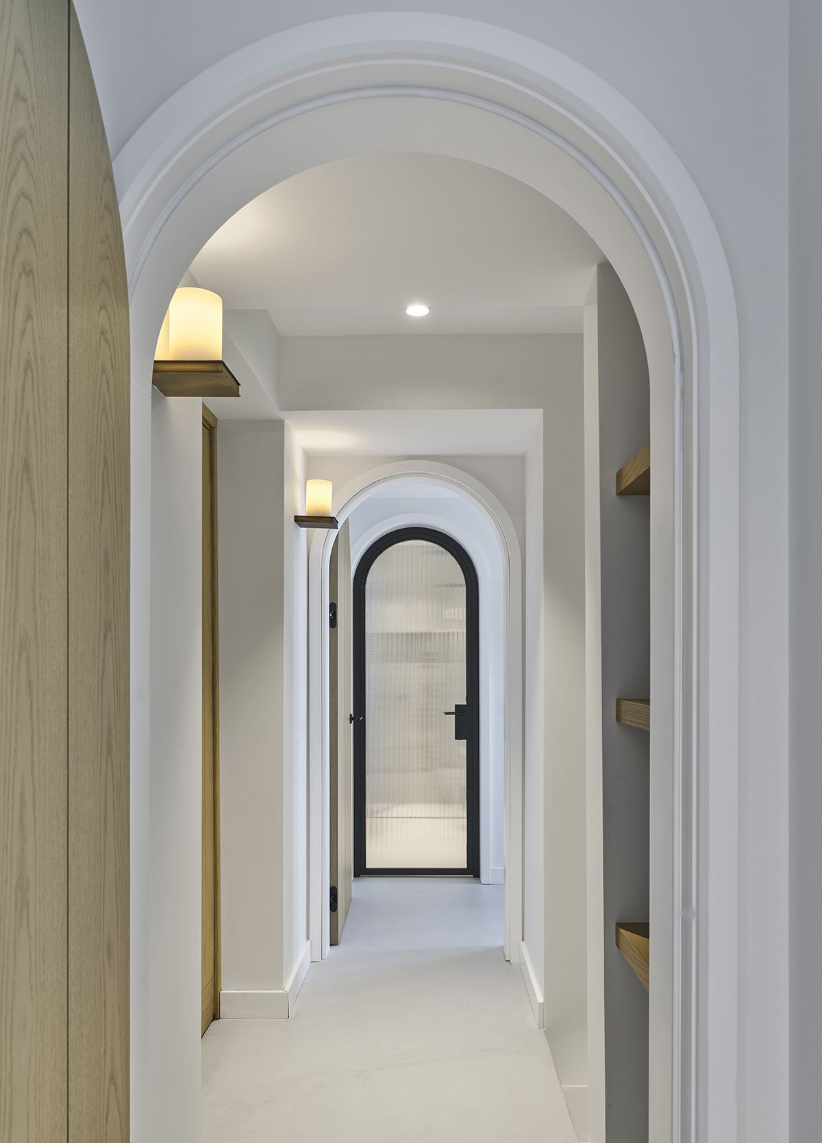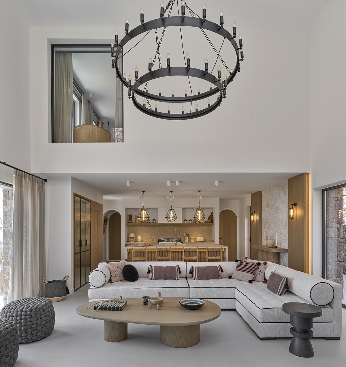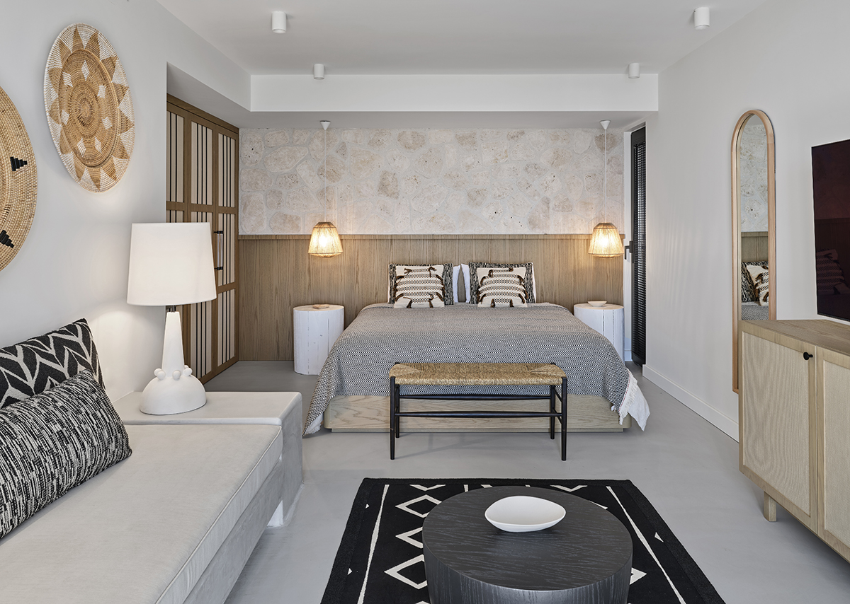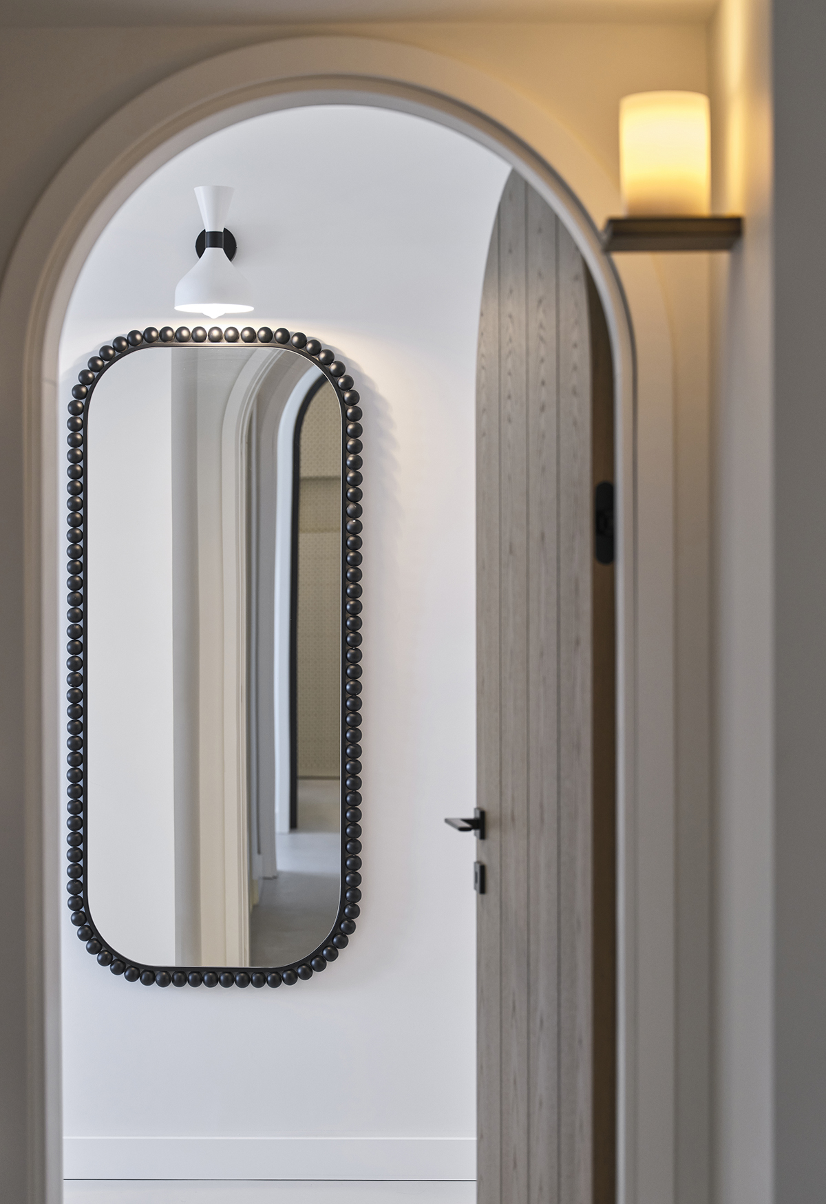 Light-toned surfaces, open oak furnishings, ethnic accents, and soft grey microtopping flooring create a warm yet restrained atmosphere, while mirrors and carefully positioned openings enhance light and spatial depth.