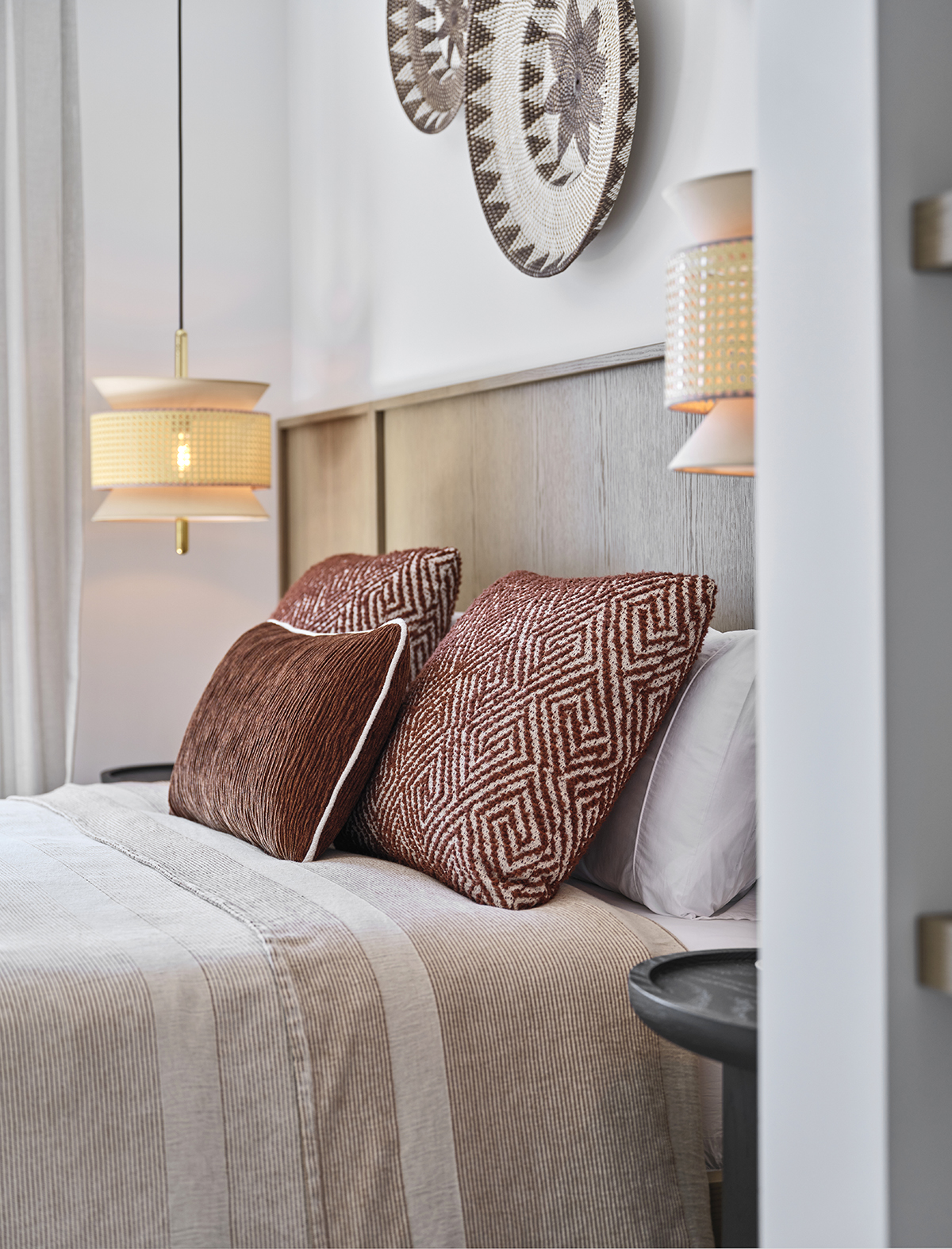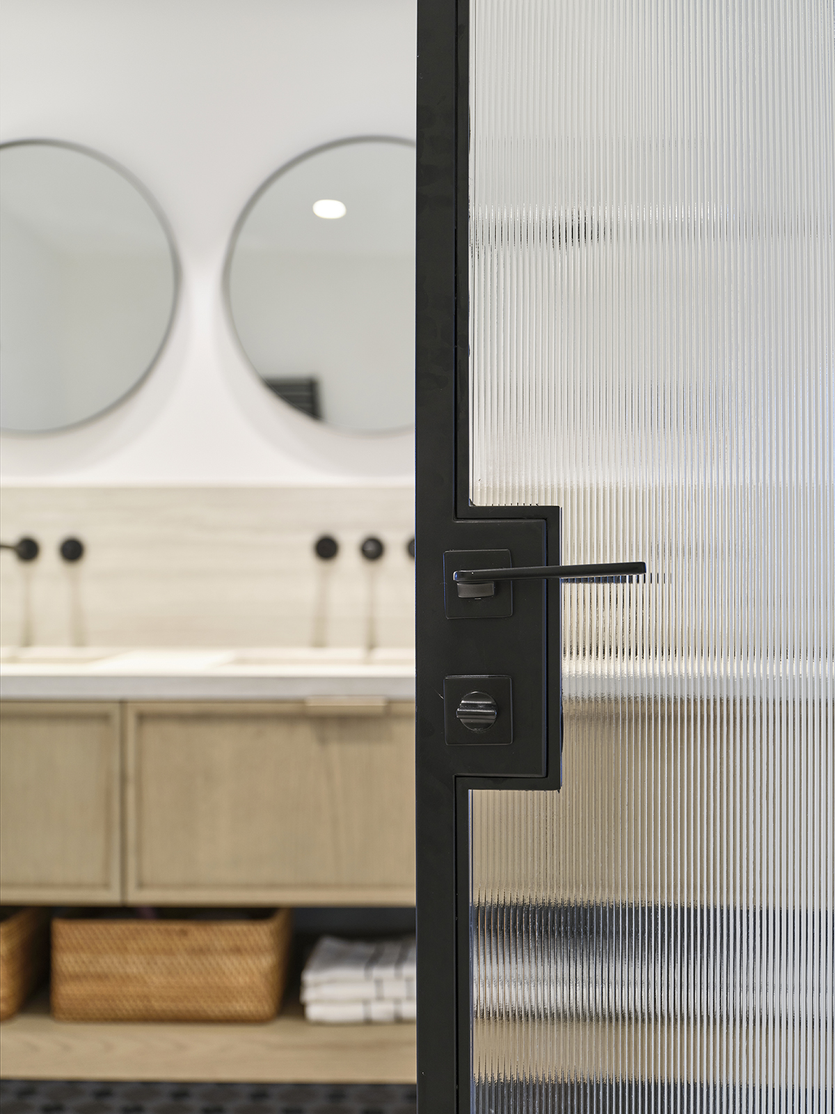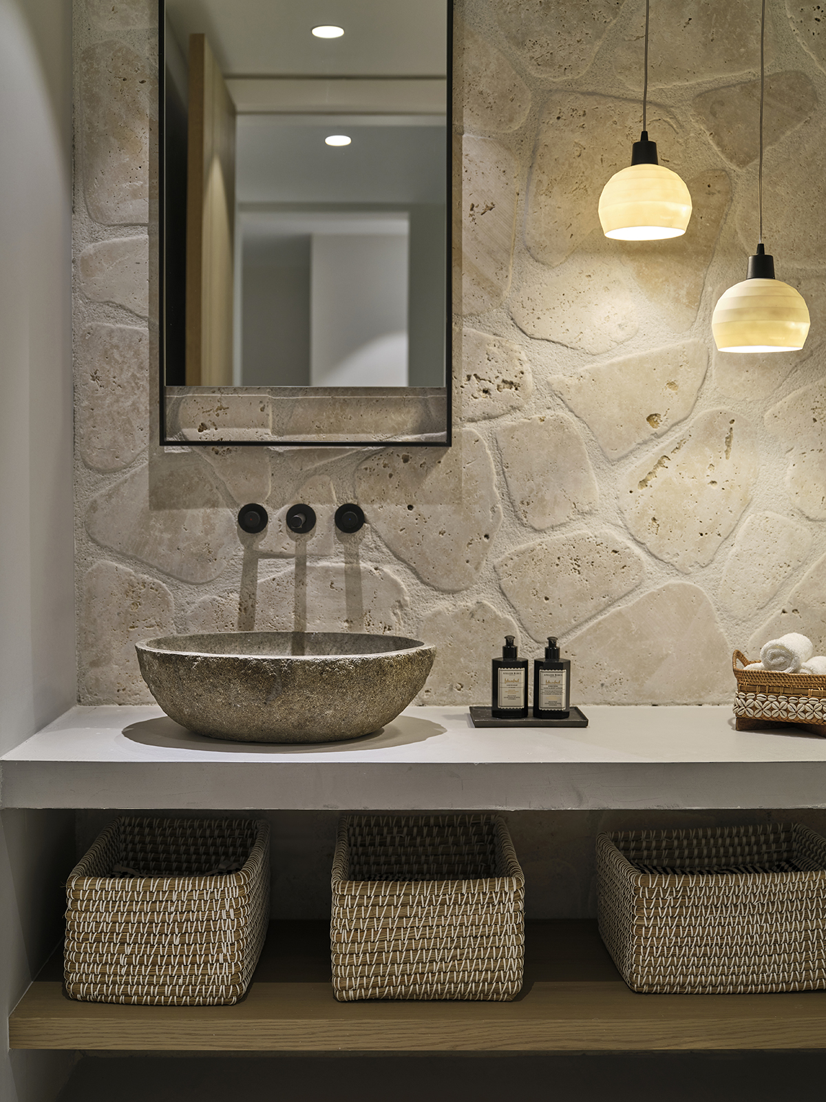 Natural textiles, patterned ceramics in the bathrooms, and climate-responsive landscaping further strengthen the home’s quiet, timeless relationship with its setting.