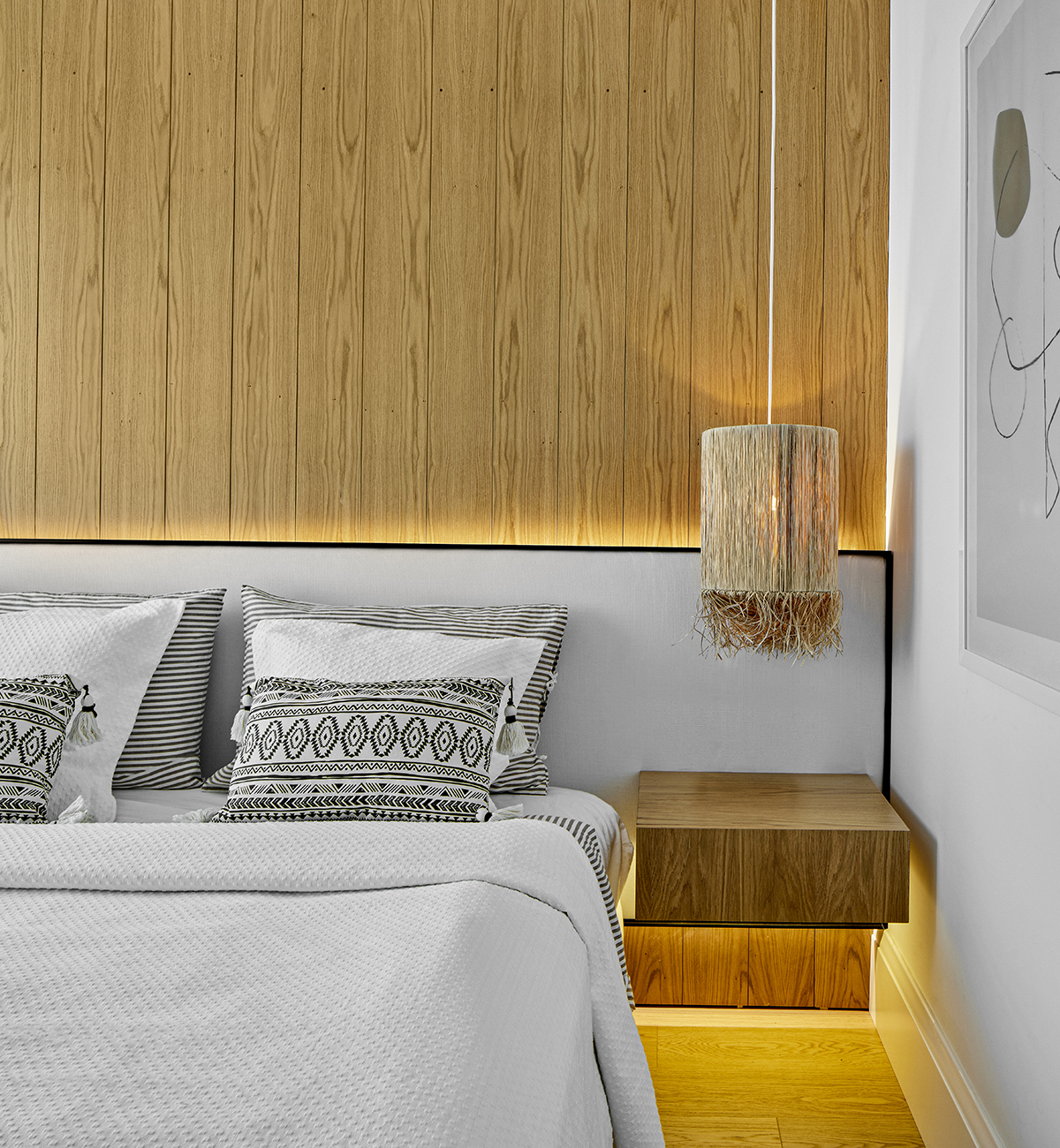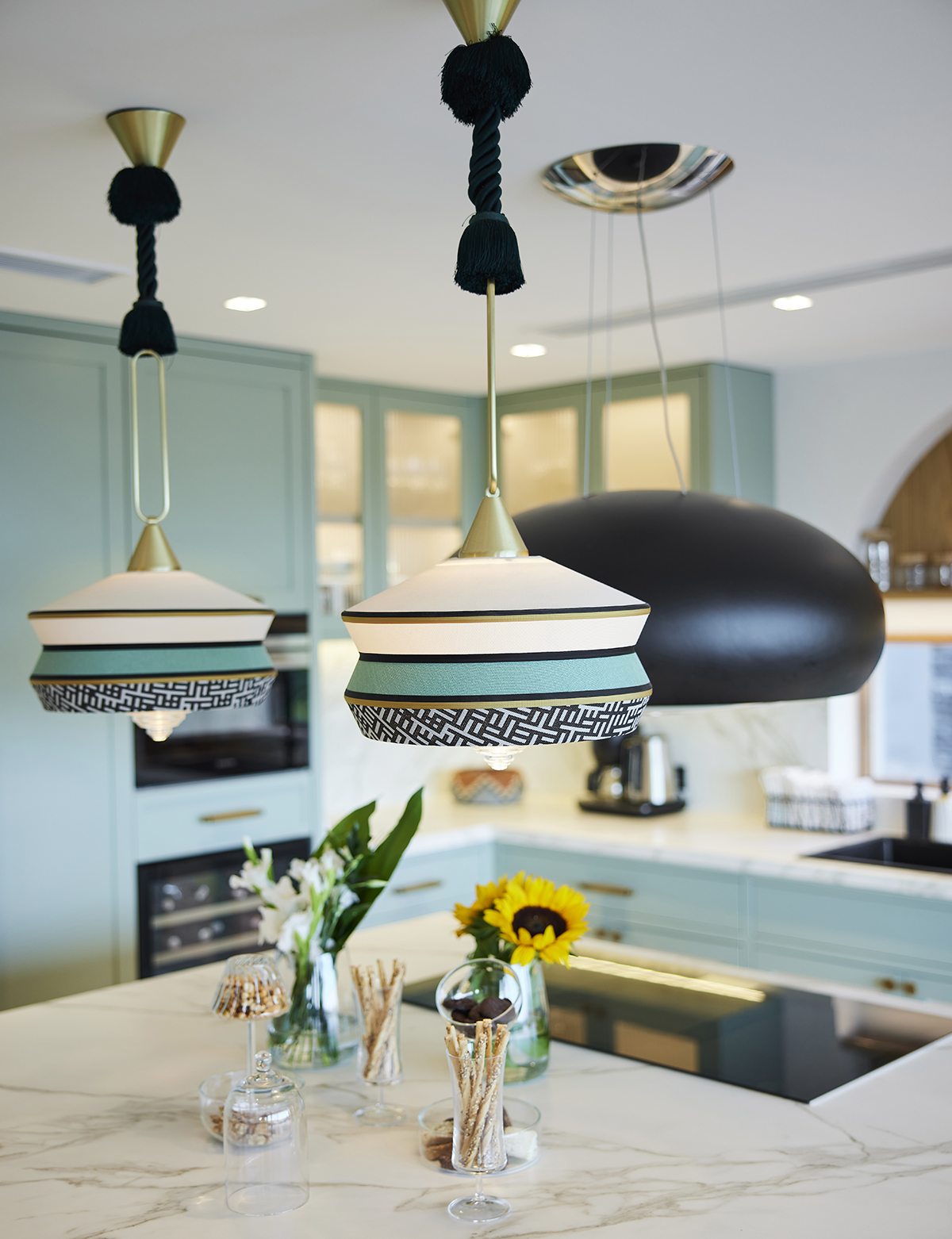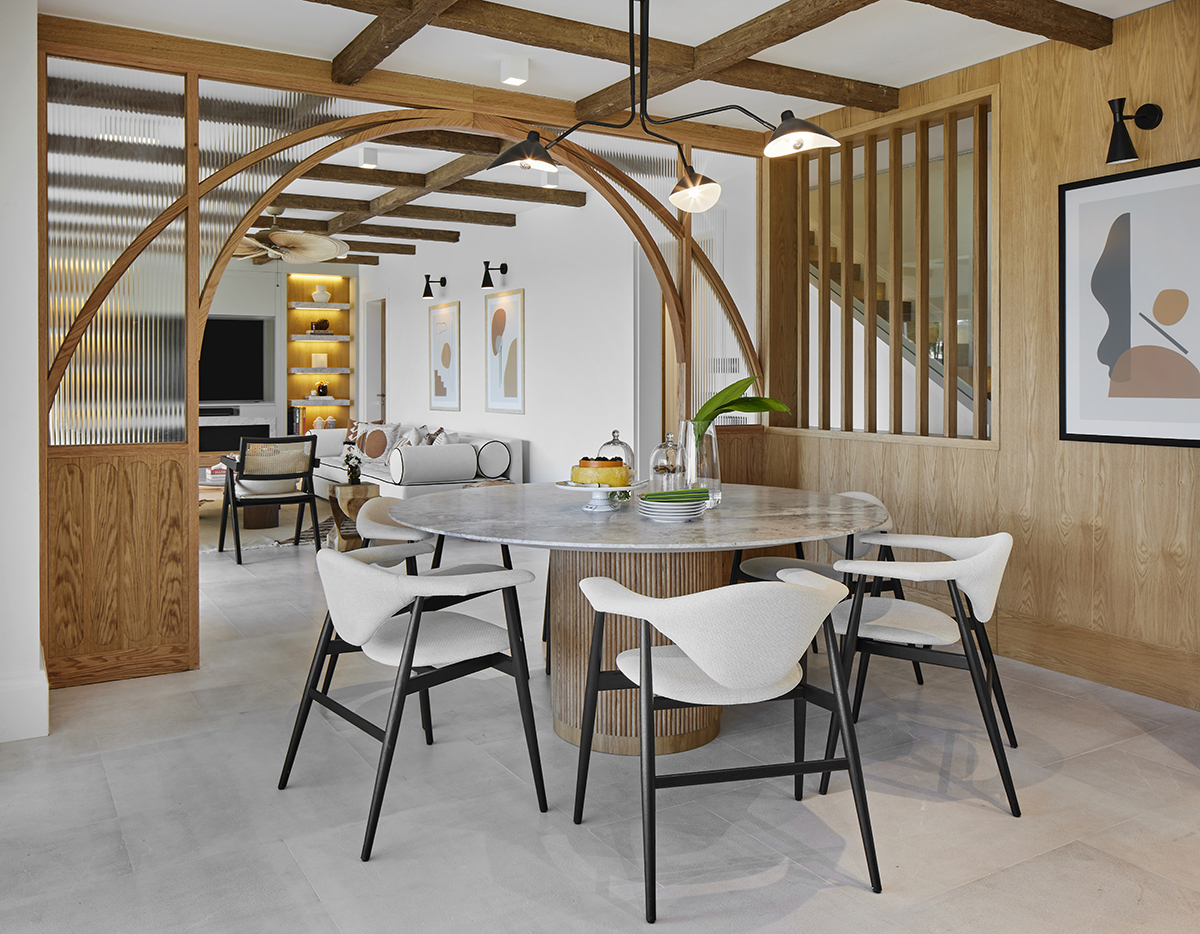 Lighting was kept understated, combining surface mounted spotlights, pendants, ceiling fans, and concealed LED details.