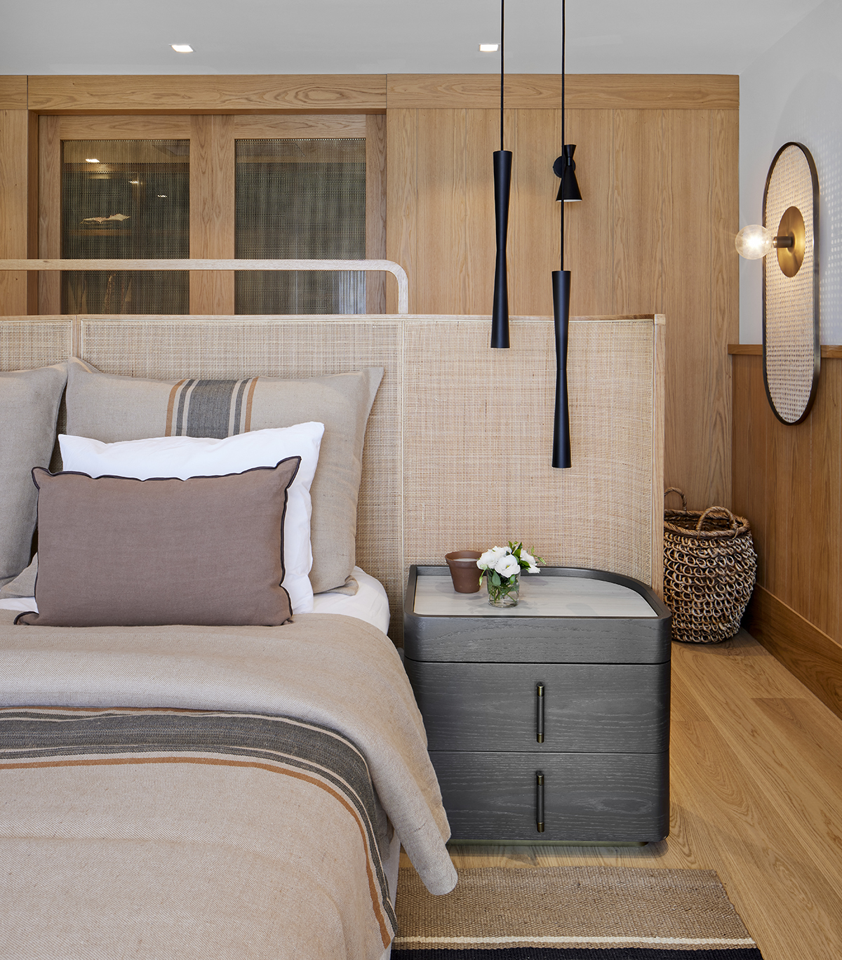 Natural stone, textured finishes, and oak flooring complete the interior, while a thoughtfully designed landscape of Mediterranean plants frames the outdoor spaces in harmony with the setting.