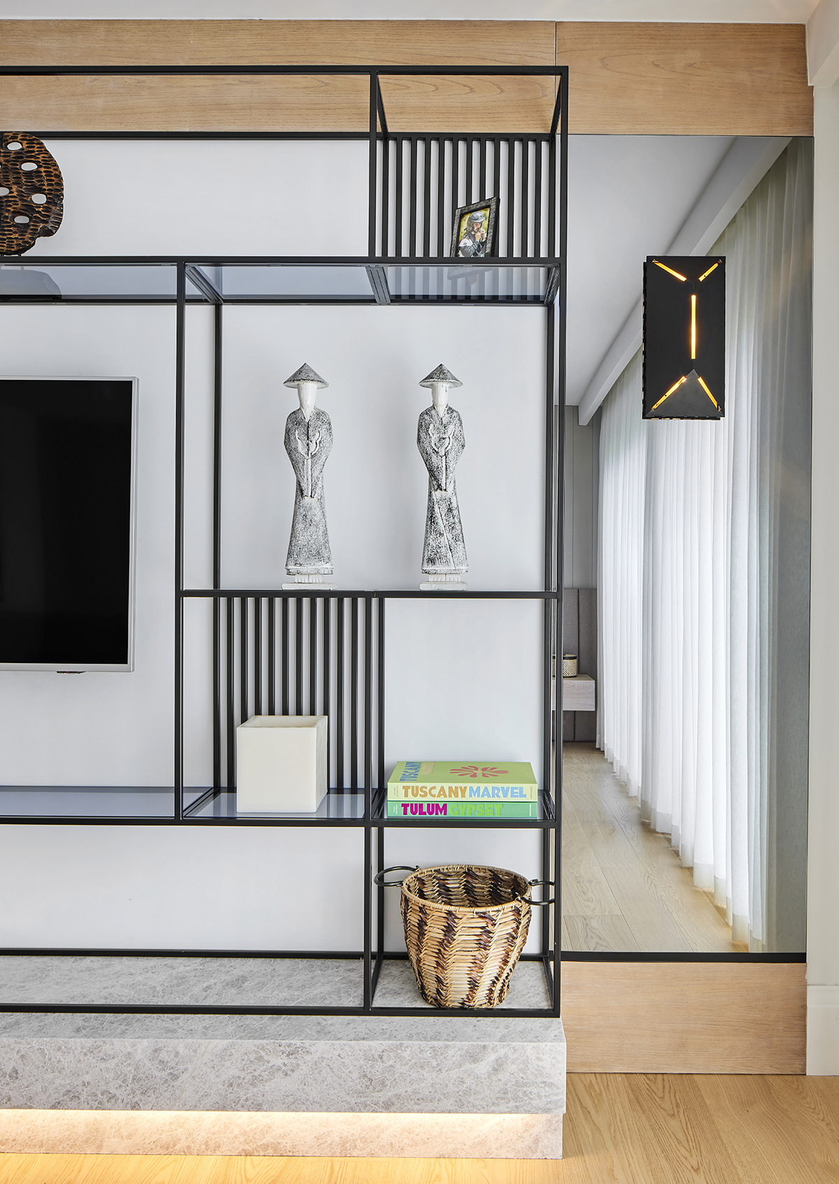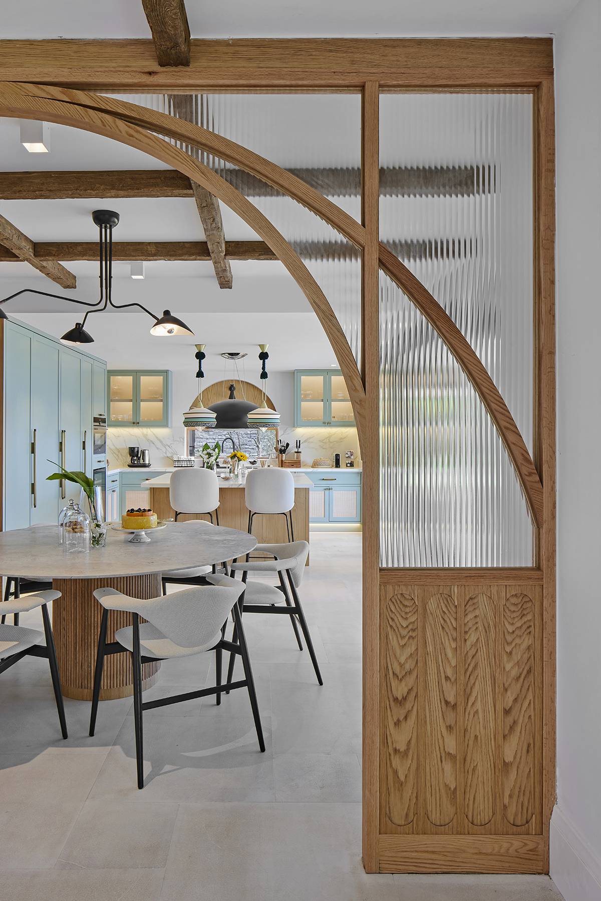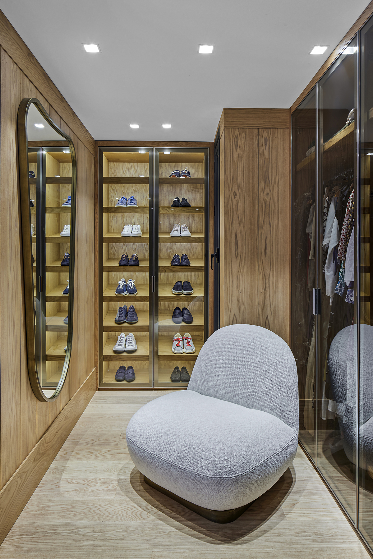A custom oak and Italian glass partition gently defines the kitchen and living areas, while bronze and smoked mirrors enhance light and spatial depth.