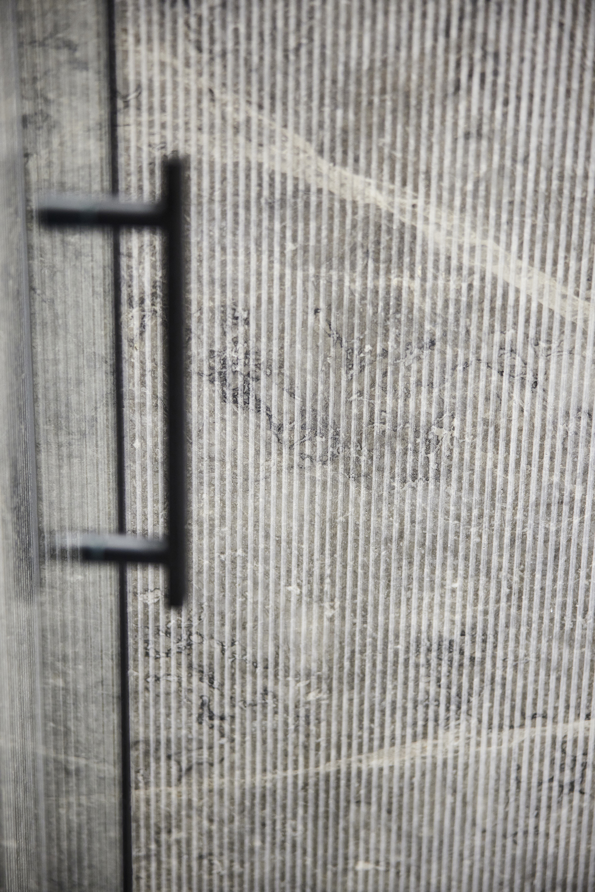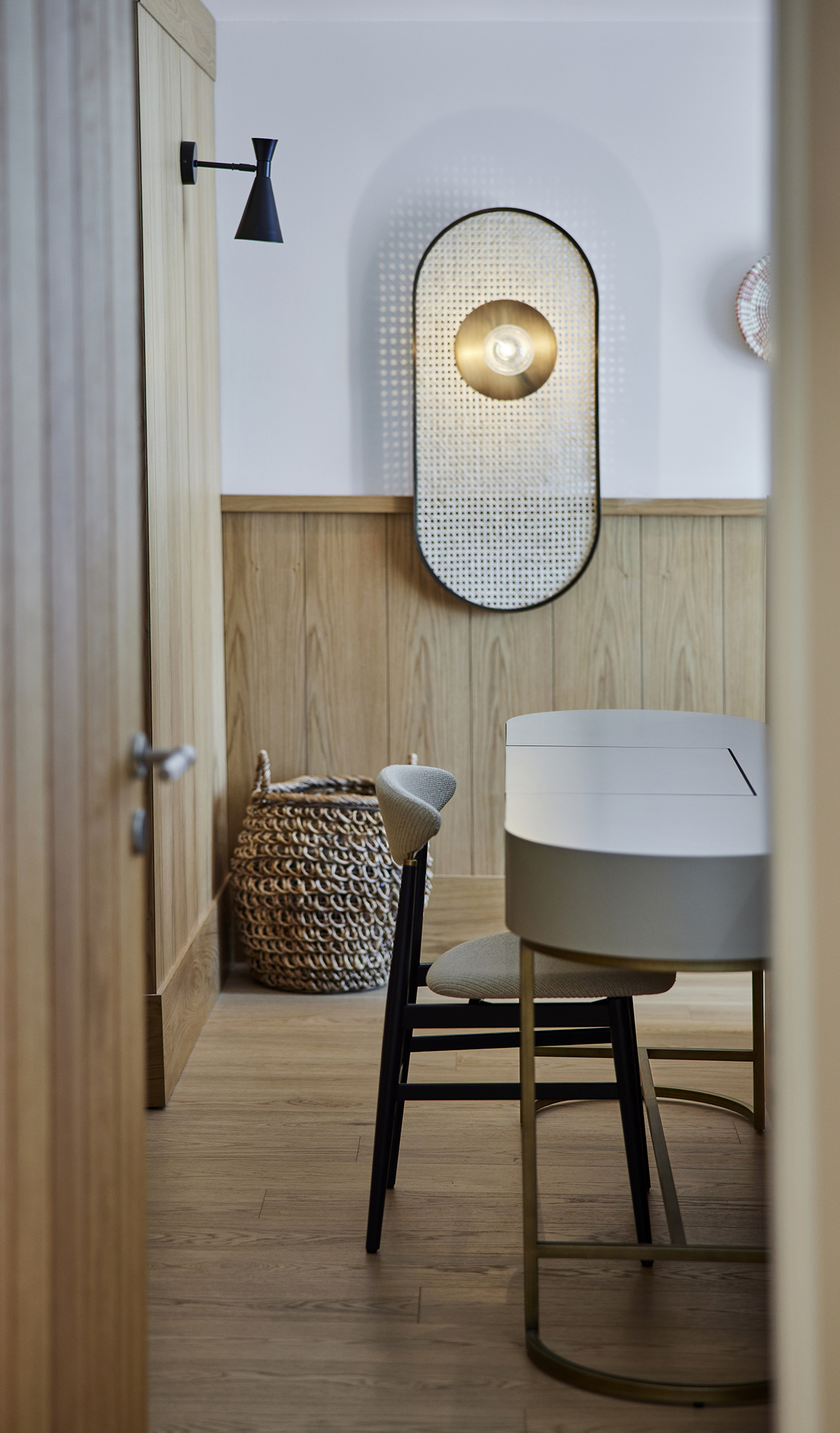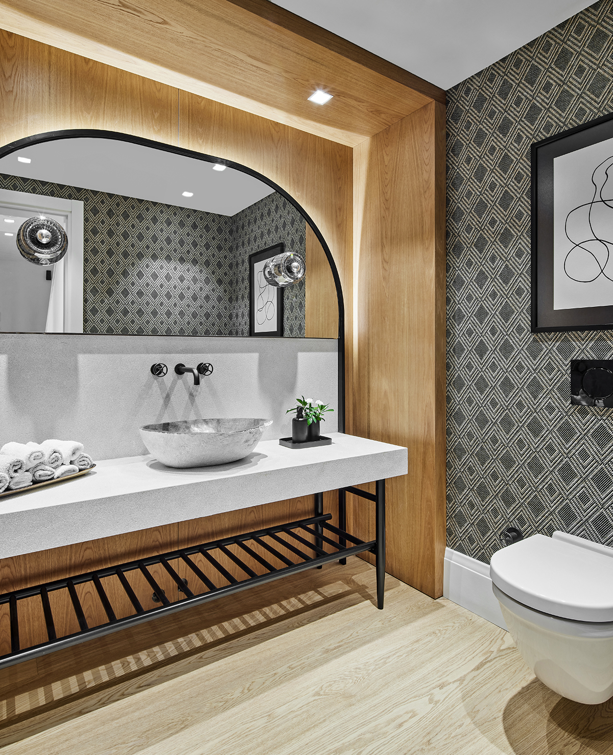 A custom oak and Italian glass partition gently defines the kitchen and living areas, while bronze and smoked mirrors enhance light and spatial depth.