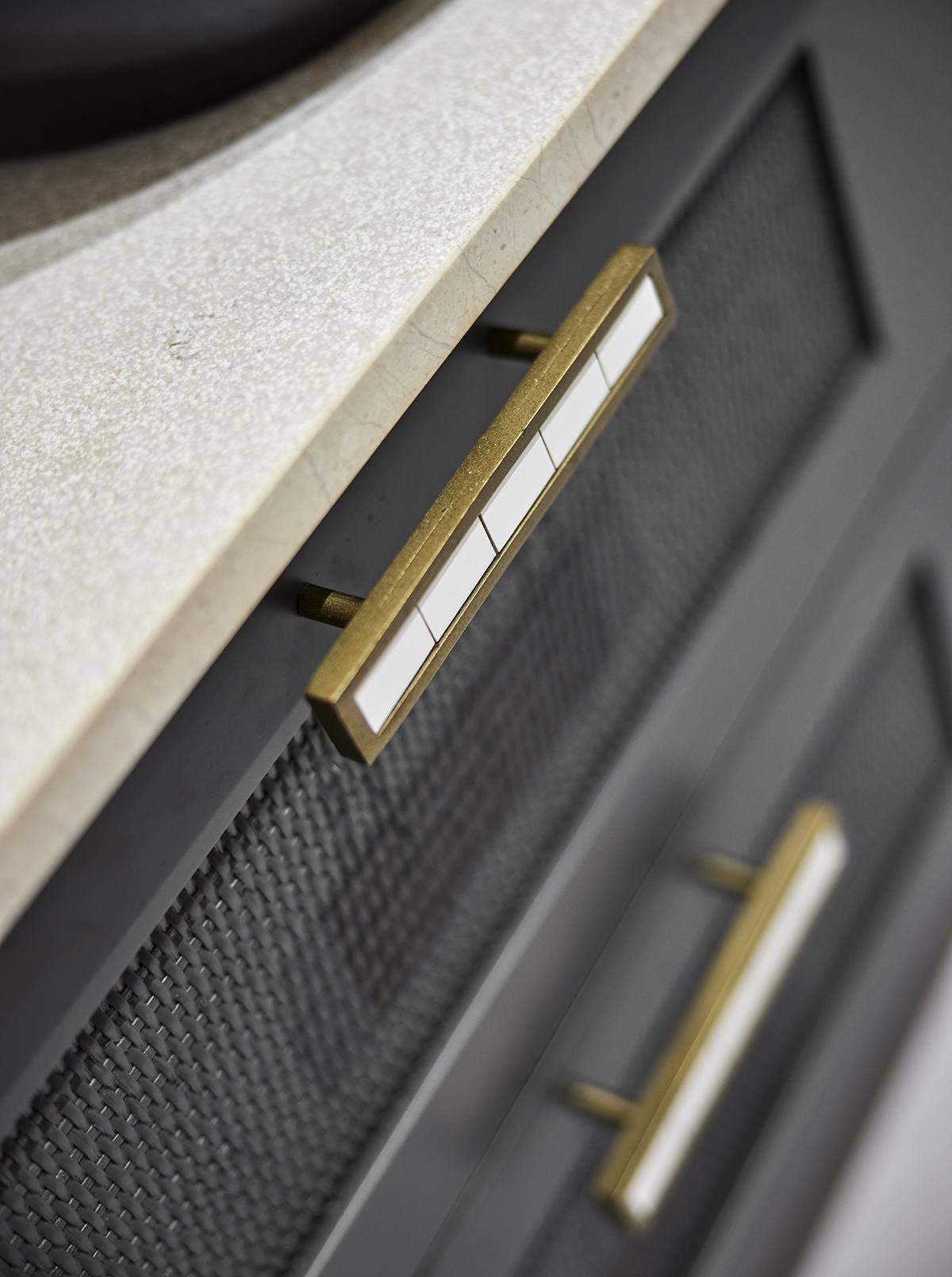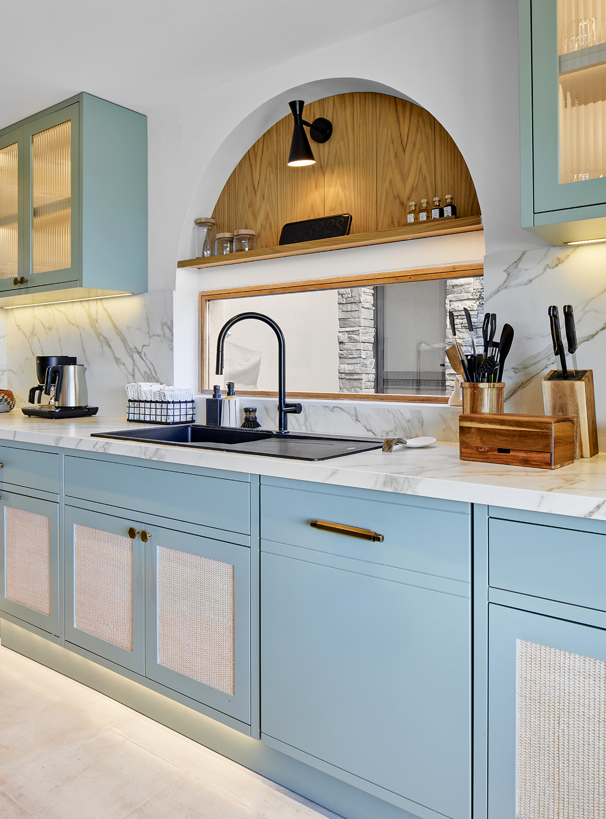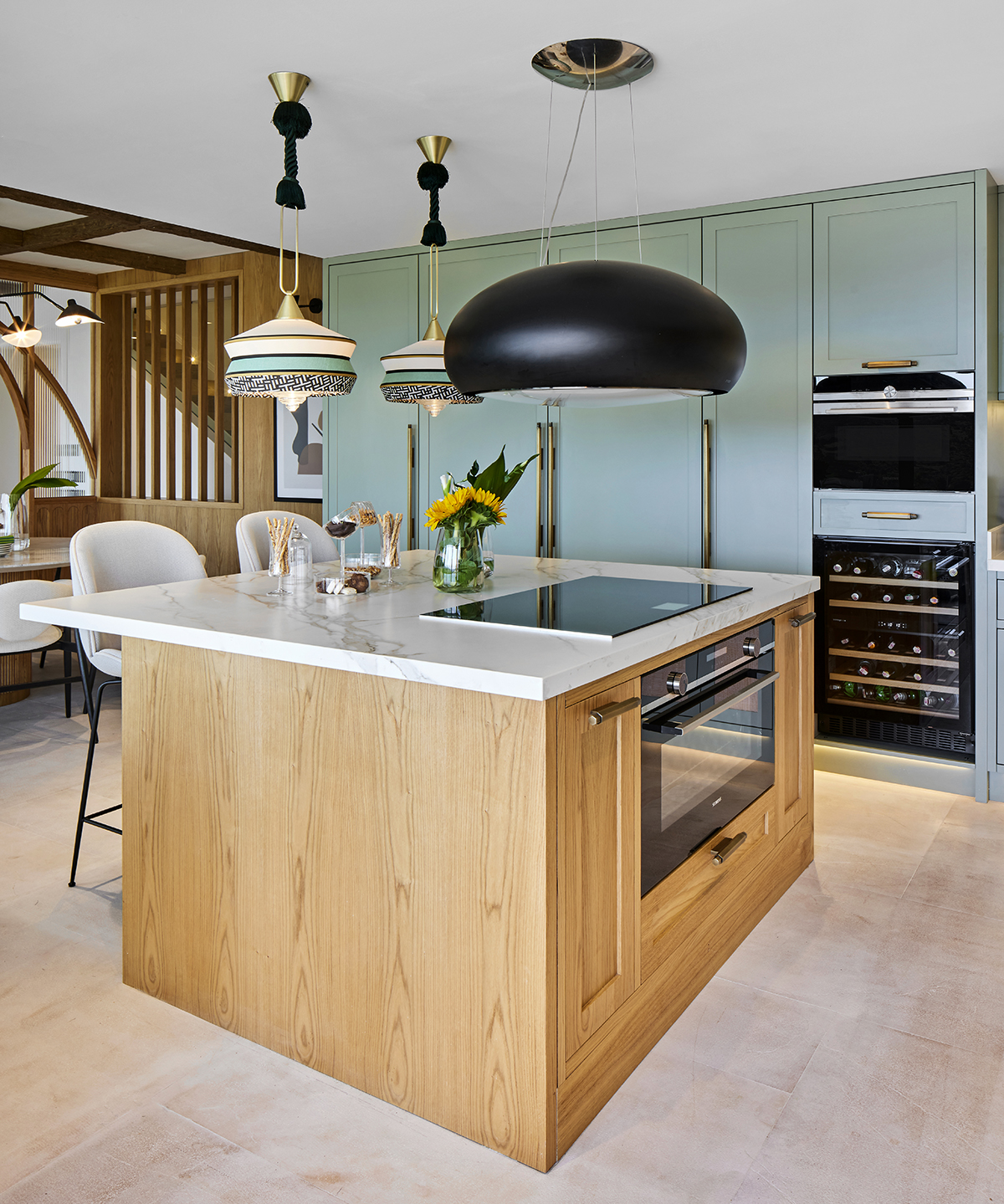 A palette of light oak, lacquered surfaces, and natural stone forms the base of the interior, enriched with subtle mint and orange accents that reflect the spirit of summer.
