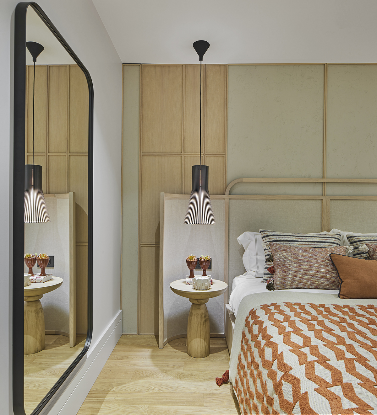 The interior concept is built around a soft palette of neutral tones and natural materials.