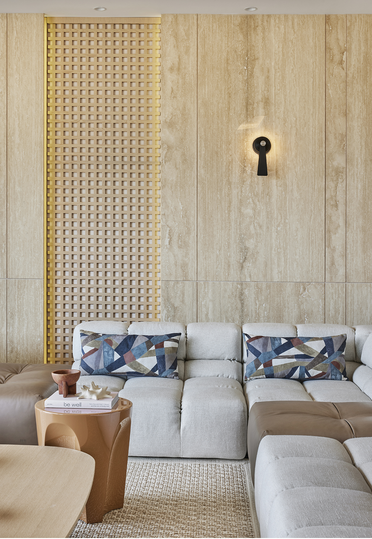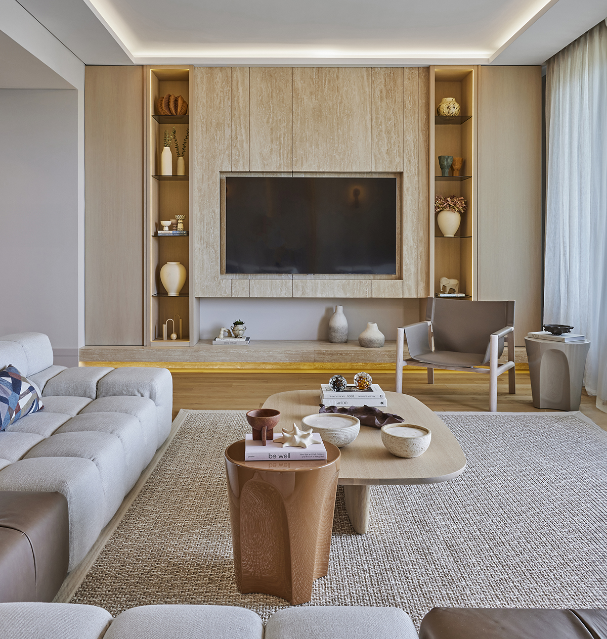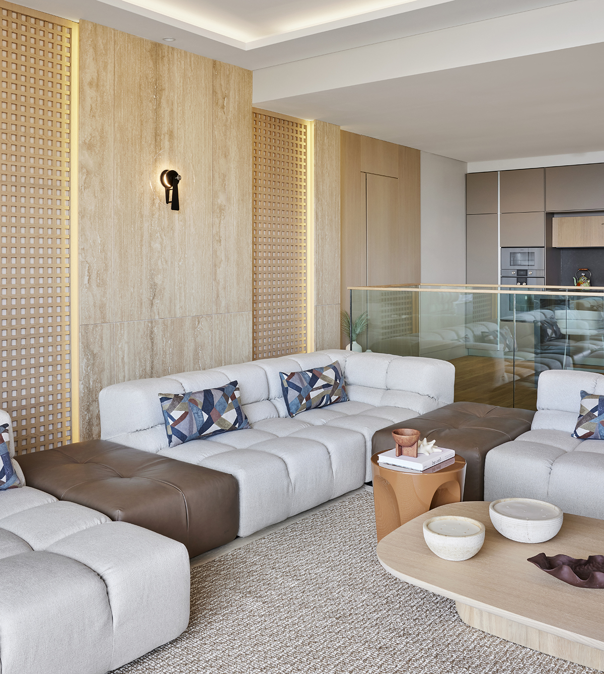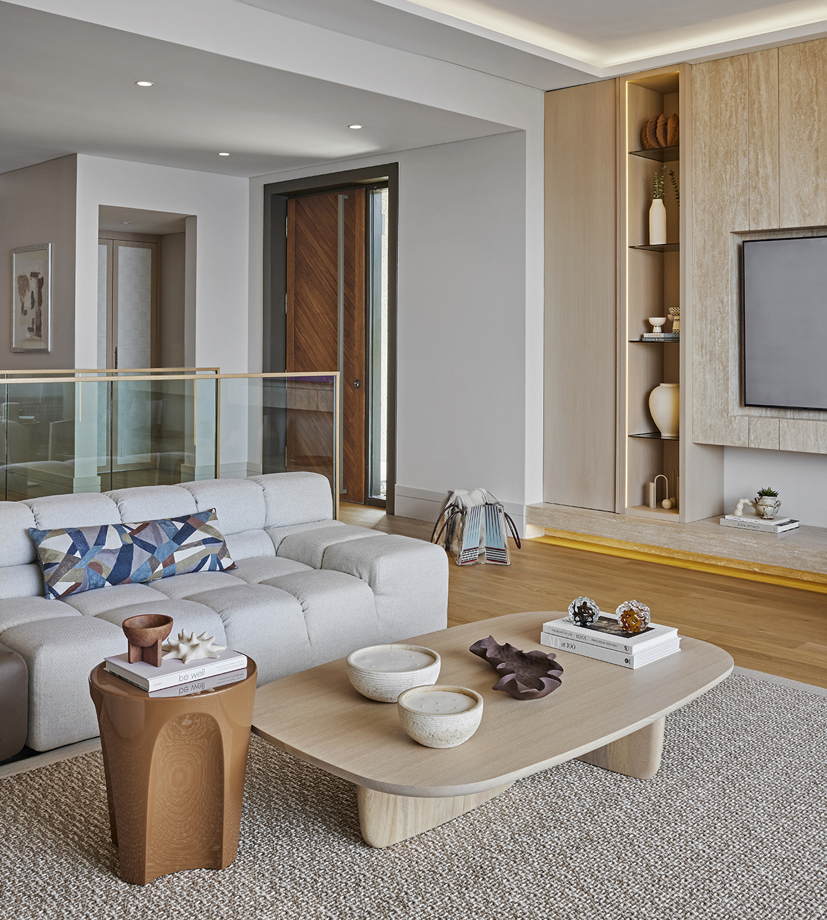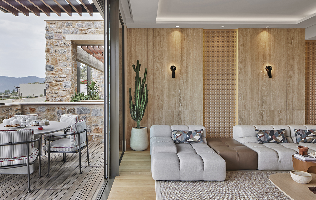 Travertine and light oak create a serene backdrop, while linen textiles and layered lighting enhance the sense of openness and comfort.