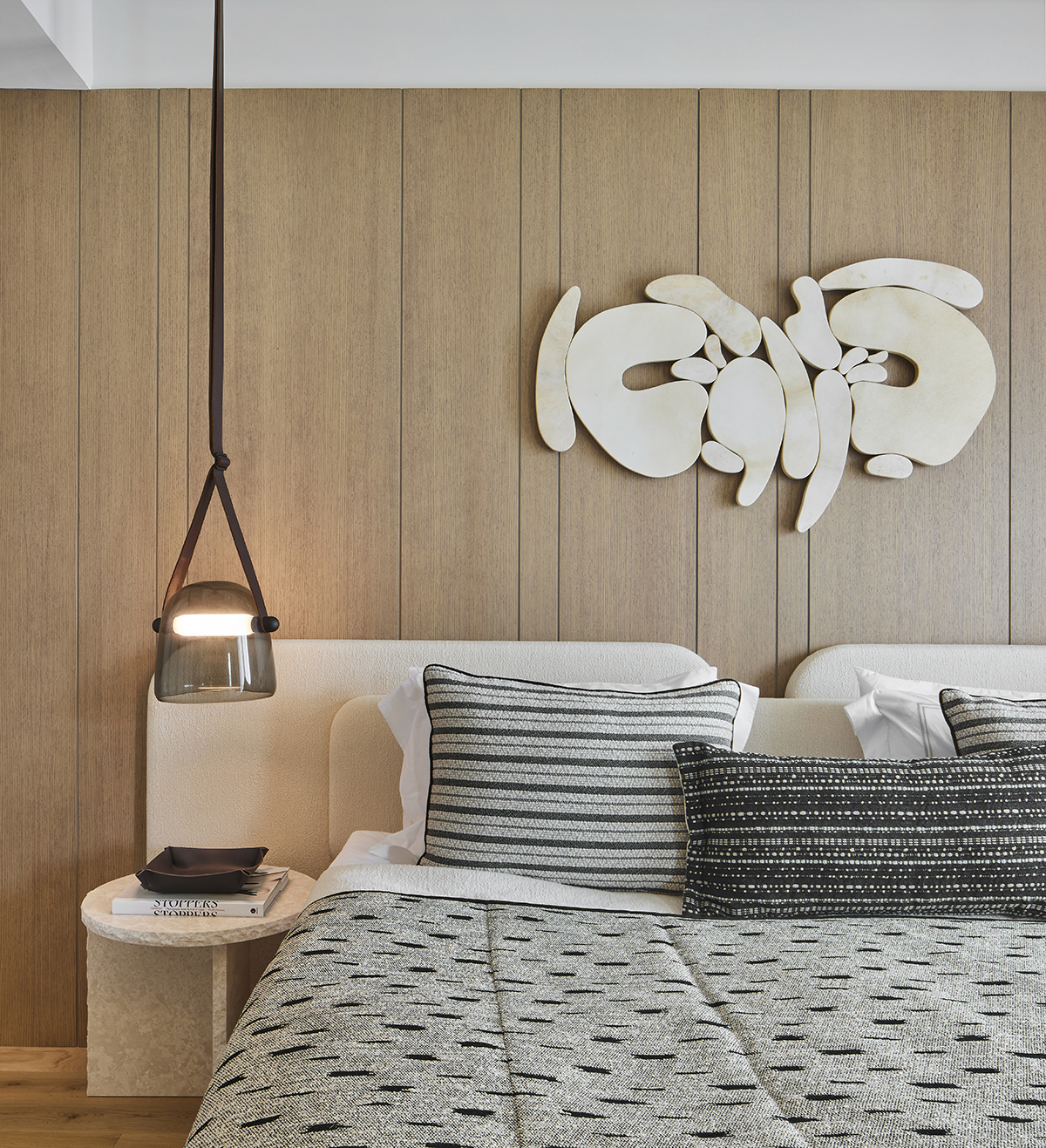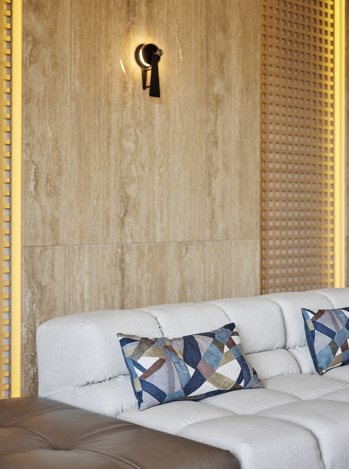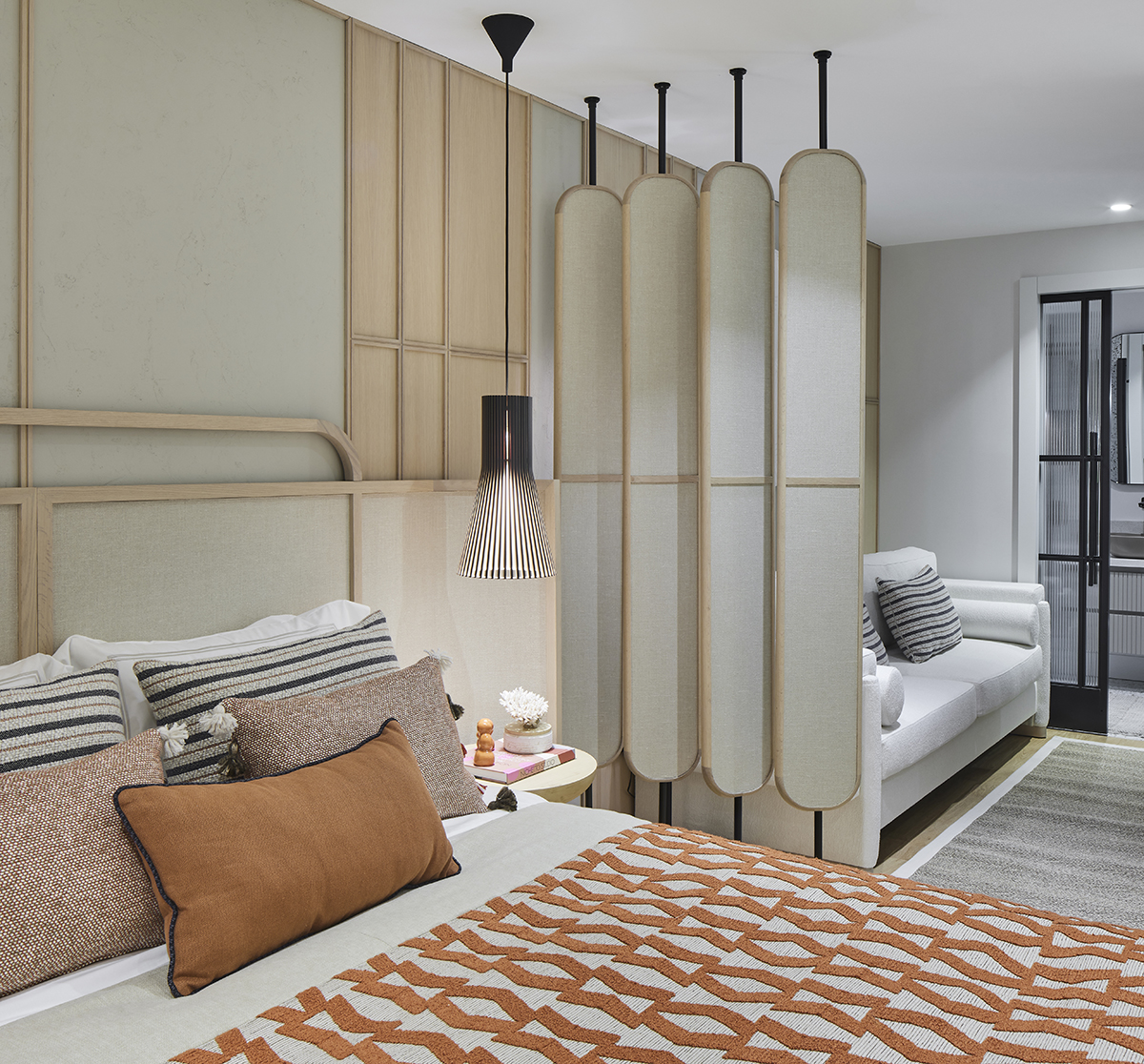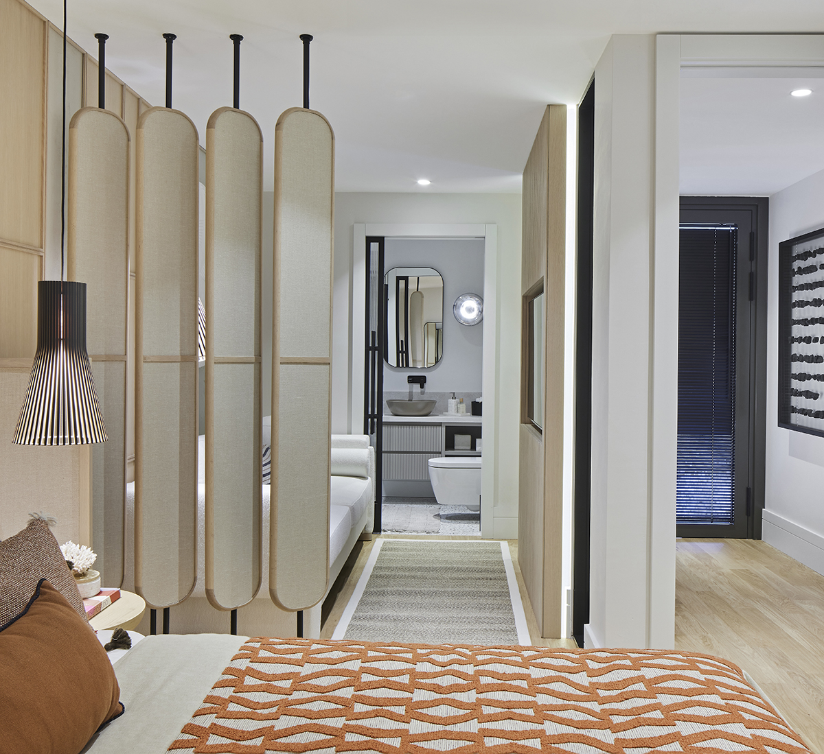 Travertine and light oak create a serene backdrop, while linen textiles and layered lighting enhance the sense of openness and comfort.
