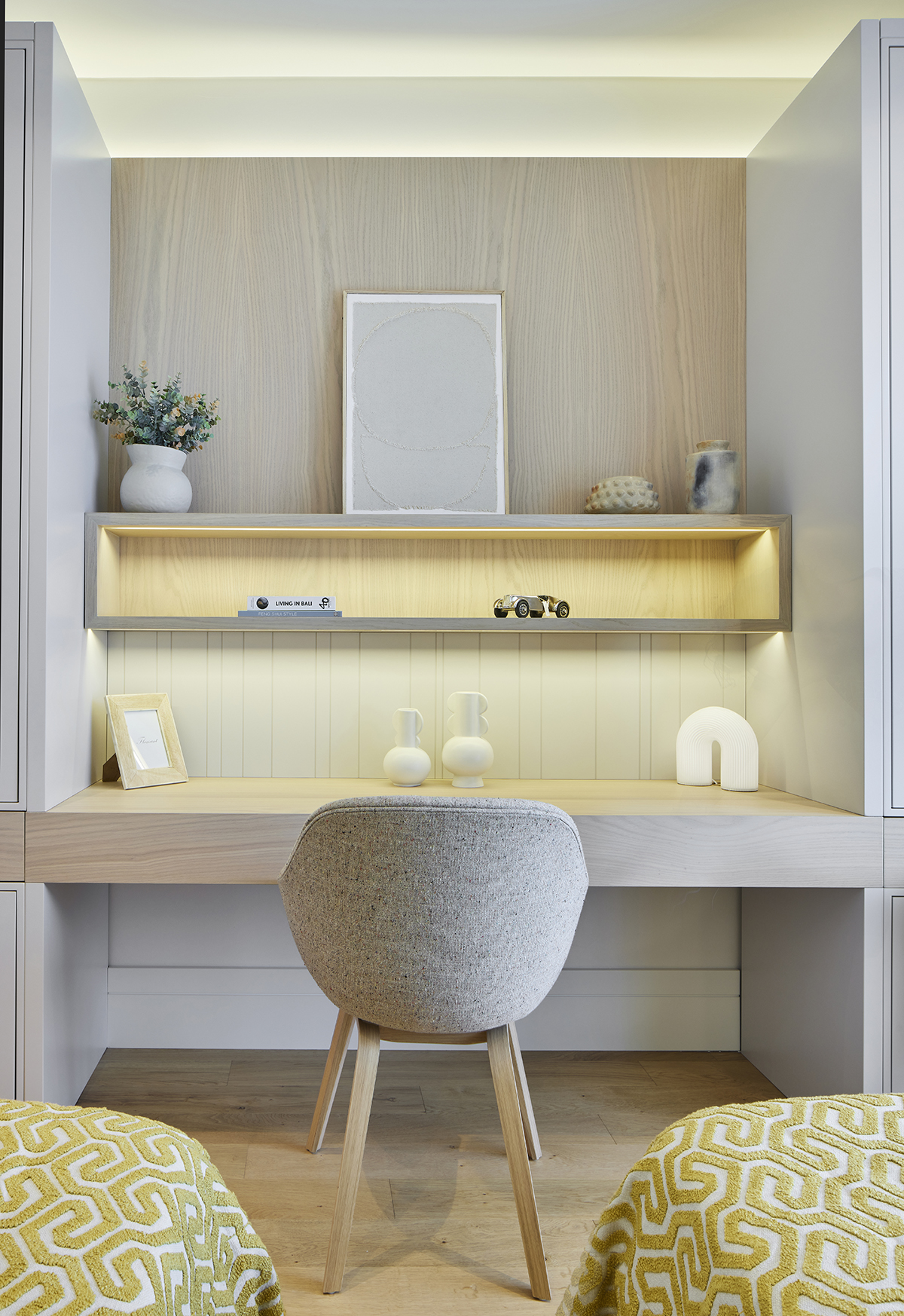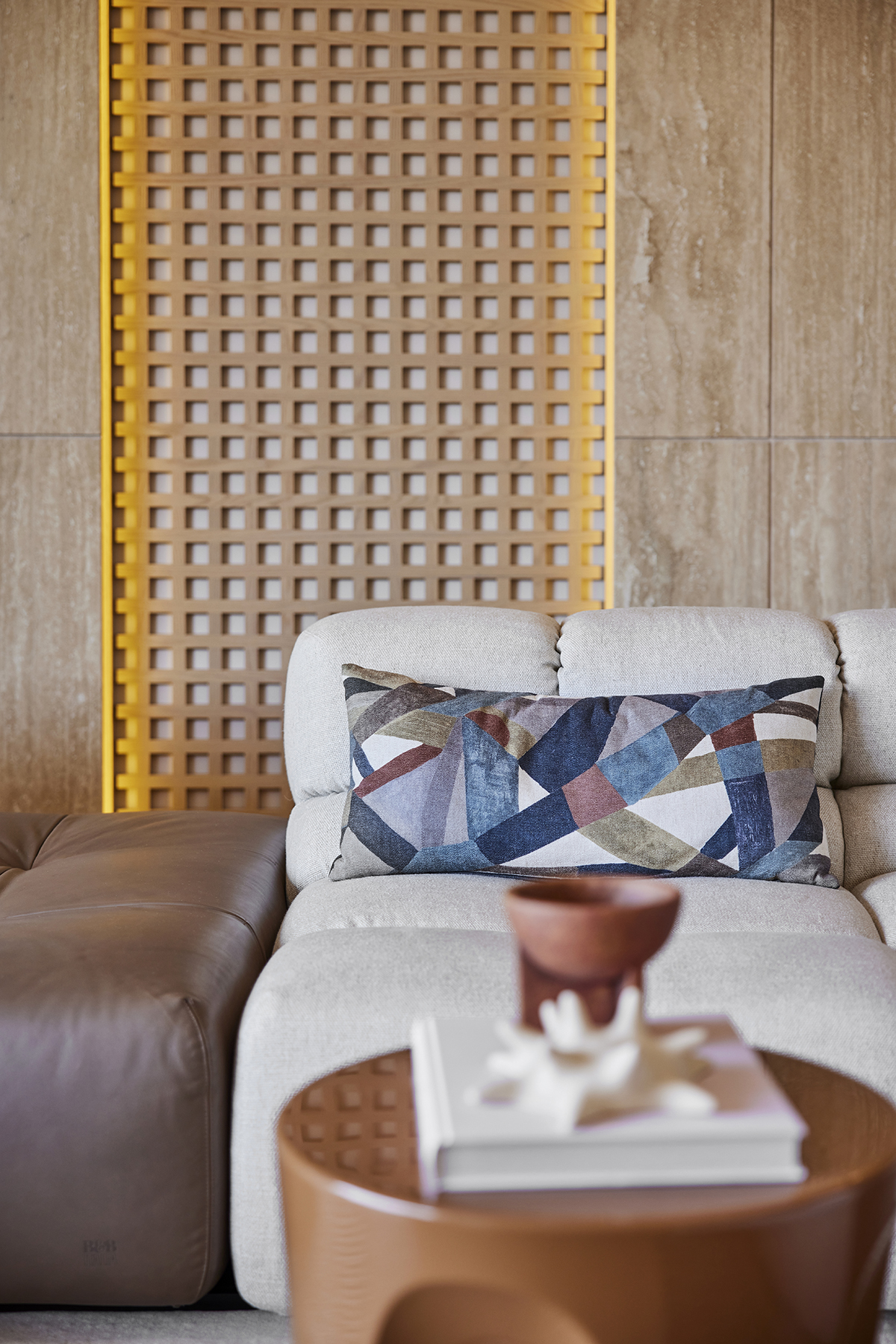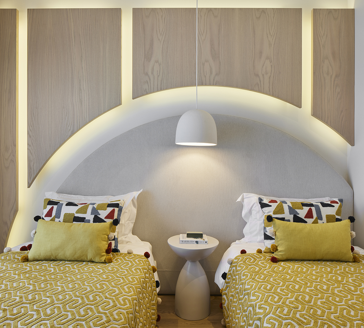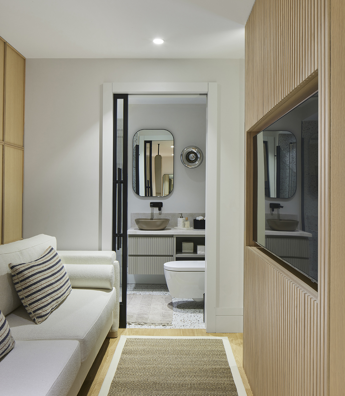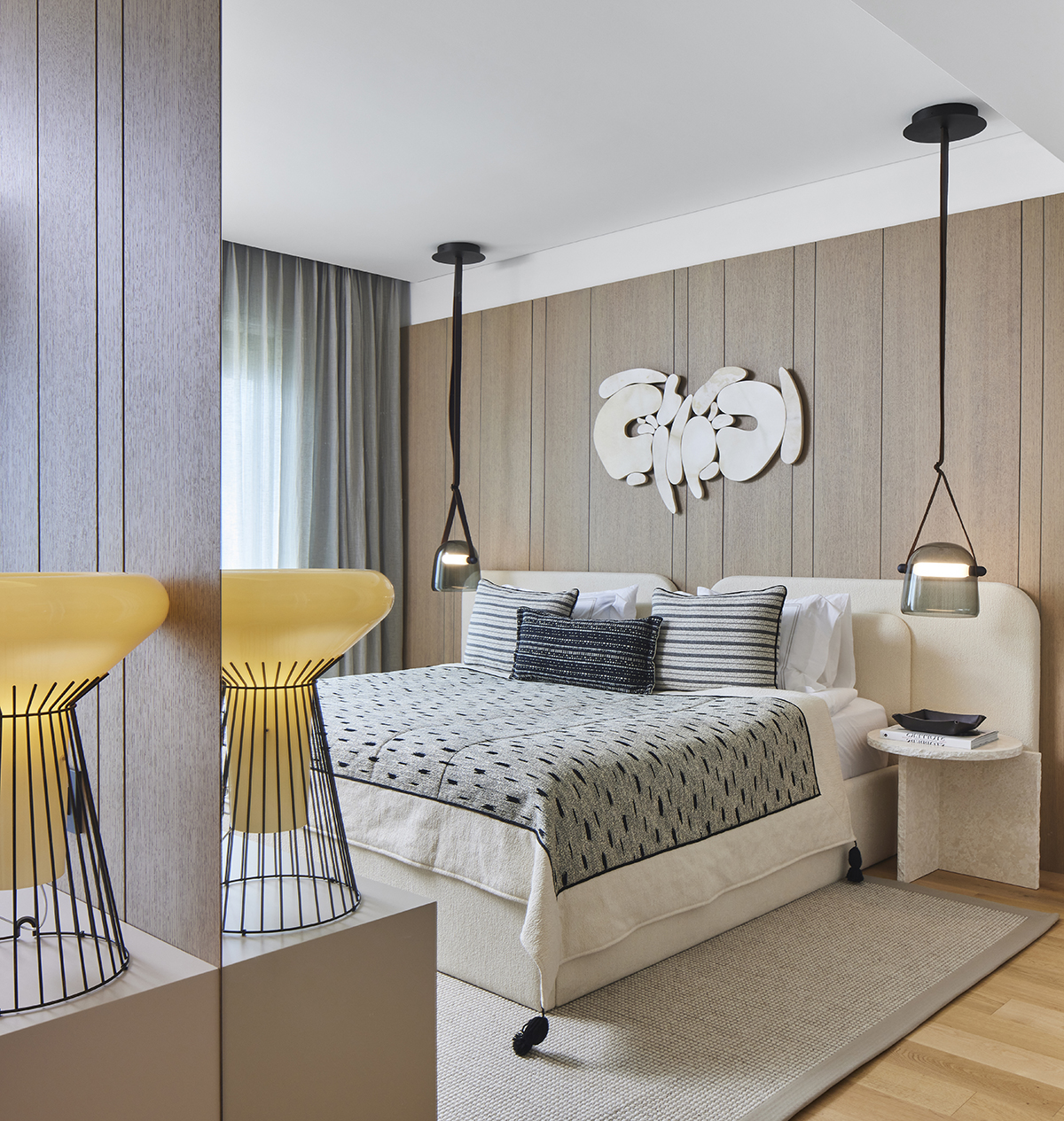 Travertine and light oak create a serene backdrop, while linen textiles and layered lighting enhance the sense of openness and comfort.